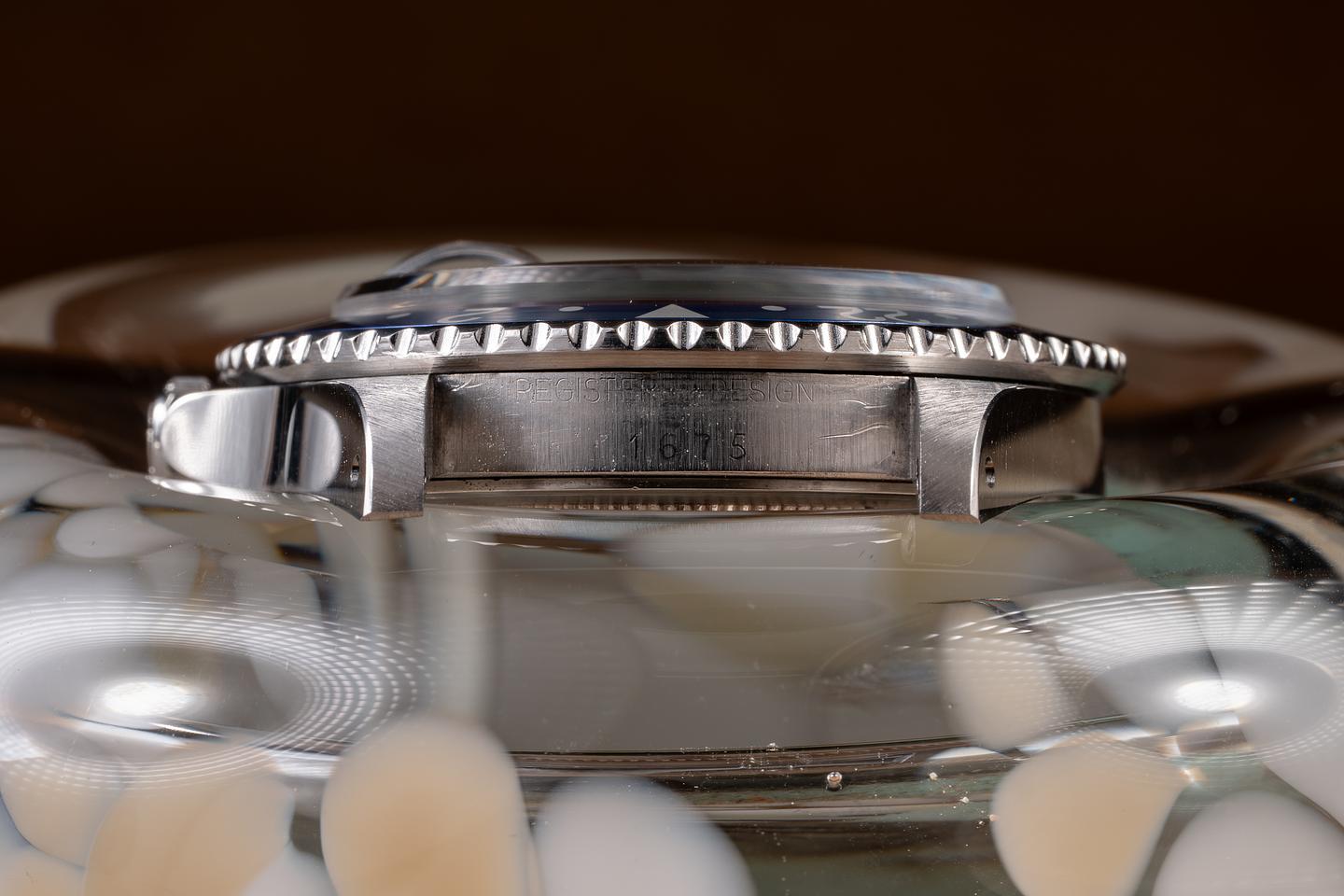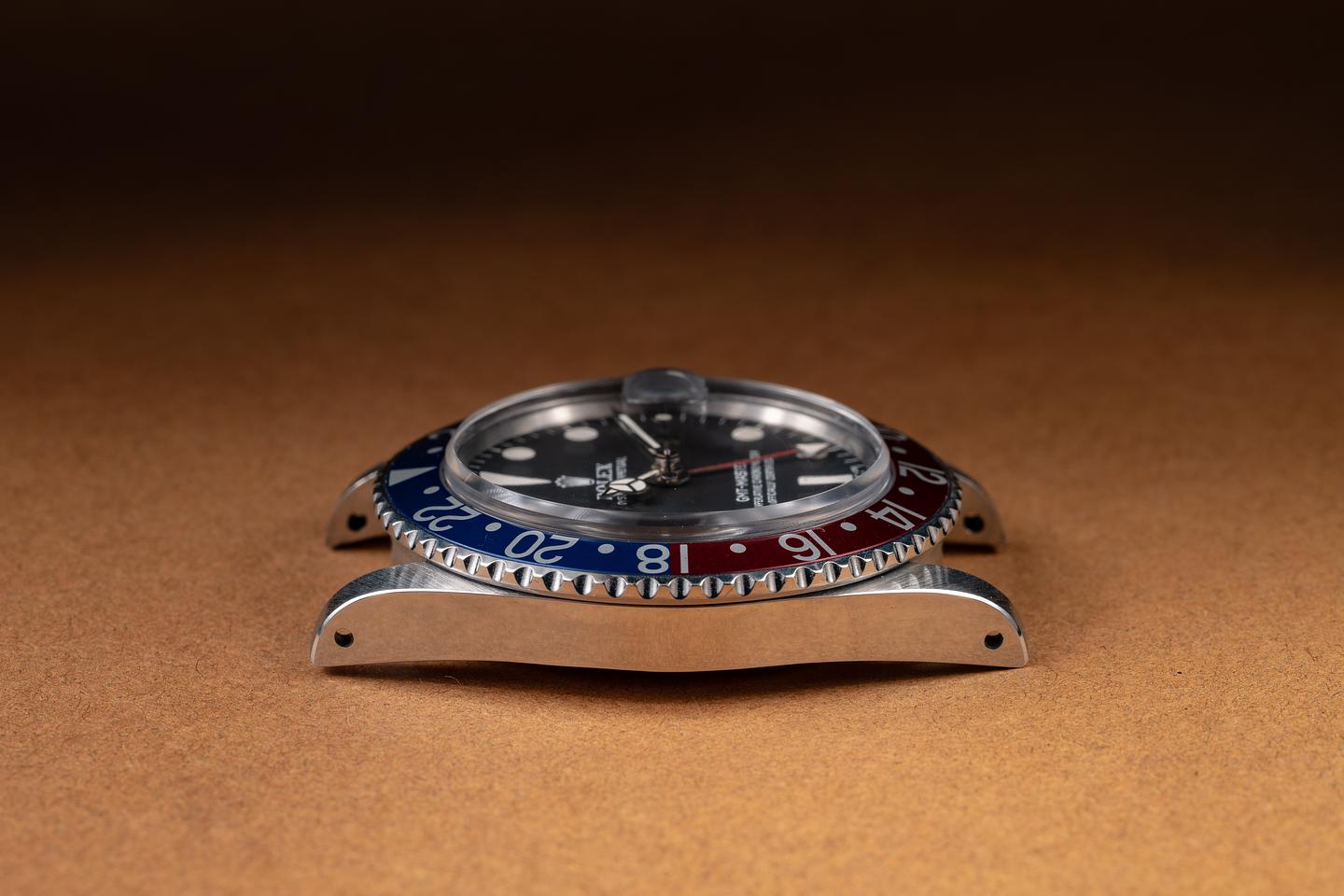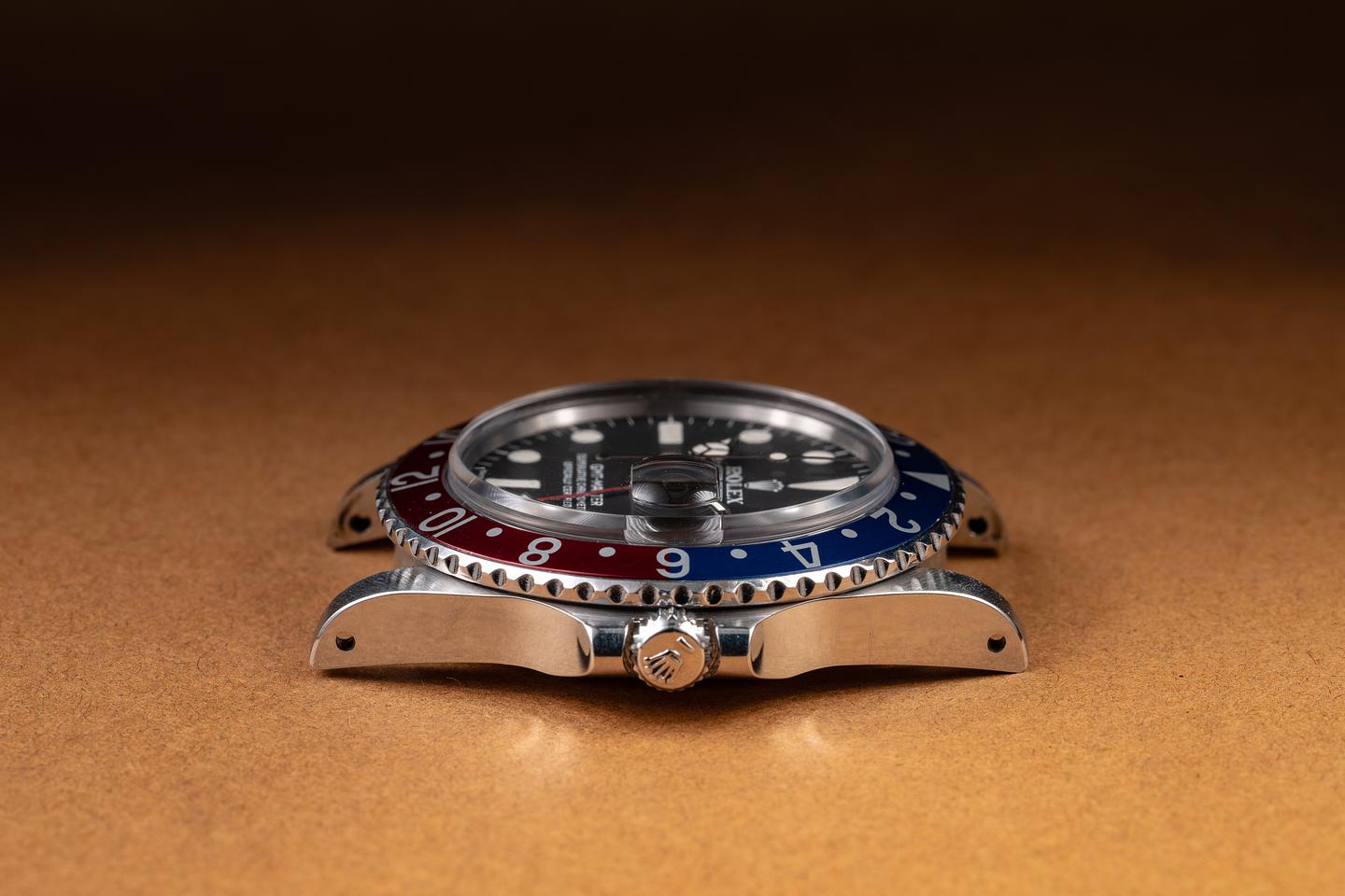 Case: The previously polished case is excellent, showing sharp bevels and only light wear from use. The blue and red "Pepsi" bezel insert is also in excellent condition, showing only light wear from use.