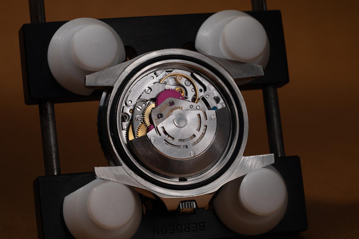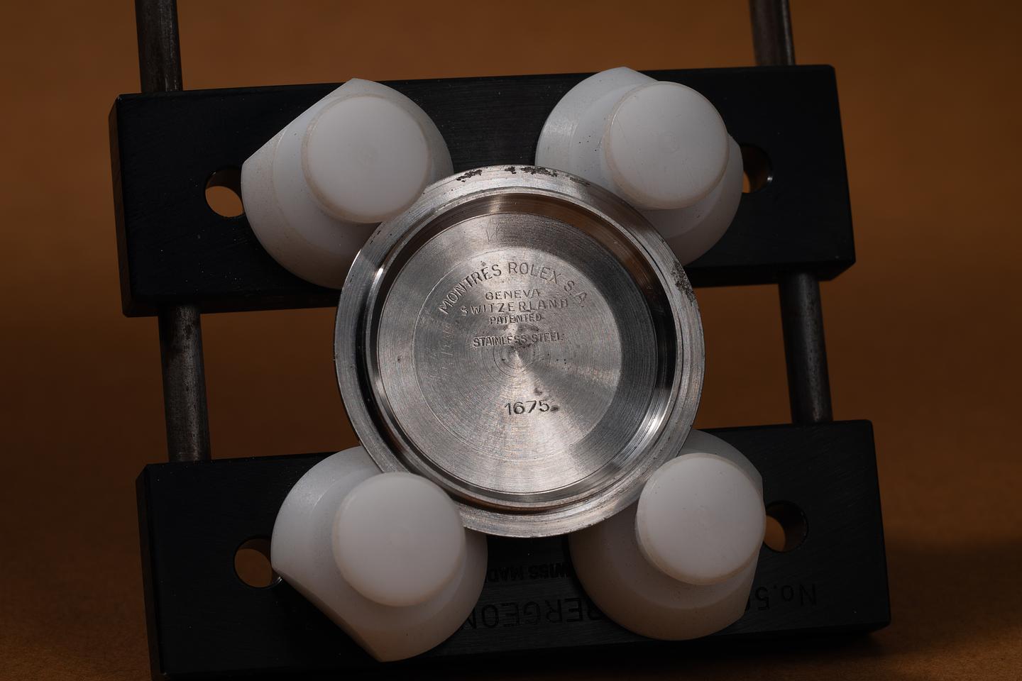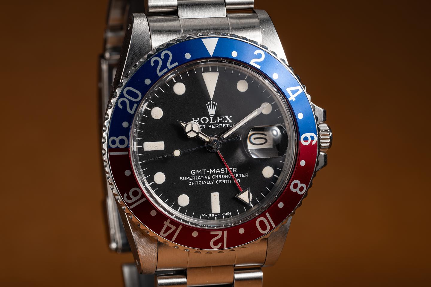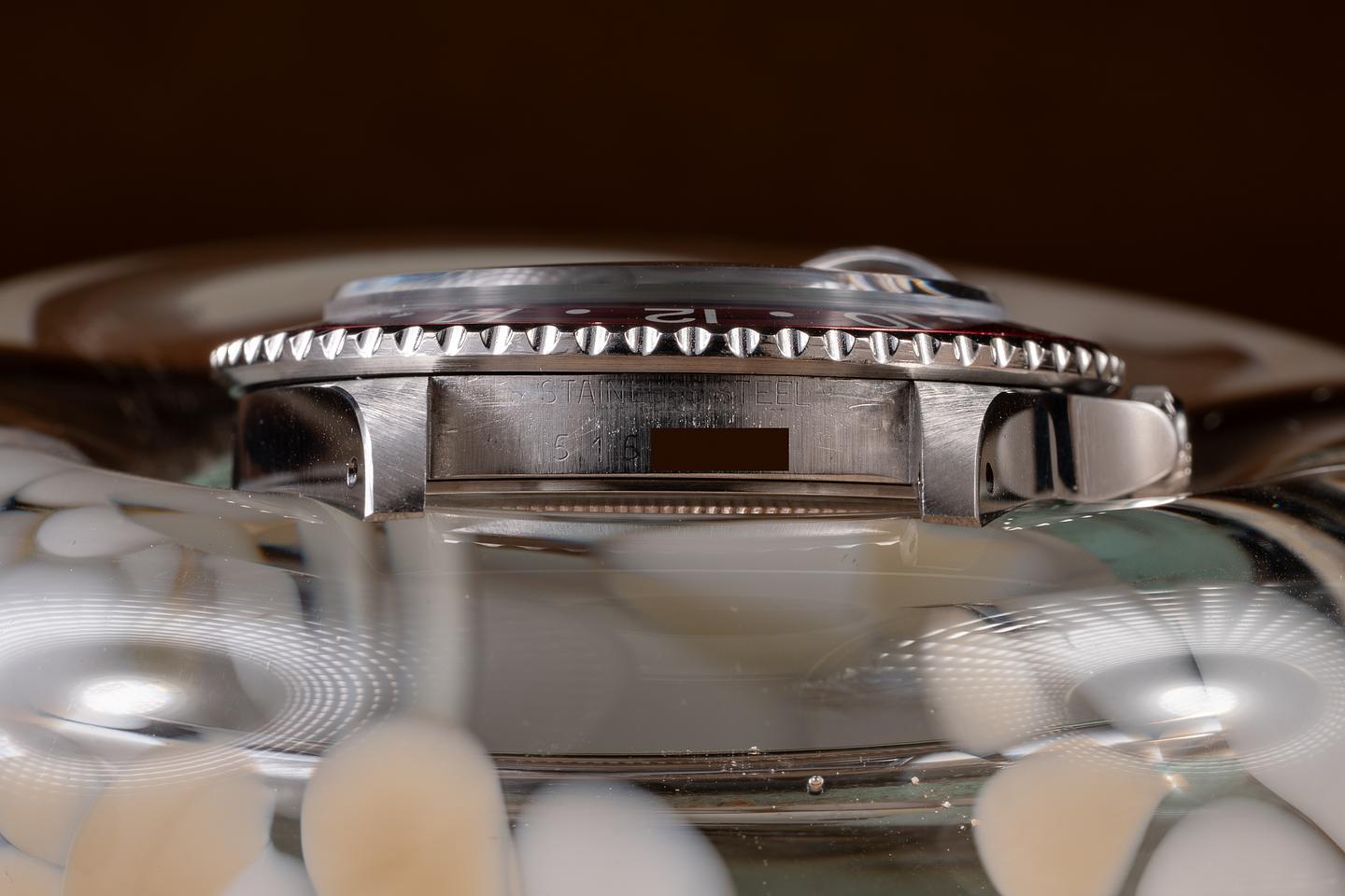Case: The previously polished case is excellent, showing sharp bevels and only light wear from use. The blue and red "Pepsi" bezel insert is also in excellent condition, showing only light wear from use.