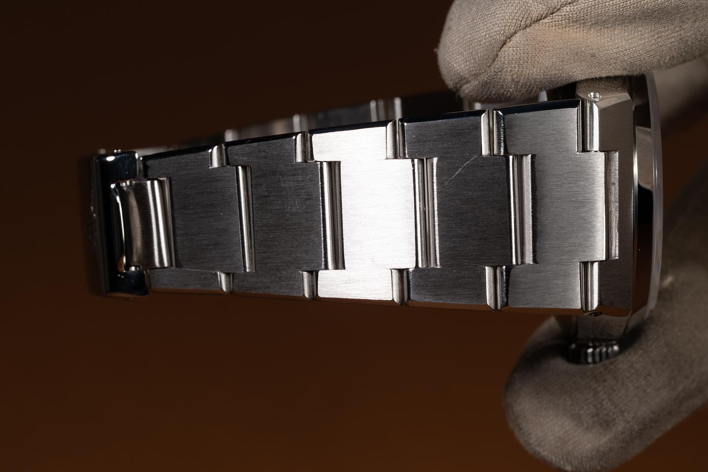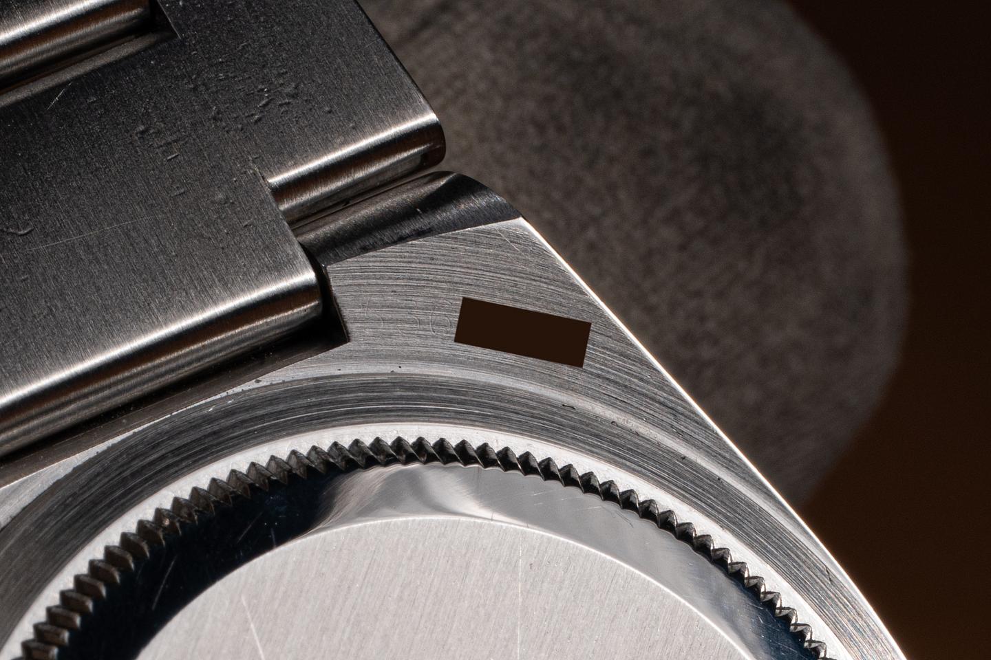 Case: The thick, even case is excellent, showing sharp, prominent beveling and only very light wear. The smooth stainless bezel is also in excellent condition, showing only very light wear.