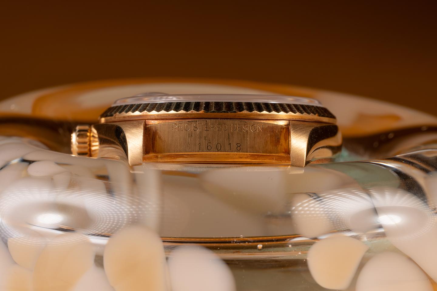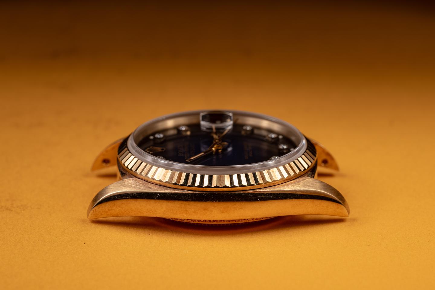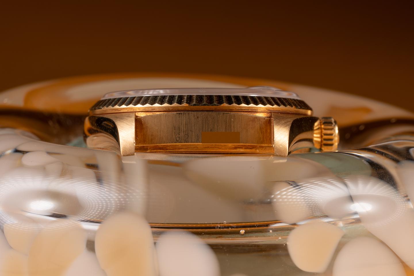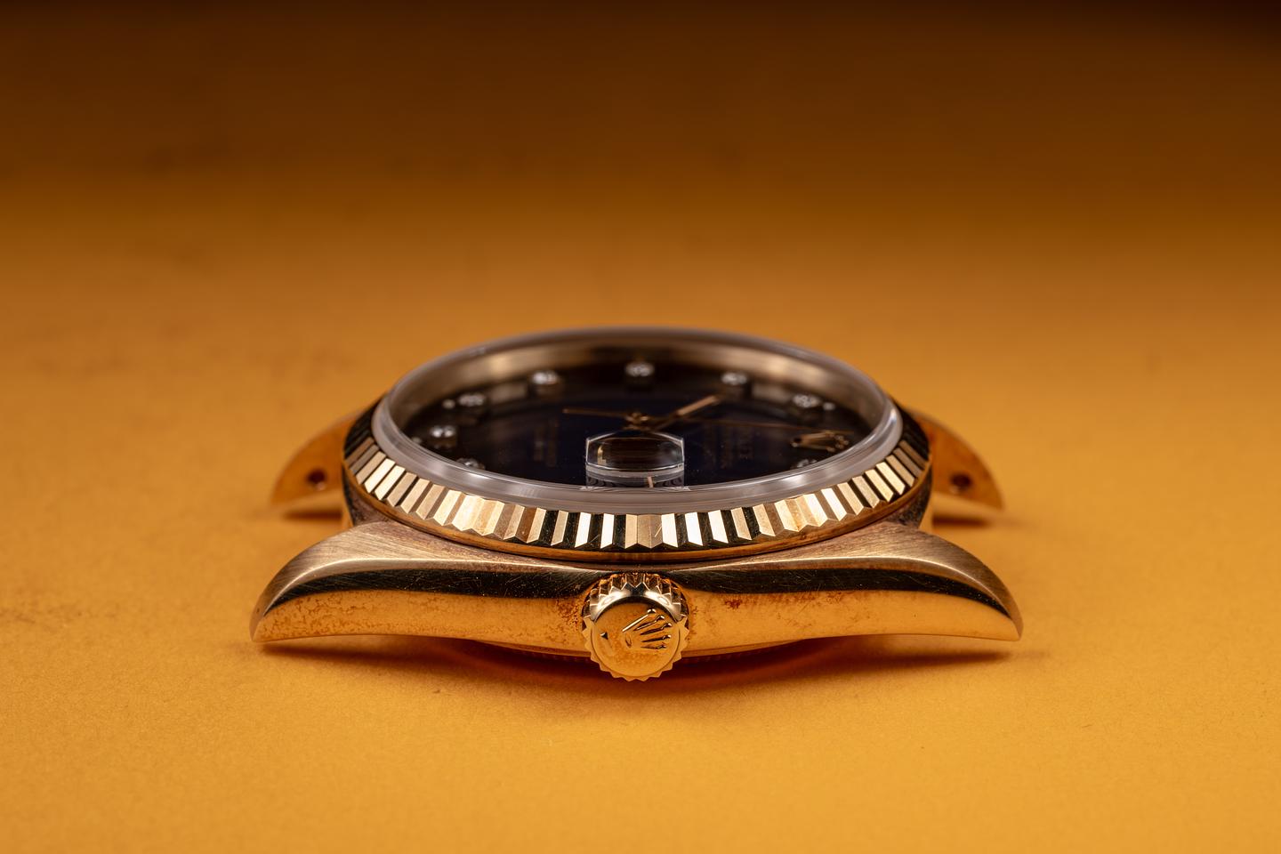 Case: The thick, sharp, and even 18K yellow gold case is in excellent condition showing a warm, rosy patina and only very light wear from use. The sharp 18k yellow gold fluted bezel is also in excellent unpolished condition, showing a warm, rosy patina and only very light wear.