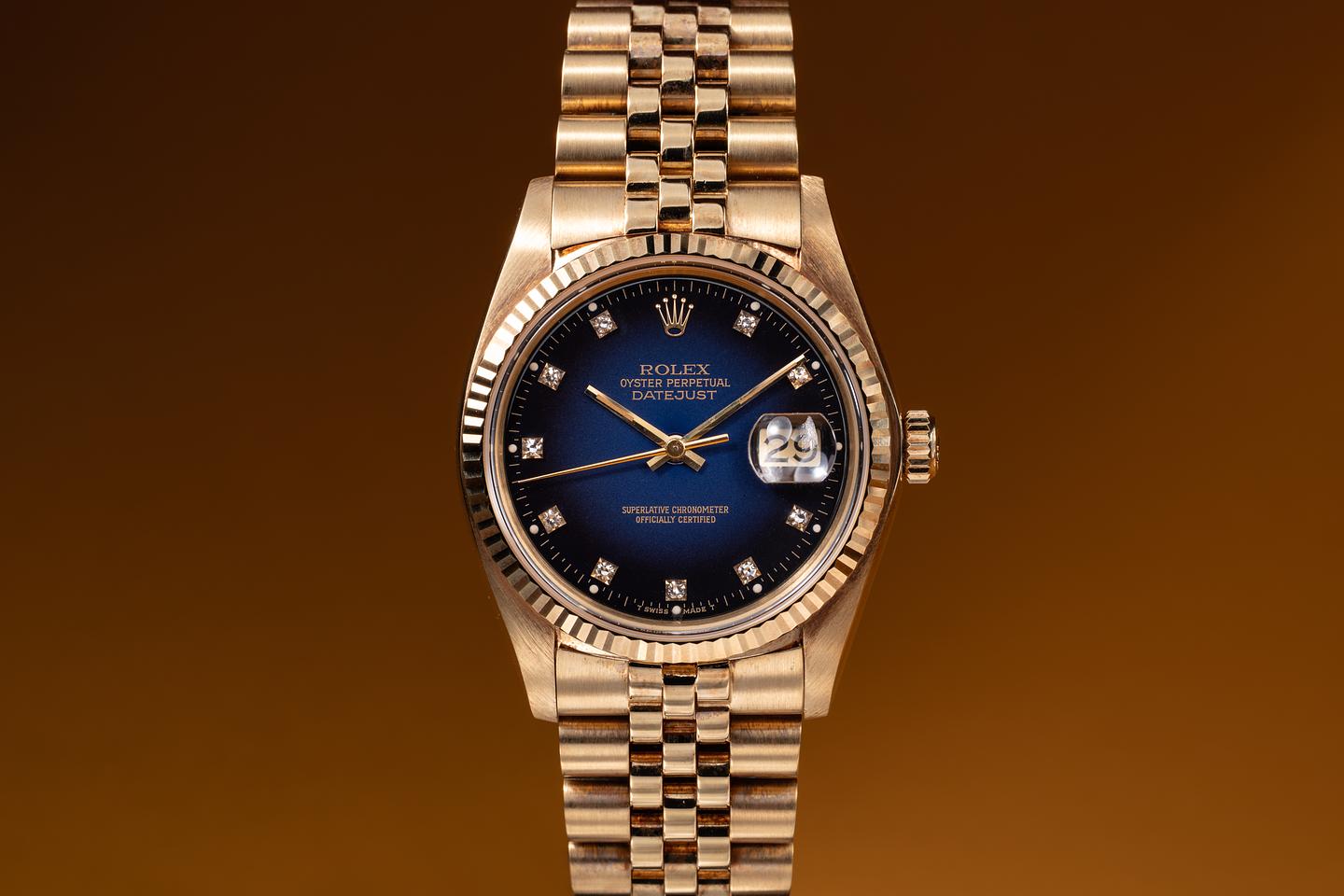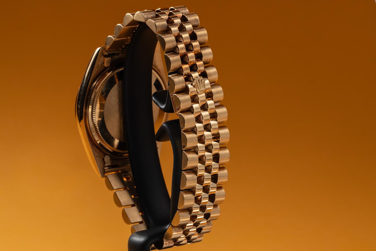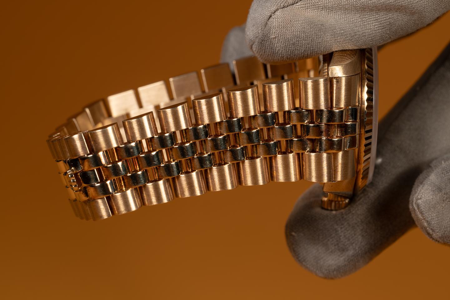 Bracelet: The 22-link 18K yellow gold Jubilee bracelet is excellent, showing only very light stretch for its age.