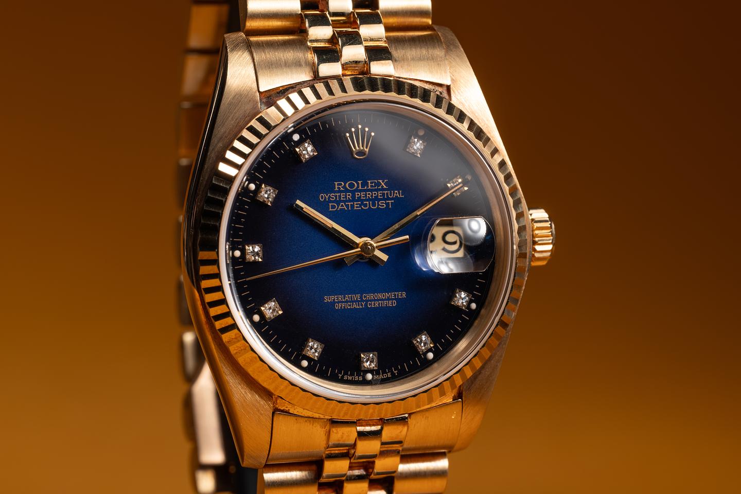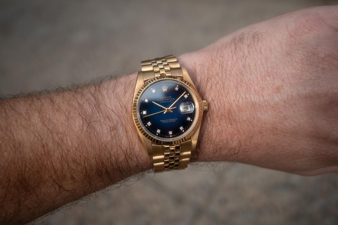 Dial: The blue vignette diamond dial is excellent, showing only very light wear for its age. The lume has aged to a clean, creamy hue, and the hands match perfectly. The 11 o'clock lume plot is missing a portion of its luminous mass.
