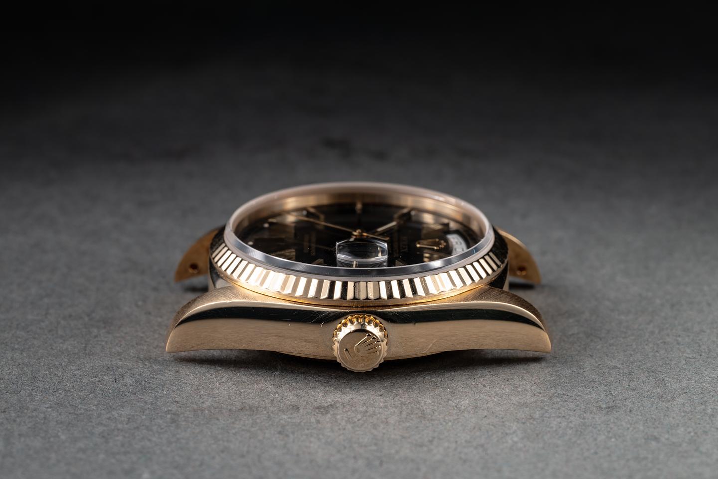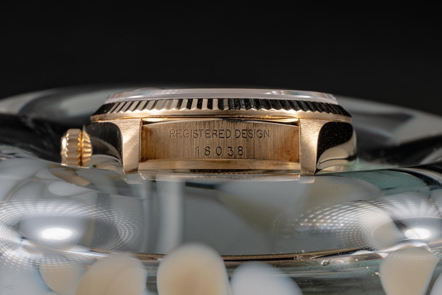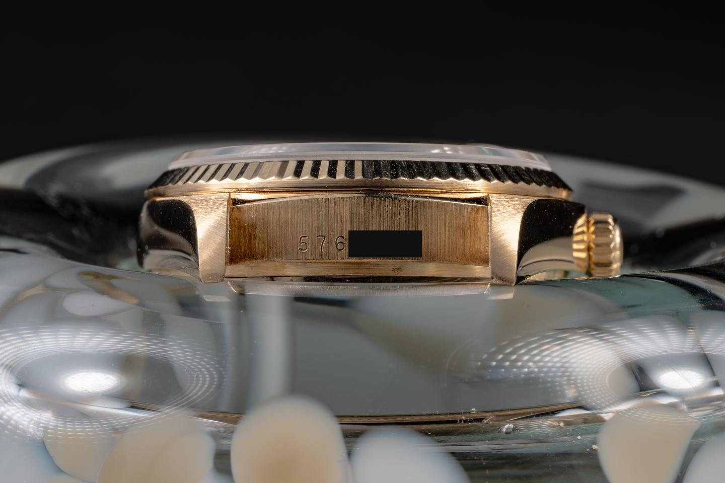 Case: The sharp 18K yellow gold case is excellent, showing only very light wear from use. The sharp 18K yellow gold fluted bezel is also in excellent condition, showing only very light wear from use.