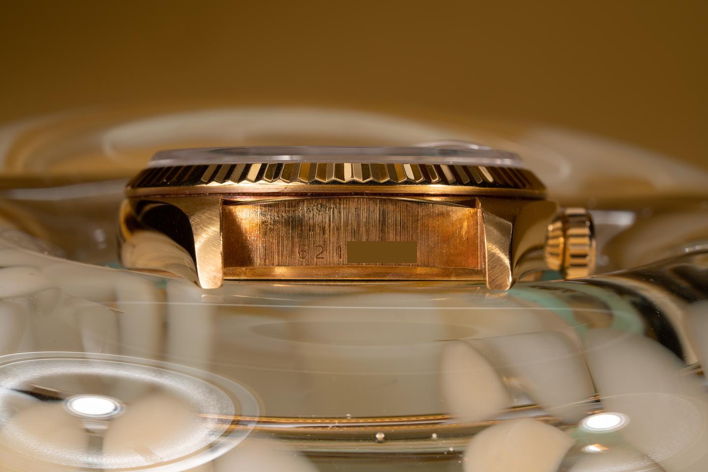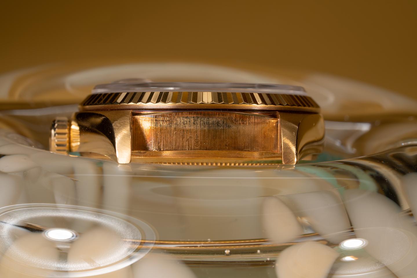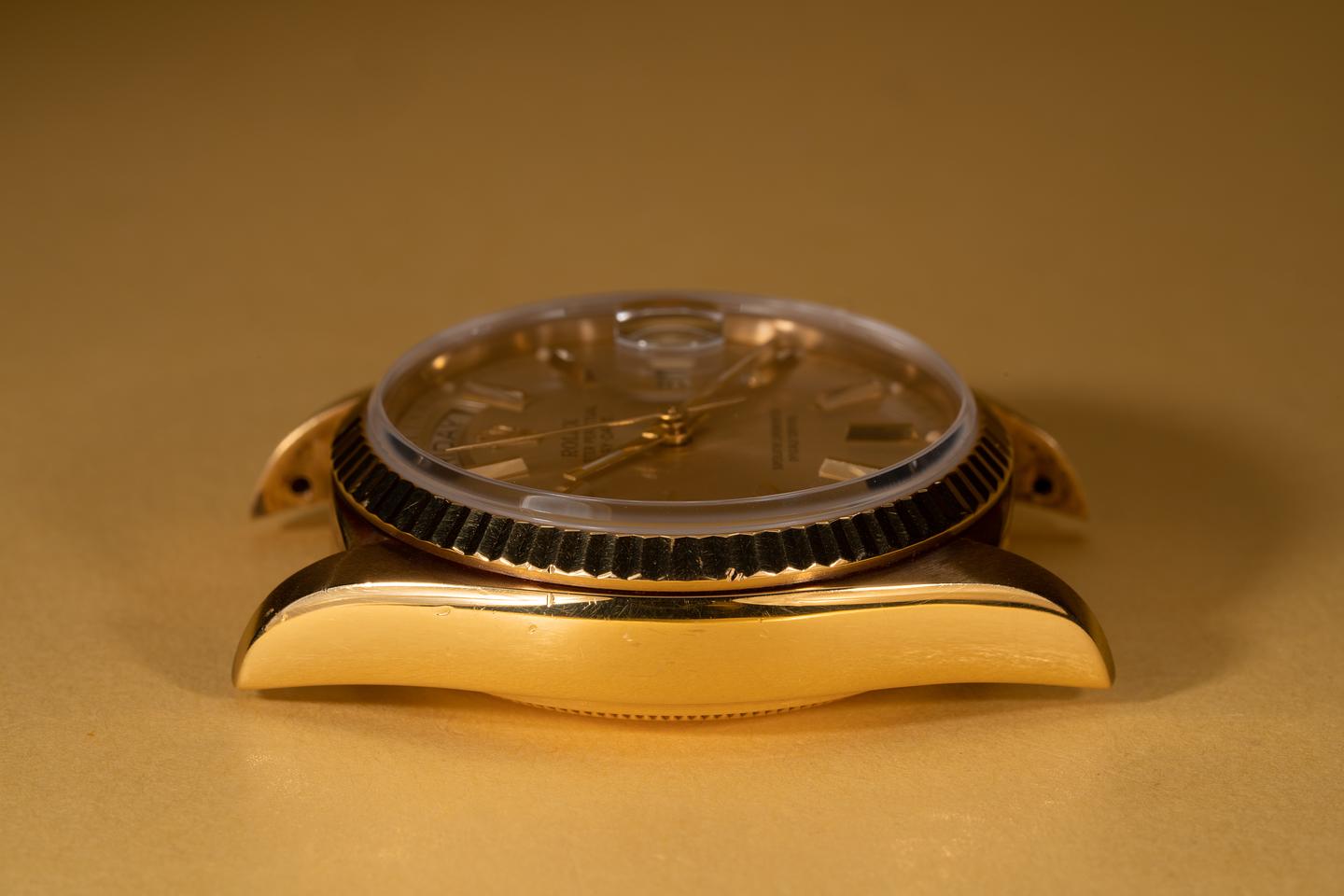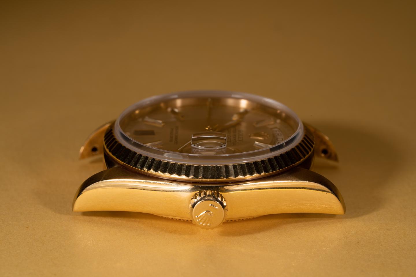 Case: The thick 18k yellow gold case has been polished in the past showing a warm rosy patina and only light wear from use. The sharp 18k fluted bezel is also in excellent condition showing only very light wear from use.