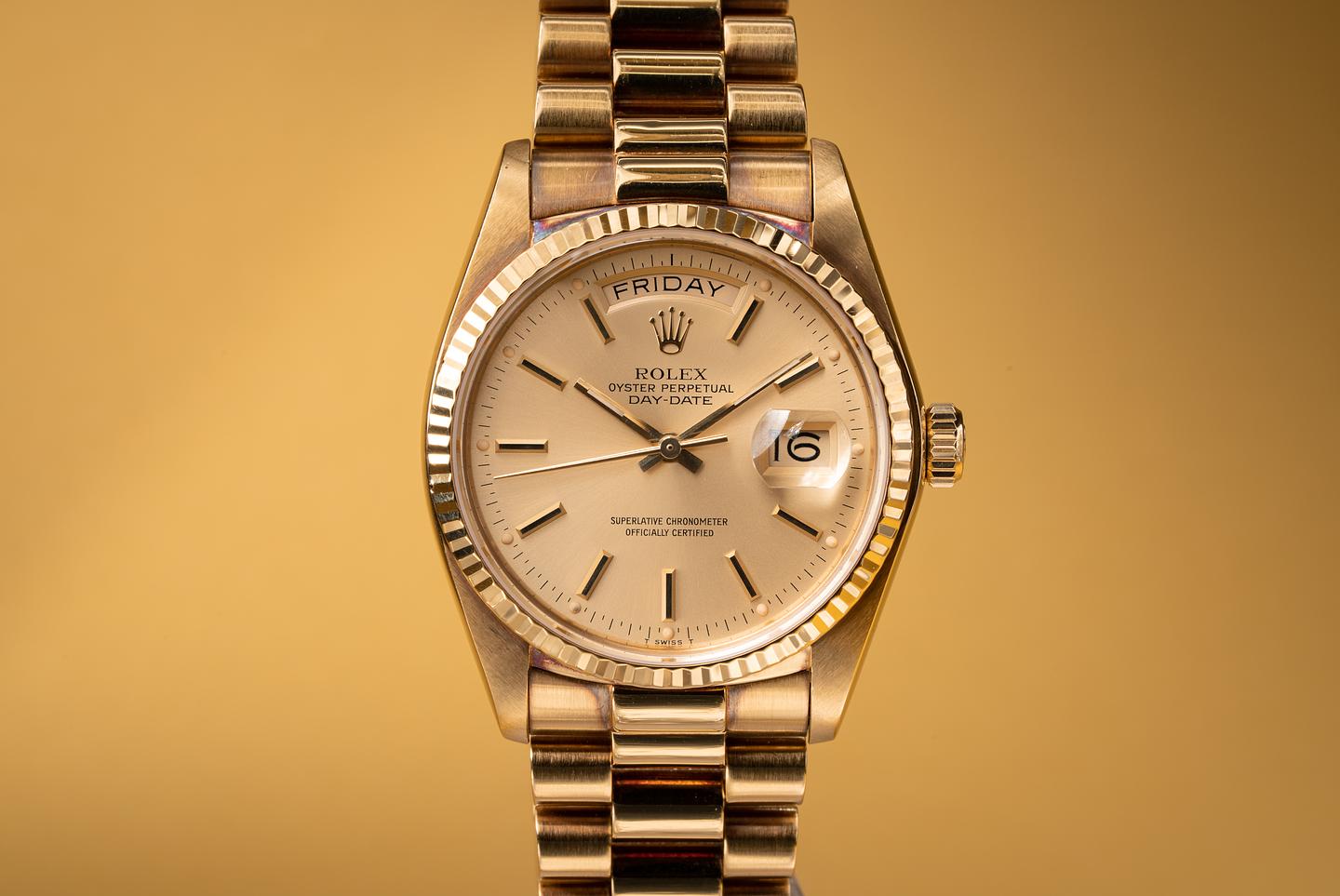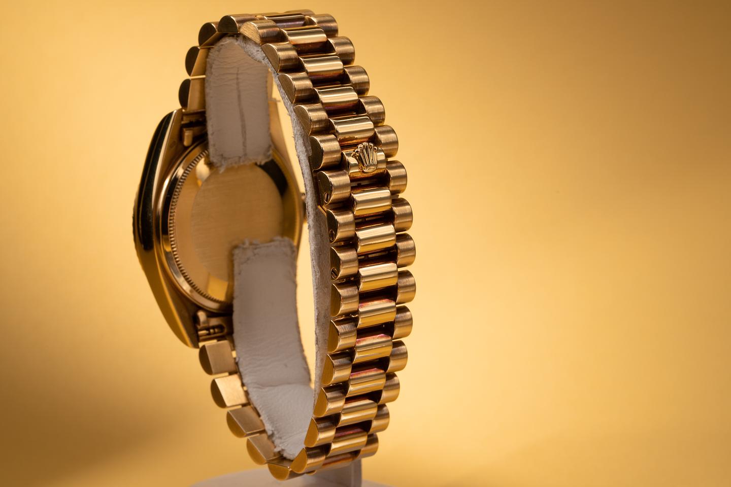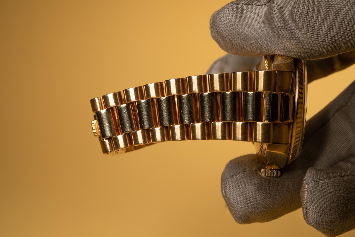 Bracelet: The 23 link 18k yellow gold president bracelet is excellent showing light stretch for its age.