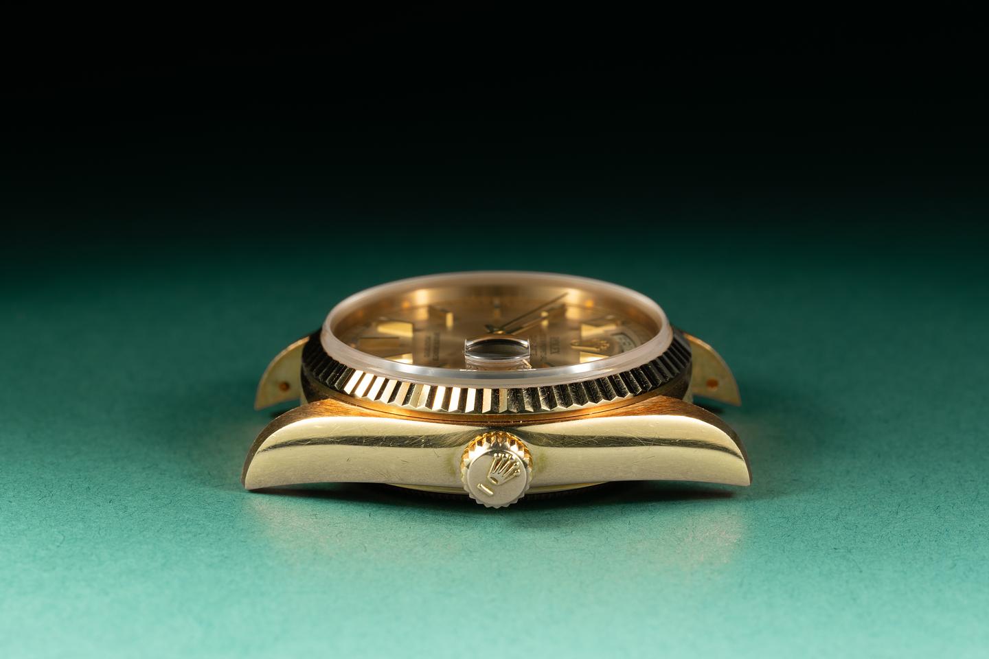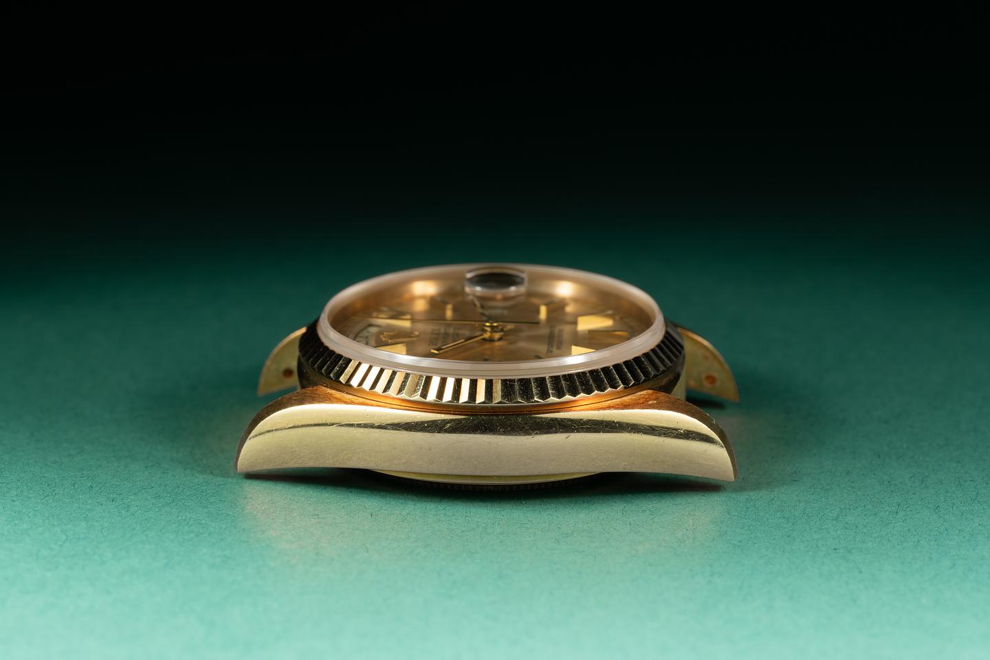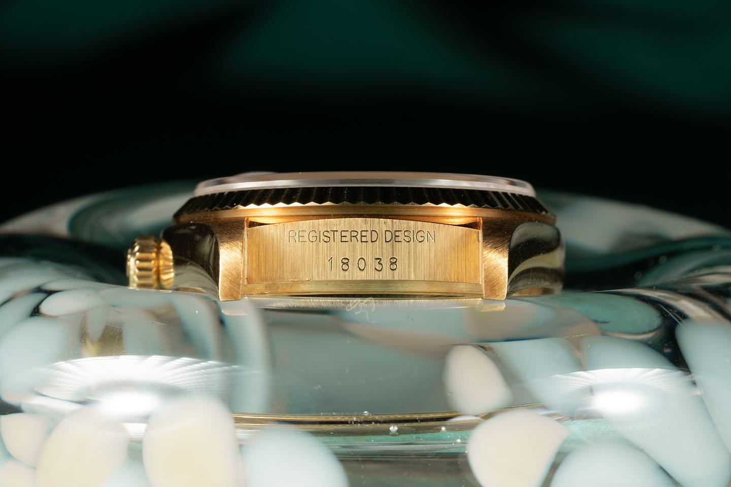 Case: The thick and even 18k yellow gold case is excellent showing a warm rosy patina and only light wear from use. The sharp 18k yellow gold fluted bezel is also in excellent condition showing a roast patina that matches the case and only light wear from use.