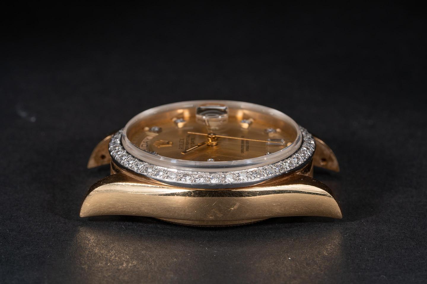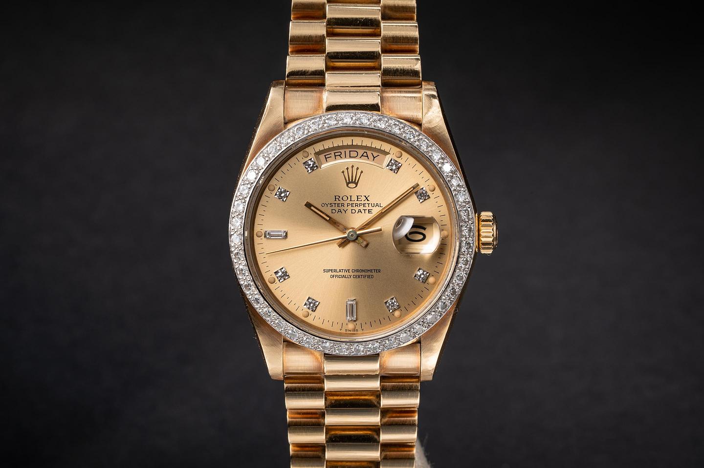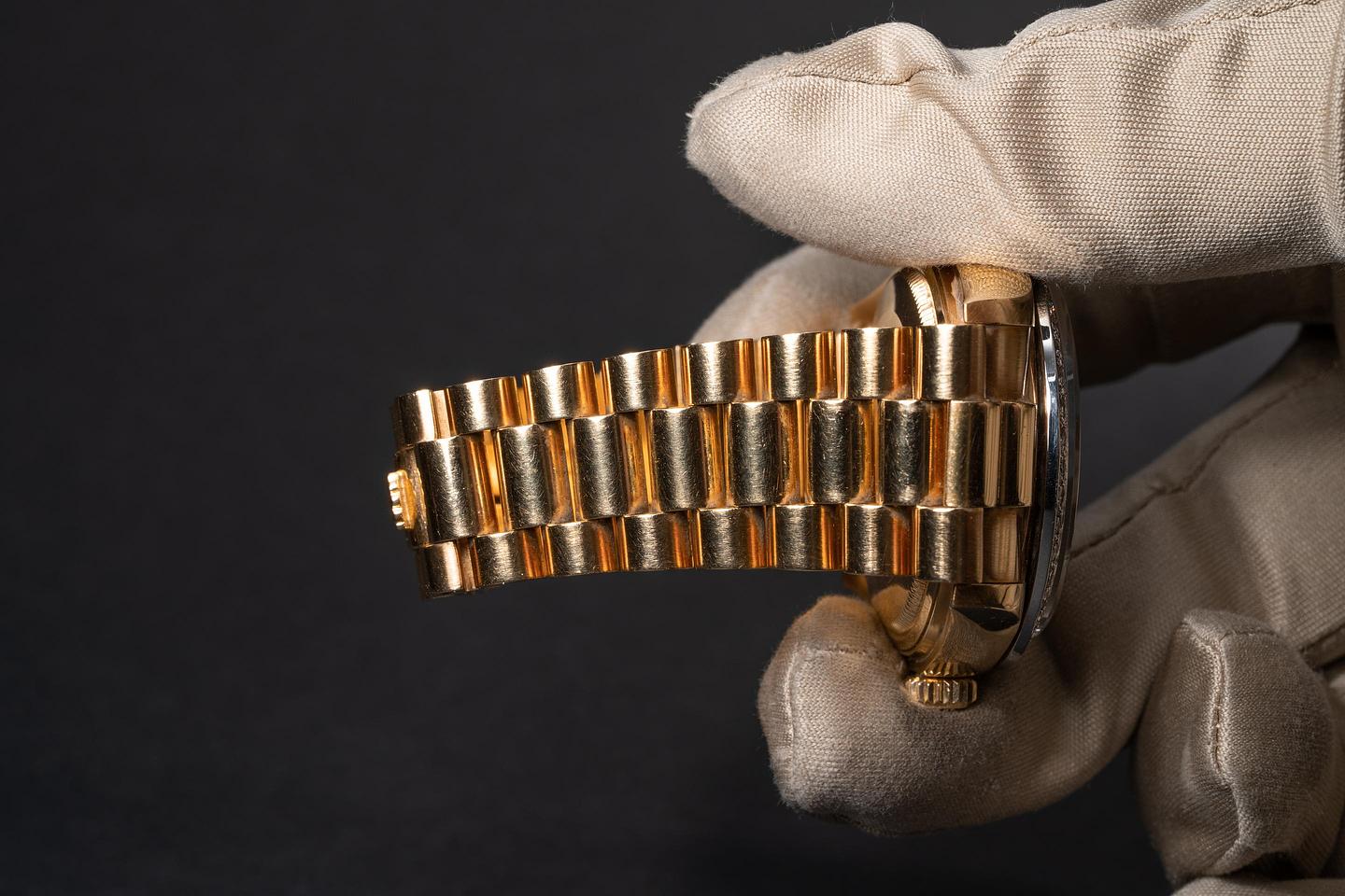 Bracelet: The 23 link 18k yellow gold president bracelet is in excellent condition showing only light stretch for its age.