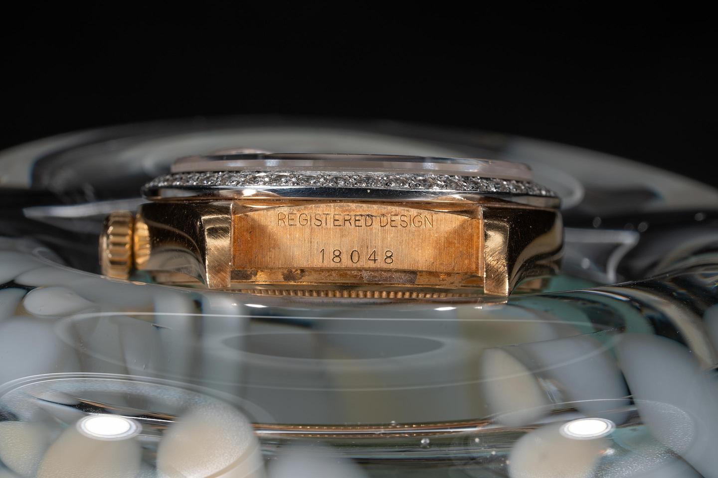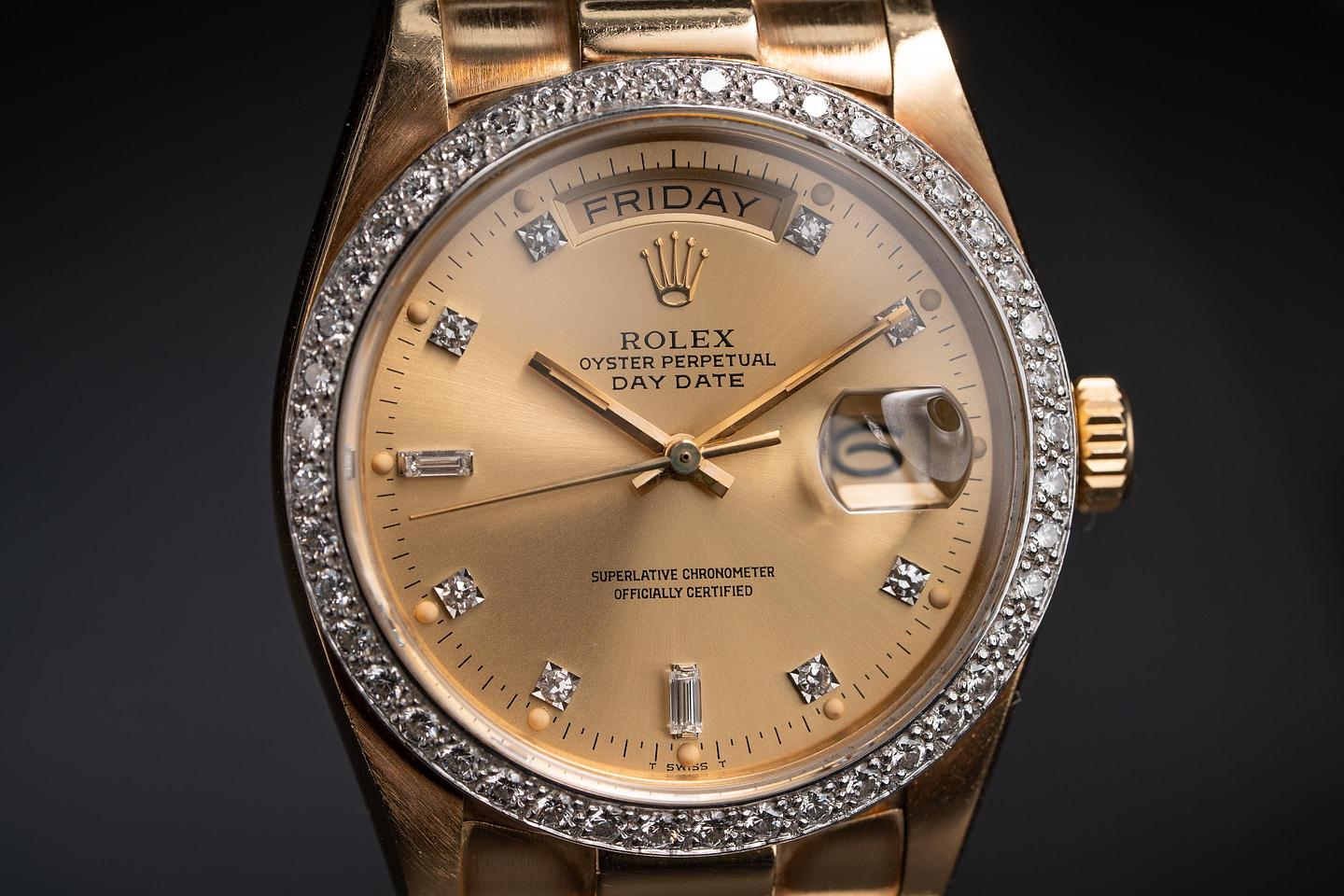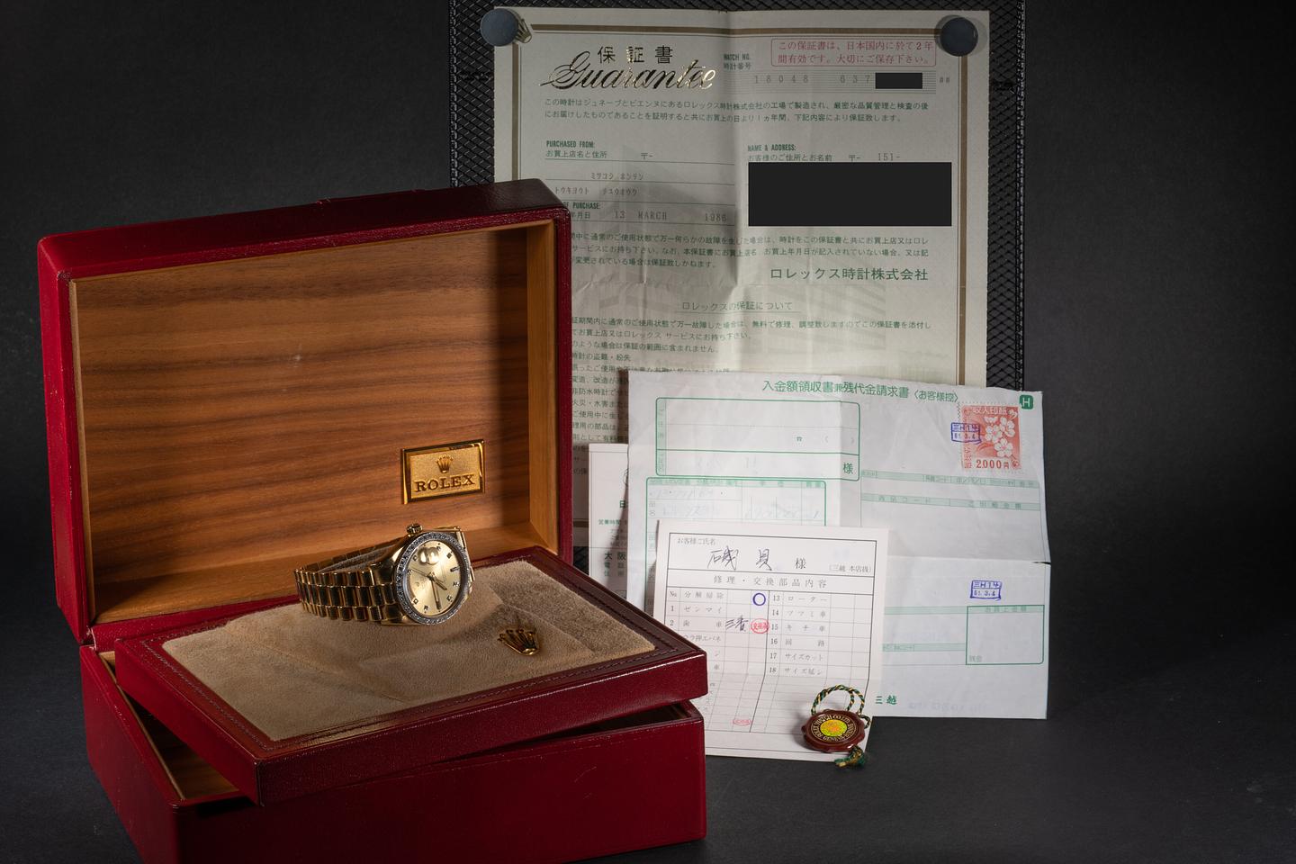 Notes: The factory white gold diamond bezel appears extra bright on this full set 18048.