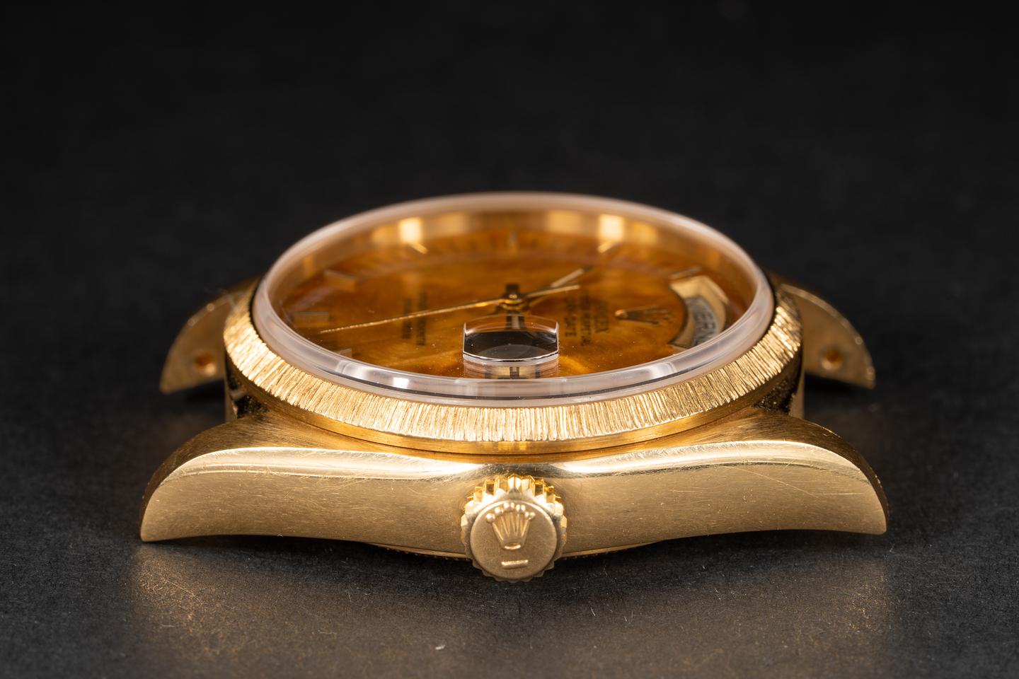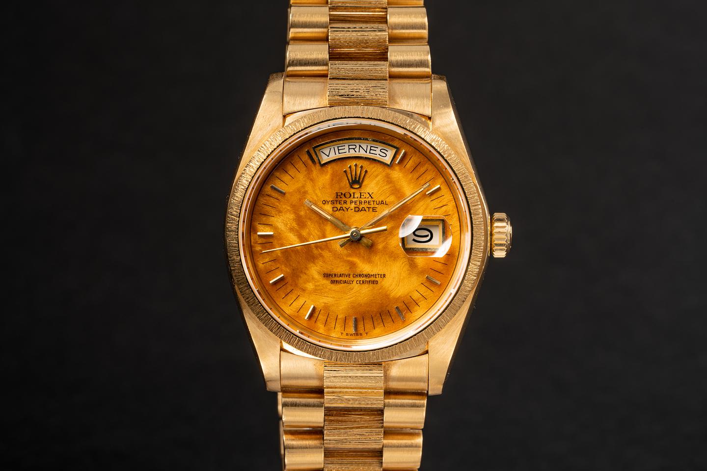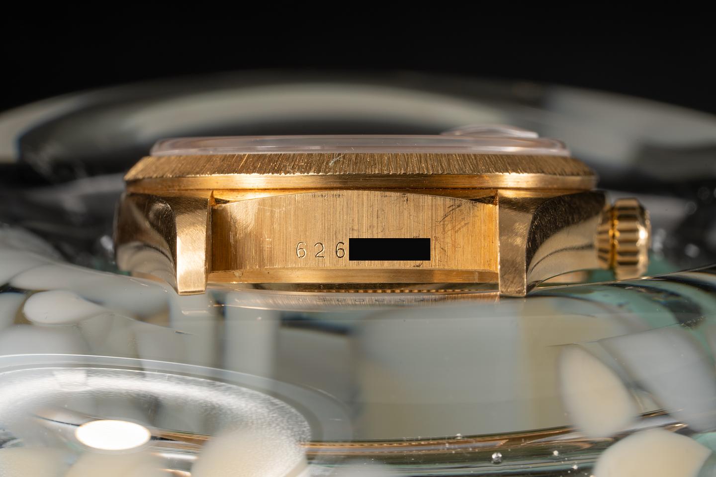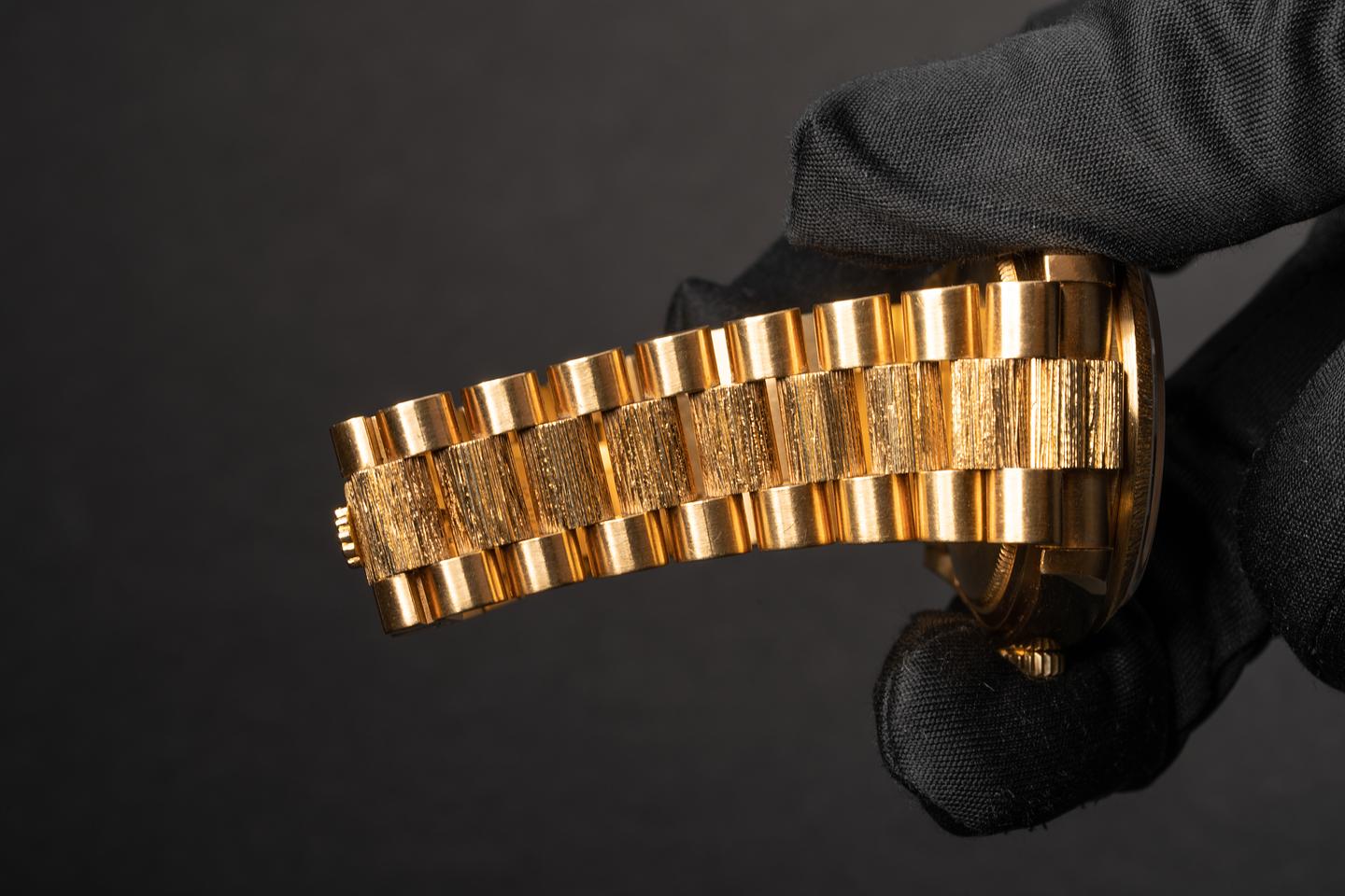 Bracelet: The 22 link 18k yellow gold president bracelet is excellent with a sharp and well-defined factory applied bark finish on the center links. The bracelet shows only very light stretch for its age.
