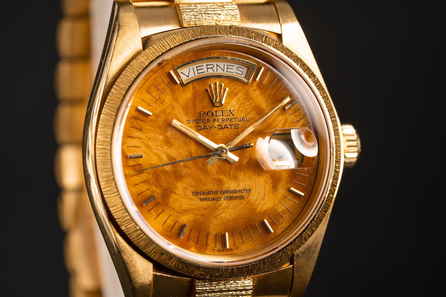 Notes: Found in everything from mid-century modern furniture, to Rolex dials, to match grade rifle stocks, burl has long since been a favorite material to woodworkers and artisans. This particular dial has the look of molten gold swirling and mixing together in a beautiful organic pattern that almost appears to move.