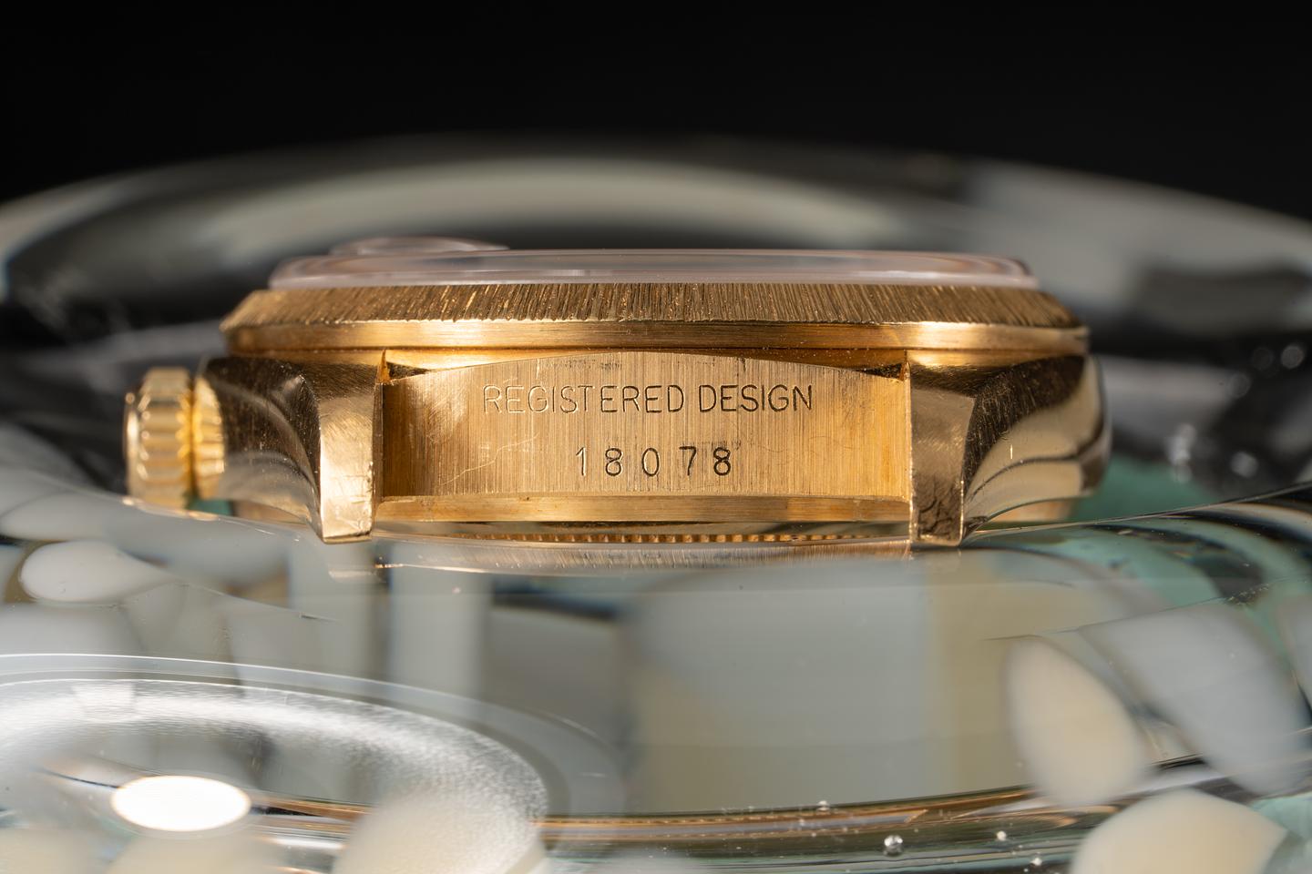 Case: The thick and even 18k yellow gold case is excellent and appears to be unpolished showing light wear from use. A bark finish has been factory applied to the 18k yellow gold bezel. The bezel shows only very light wear from use.