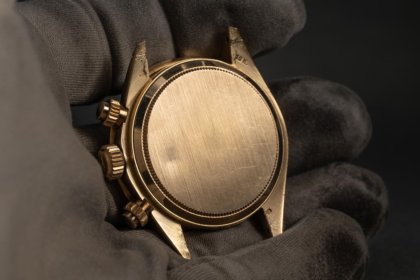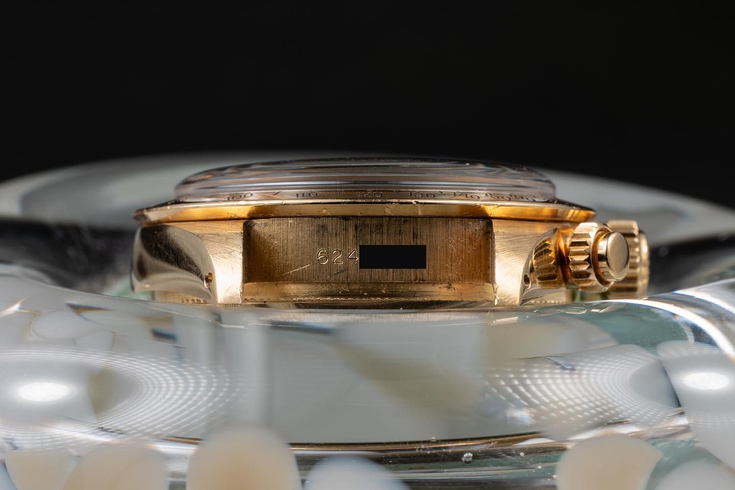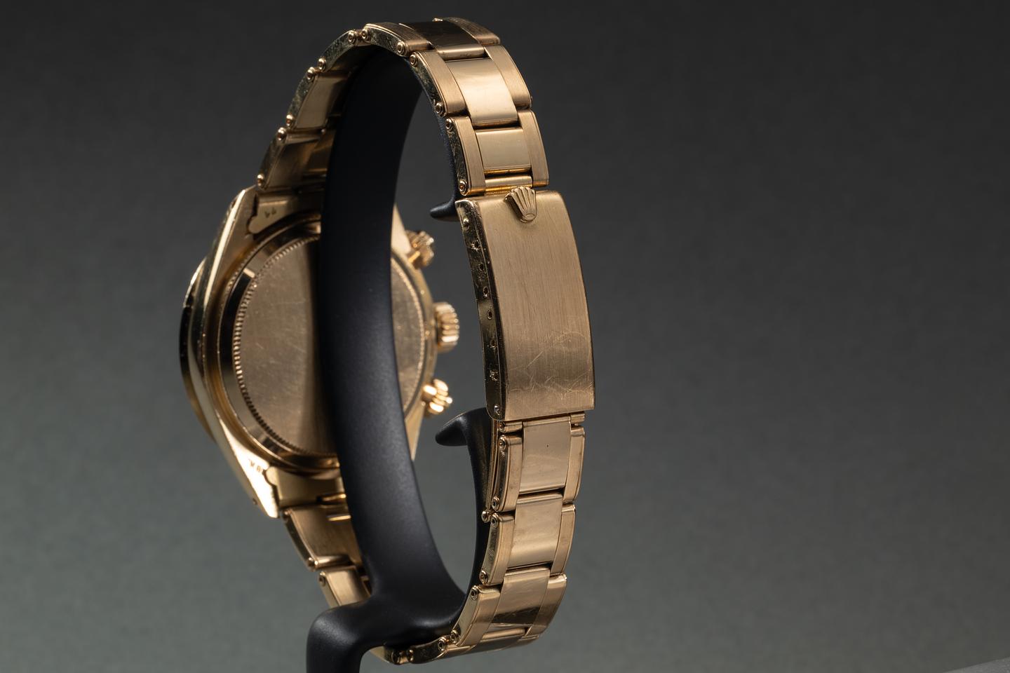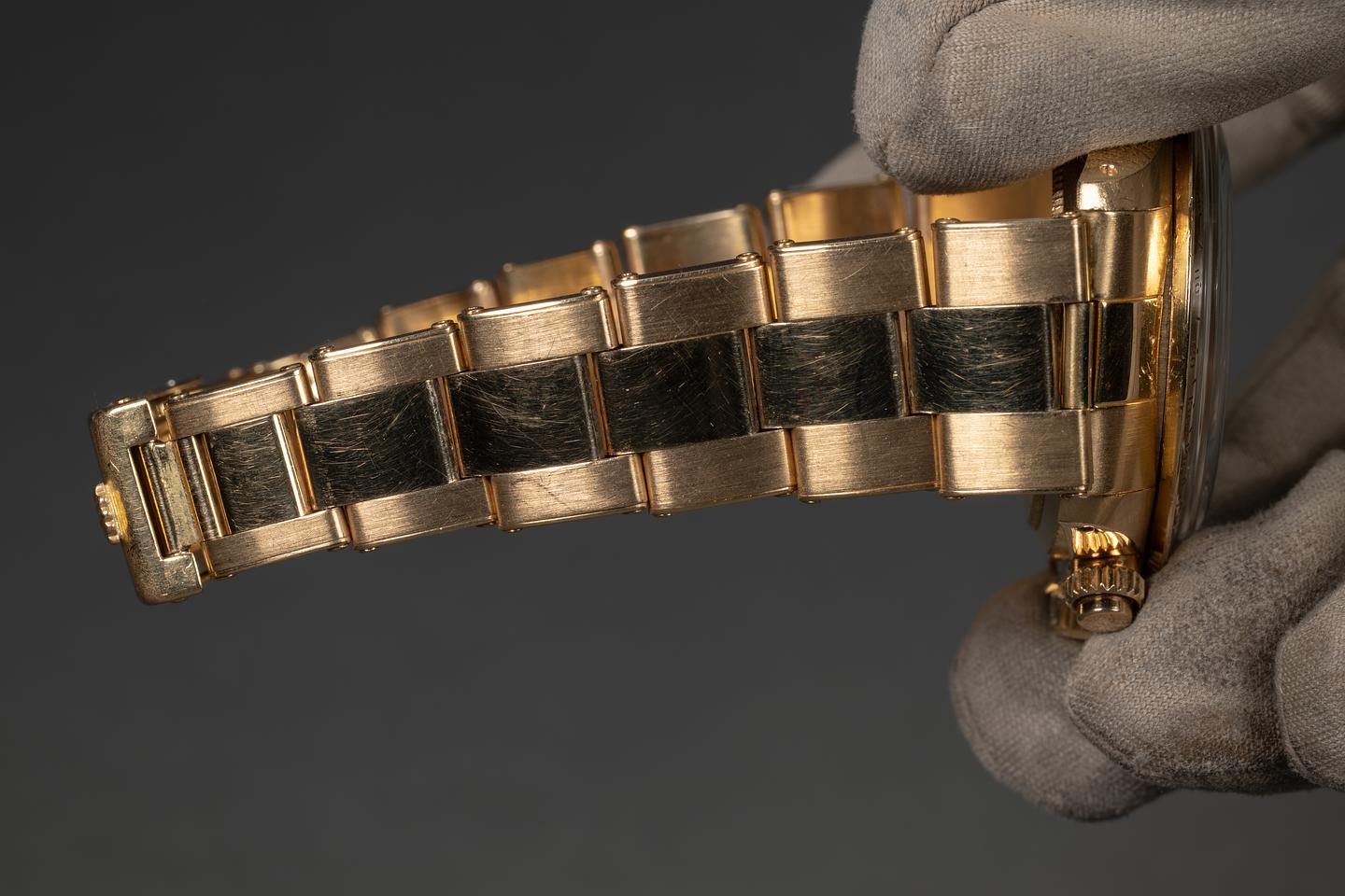 Case: The unpolished 18K yellow gold case is excellent, showing only very light wear to the visible portions of the case. There is some springbar wear on the back side of the lugs. The 18K yellow gold bezel is also in excellent showing only light wear from use.
