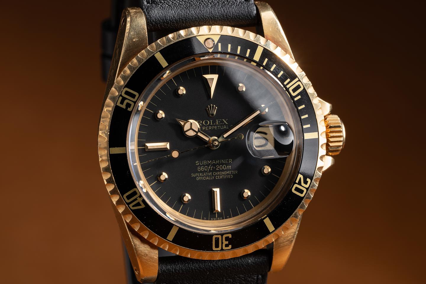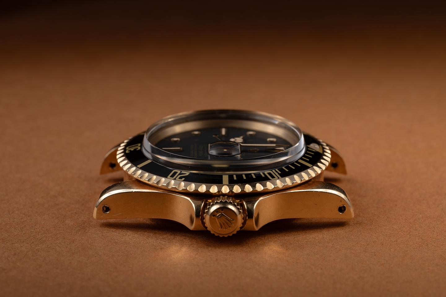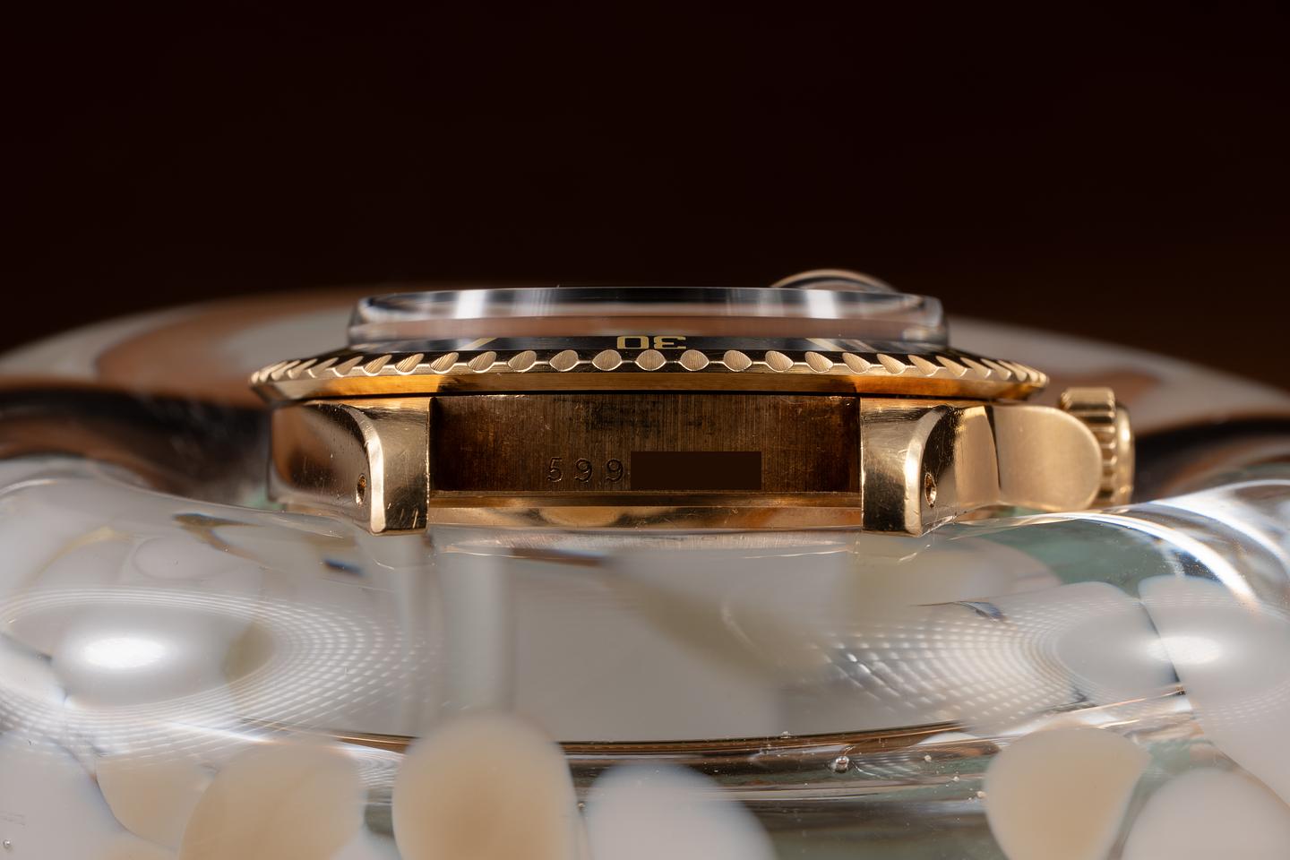 Case: The unpolished 18K yellow gold case is excellent, showing prominent factory bevels and some light wear from use. The black bezel insert is also in excellent condition, showing only very light wear from use.