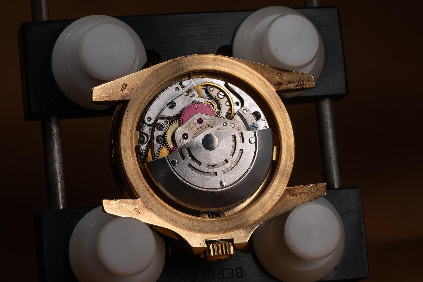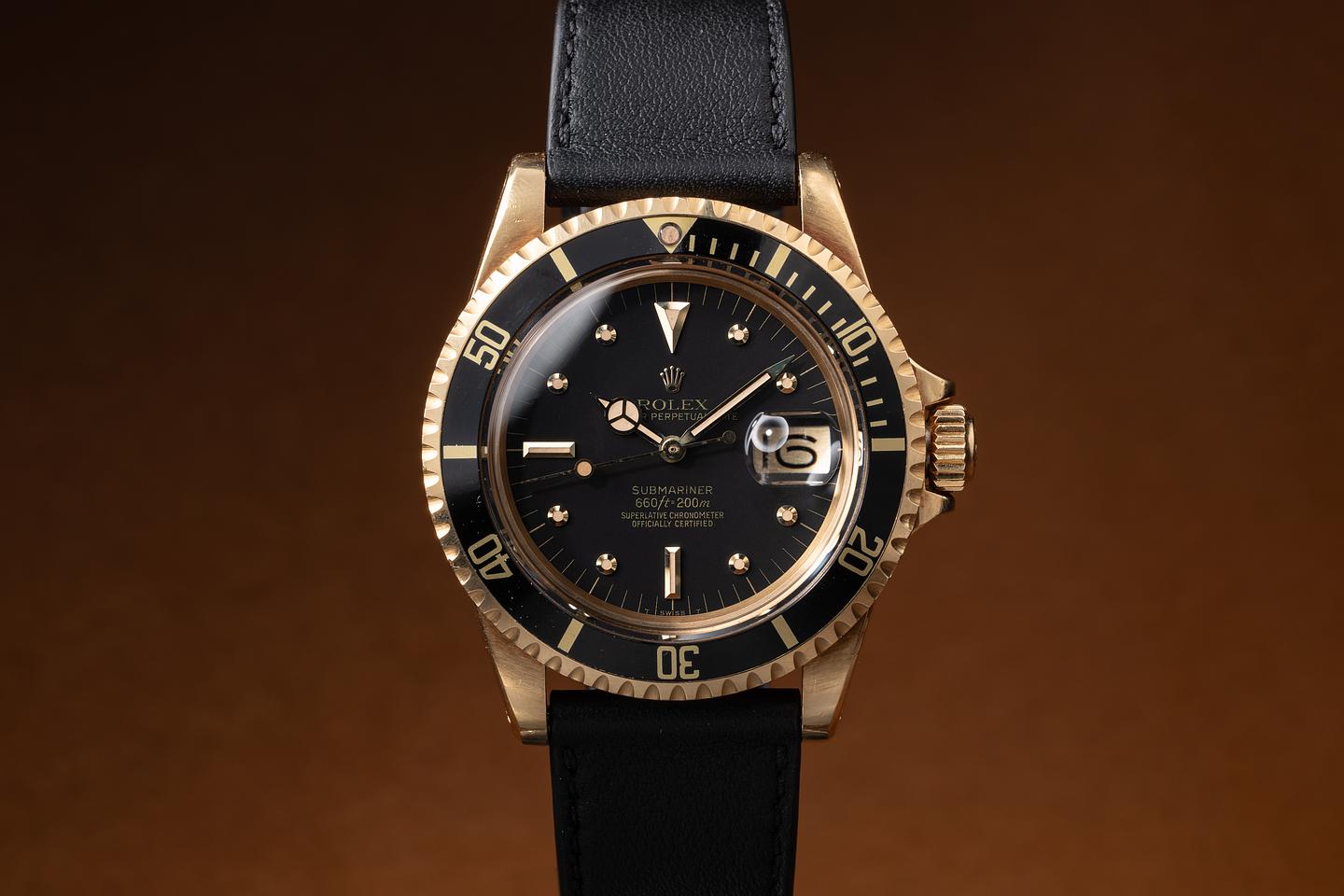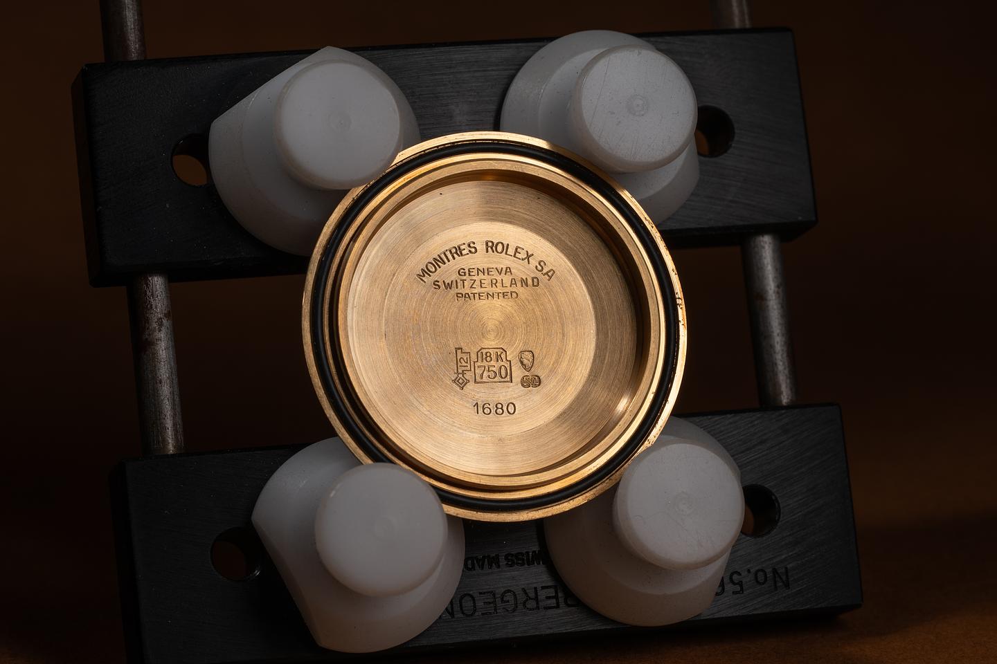 Case: The unpolished 18K yellow gold case is excellent, showing prominent factory bevels and some light wear from use. The black bezel insert is also in excellent condition, showing only very light wear from use.