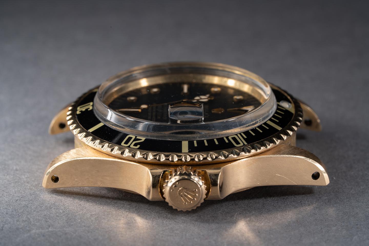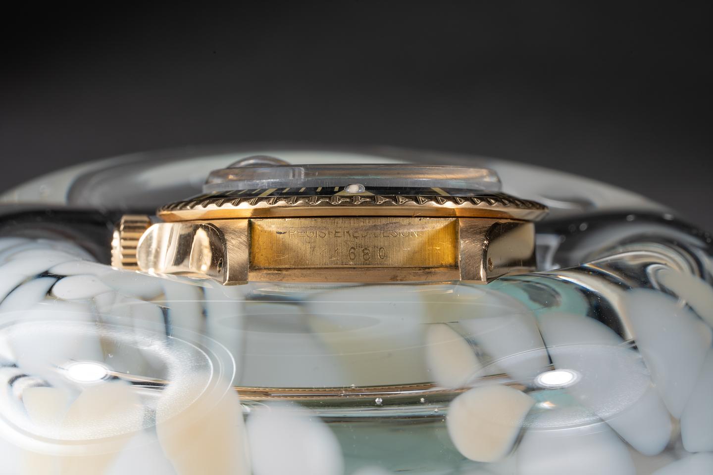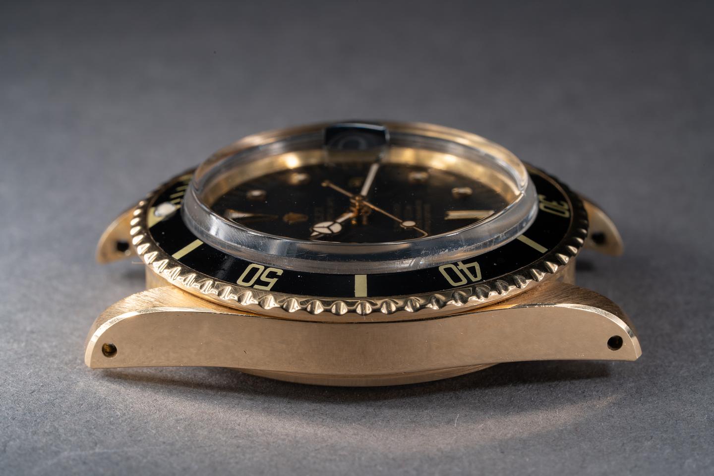 Case: The recently polished 18k yellow gold case is excellent showing sharp prominent bevels ad only very light wear from use. The black bezel insert is also in excellent condition showing only light wear from use.