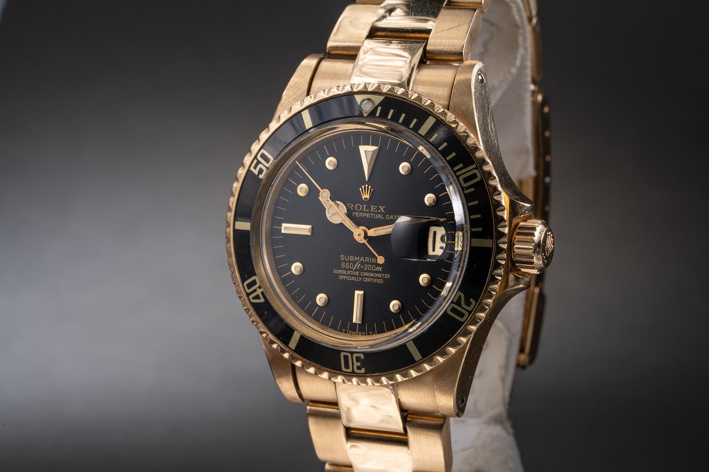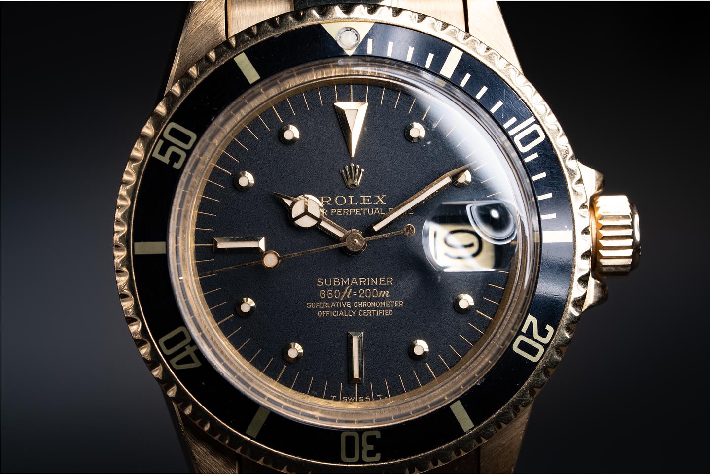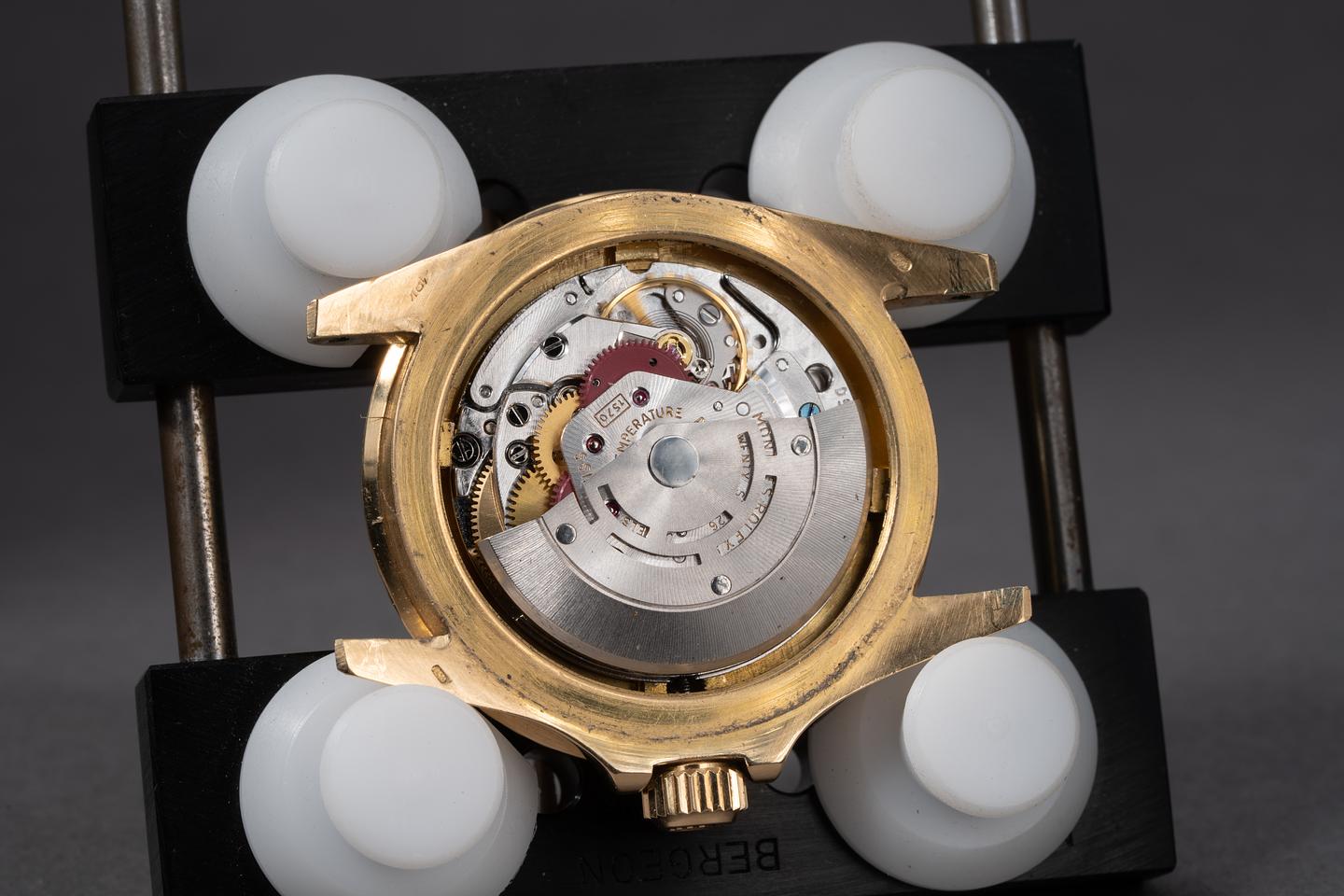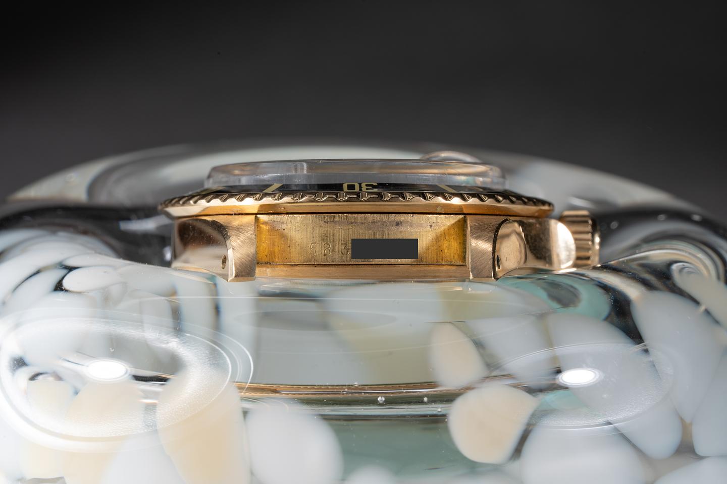 Case: The recently polished 18k yellow gold case is excellent showing sharp prominent bevels ad only very light wear from use. The black bezel insert is also in excellent condition showing only light wear from use.