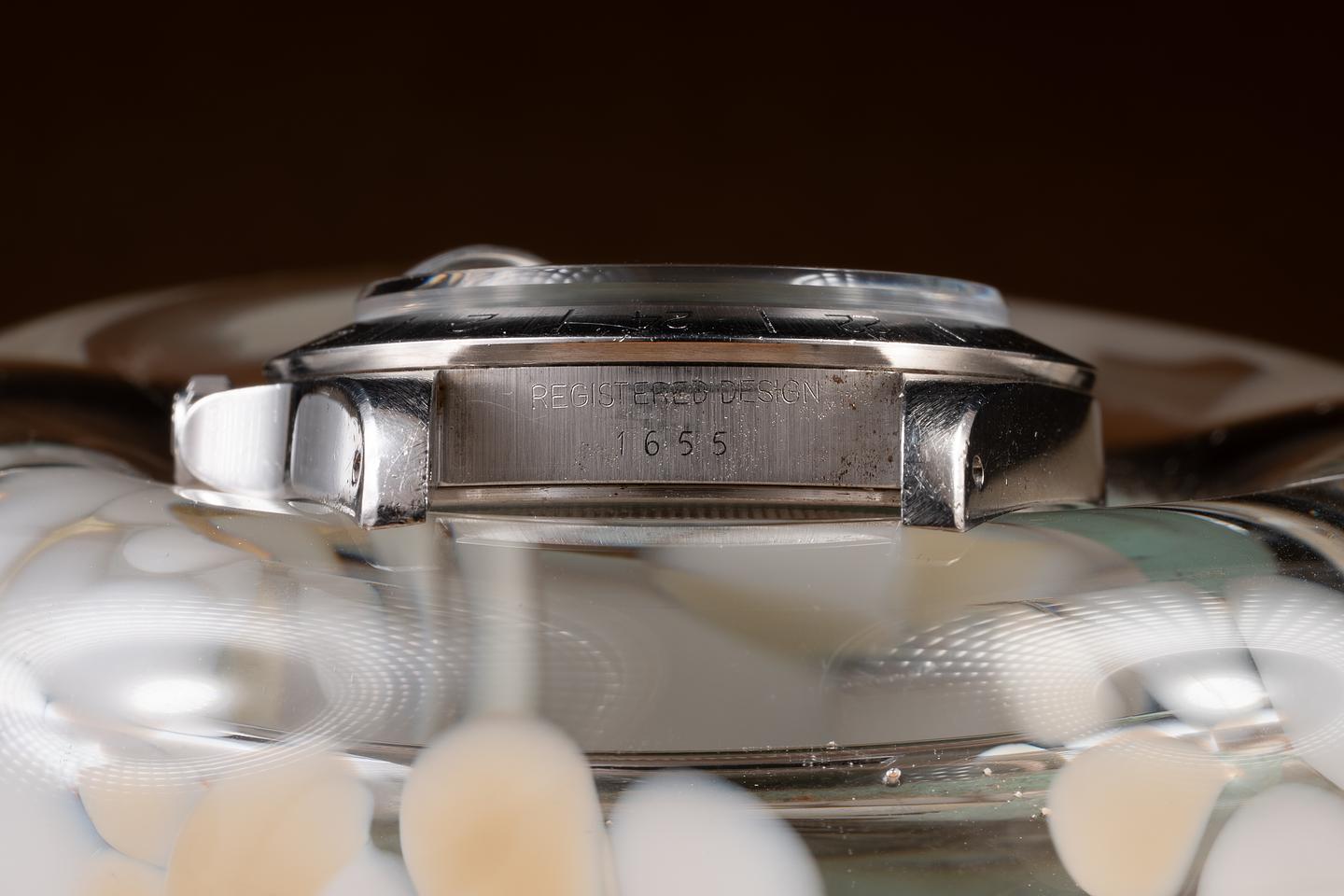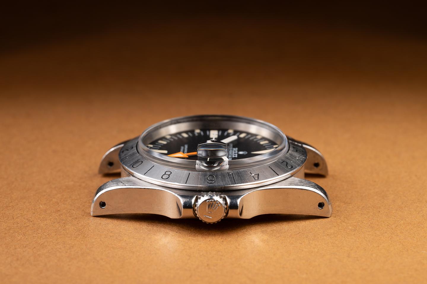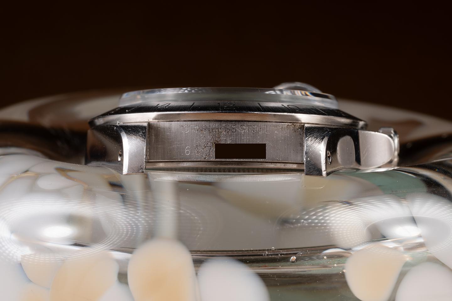 Case: The unpolished case is excellent, showing wide, prominent factory bevels and only light wear from use. The stainless bezel is also in excellent condition, showing only very light wear from use.