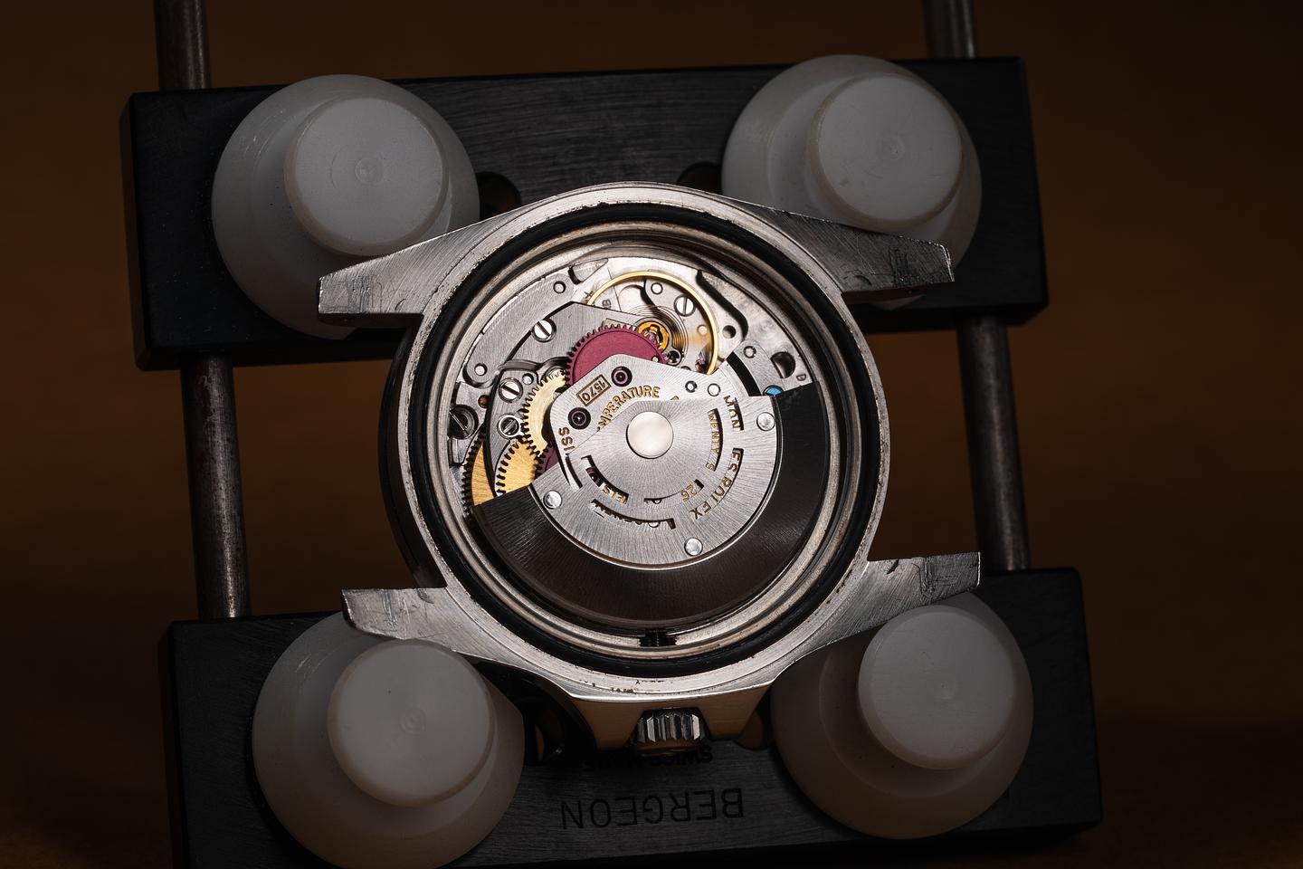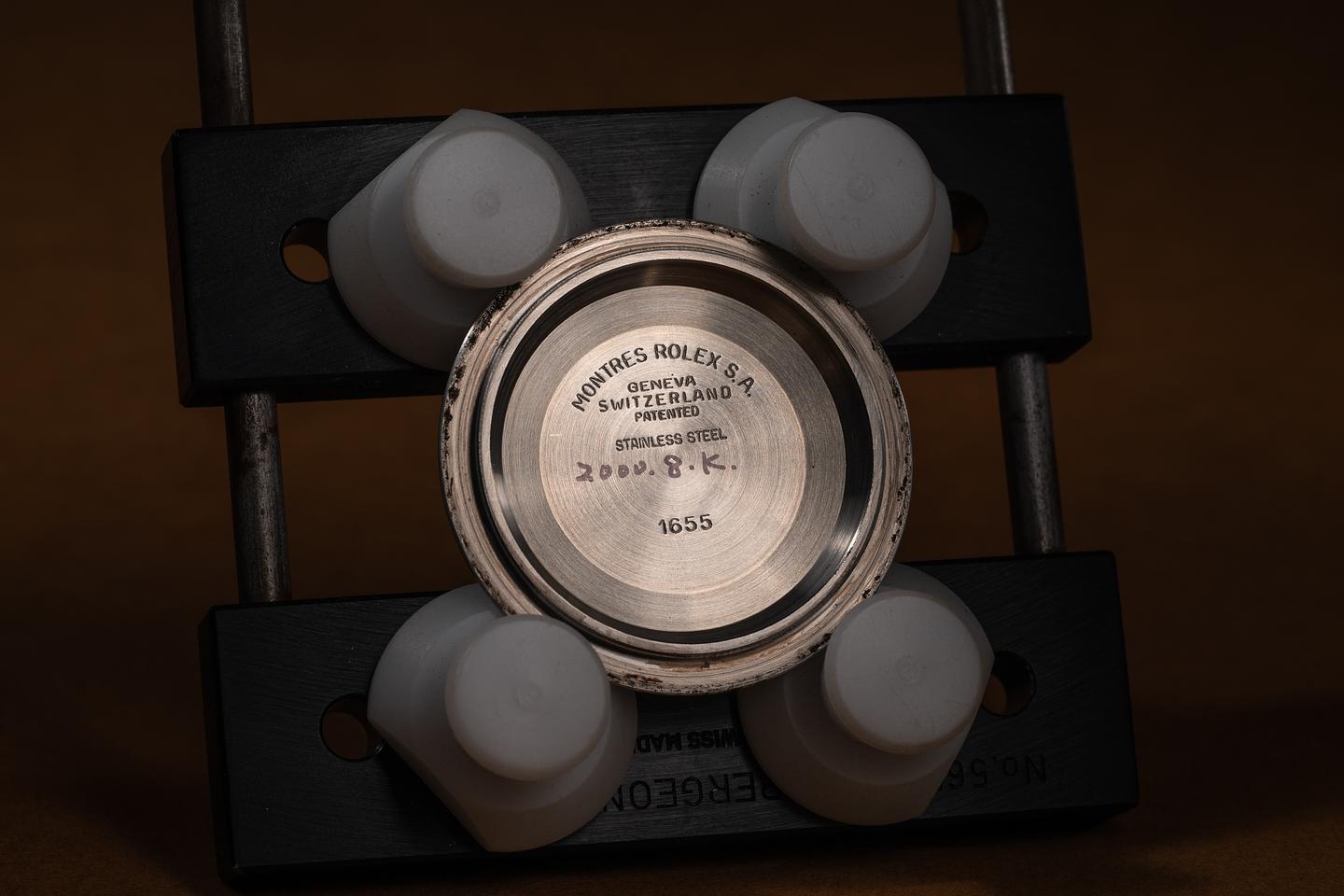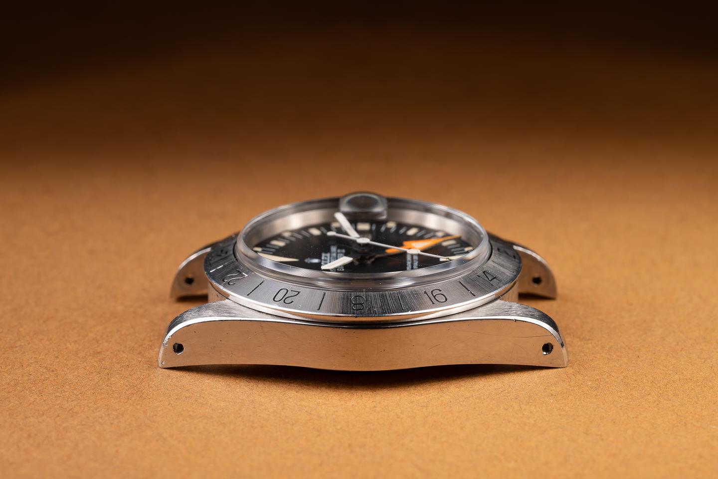 Case: The unpolished case is excellent, showing wide, prominent factory bevels and only light wear from use. The stainless bezel is also in excellent condition, showing only very light wear from use.
