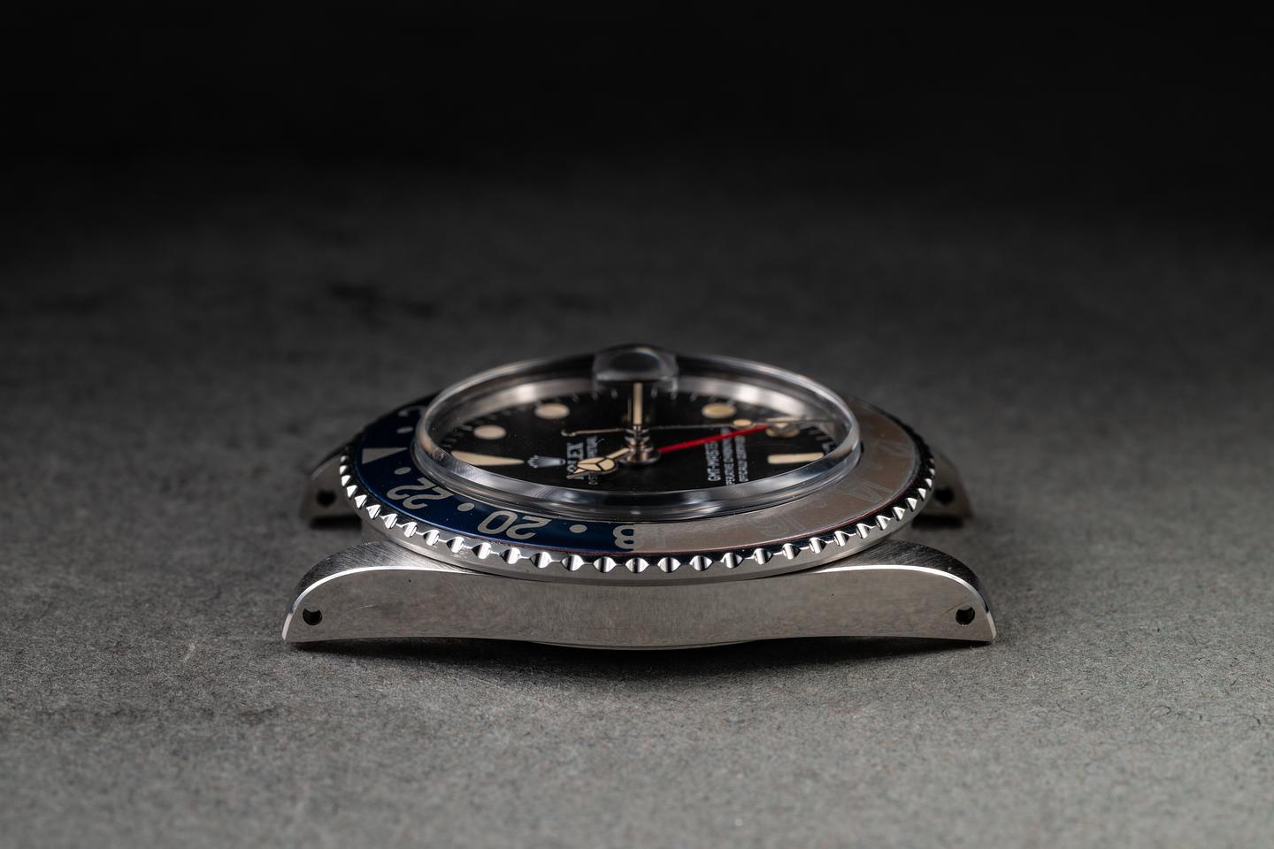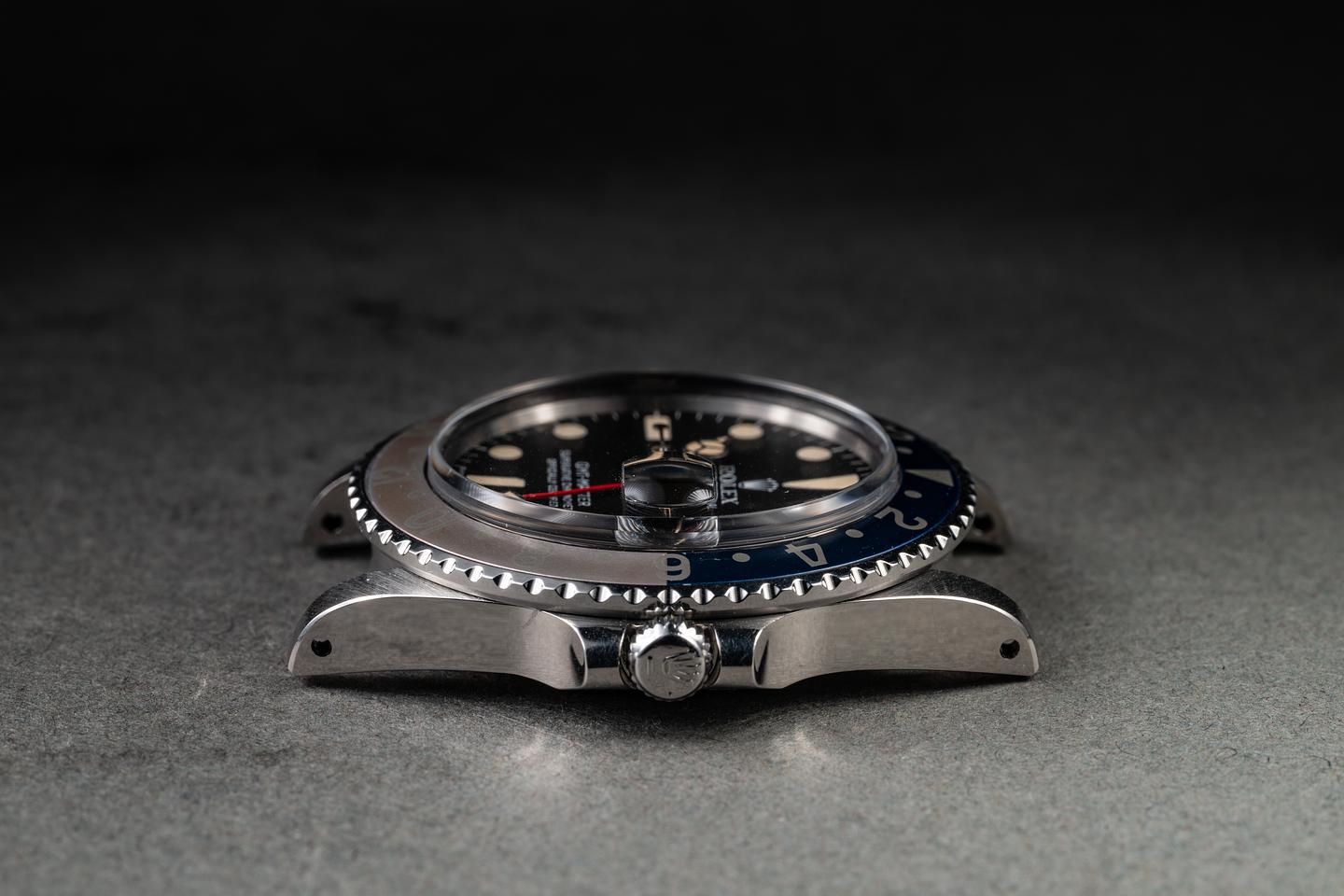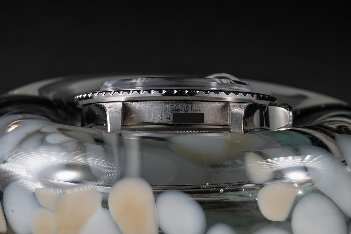 Case: The recently polished case is excellent, showing sharp, prominent bevels and only very light wear. The bezel insert is also in excellent condition, showing extensive fading to what was the red portion of the insert.