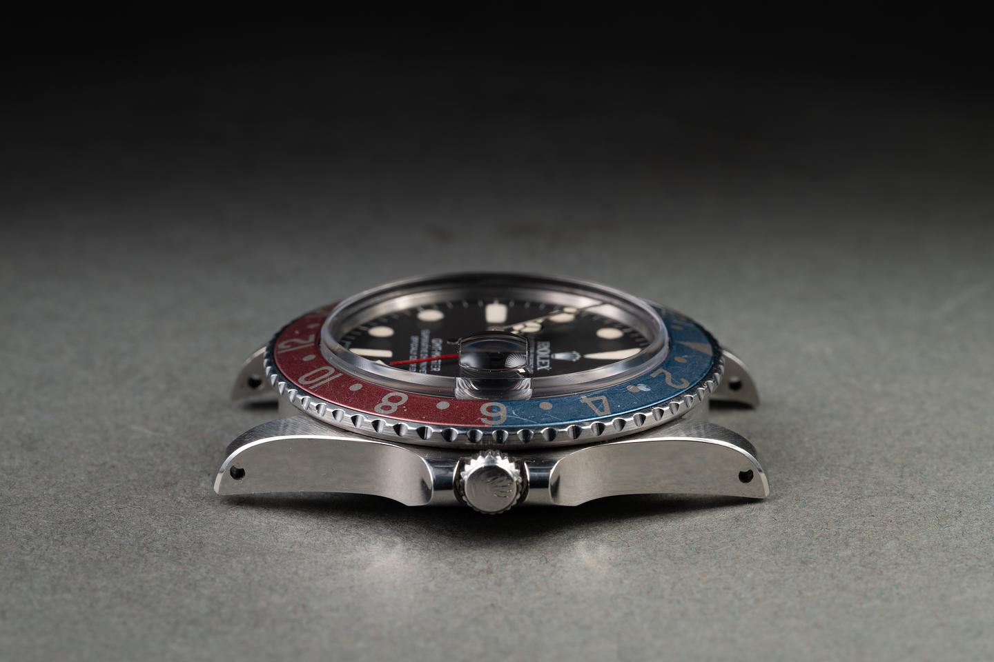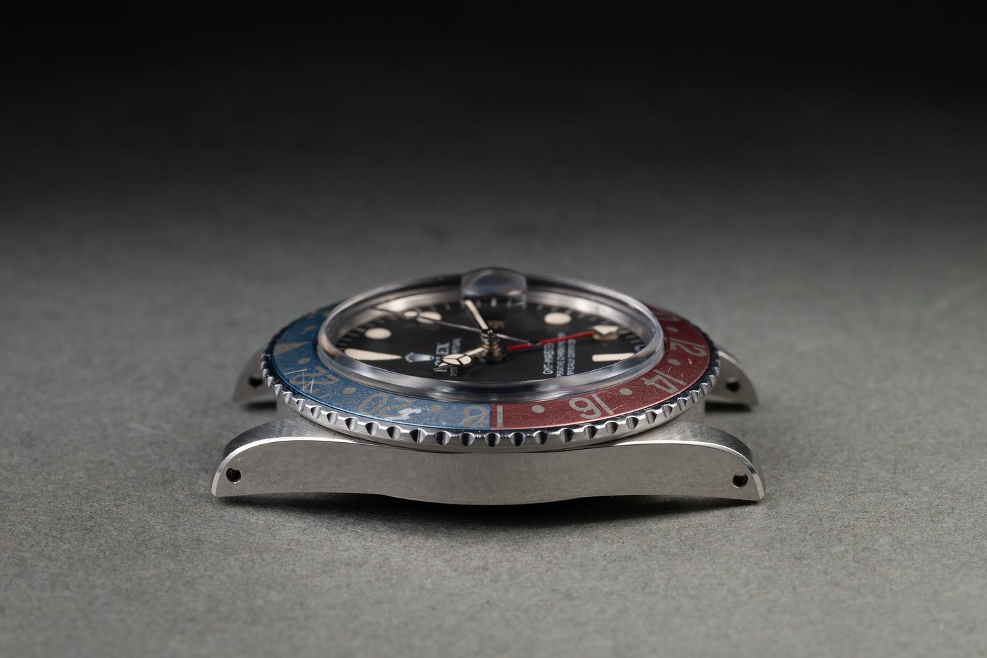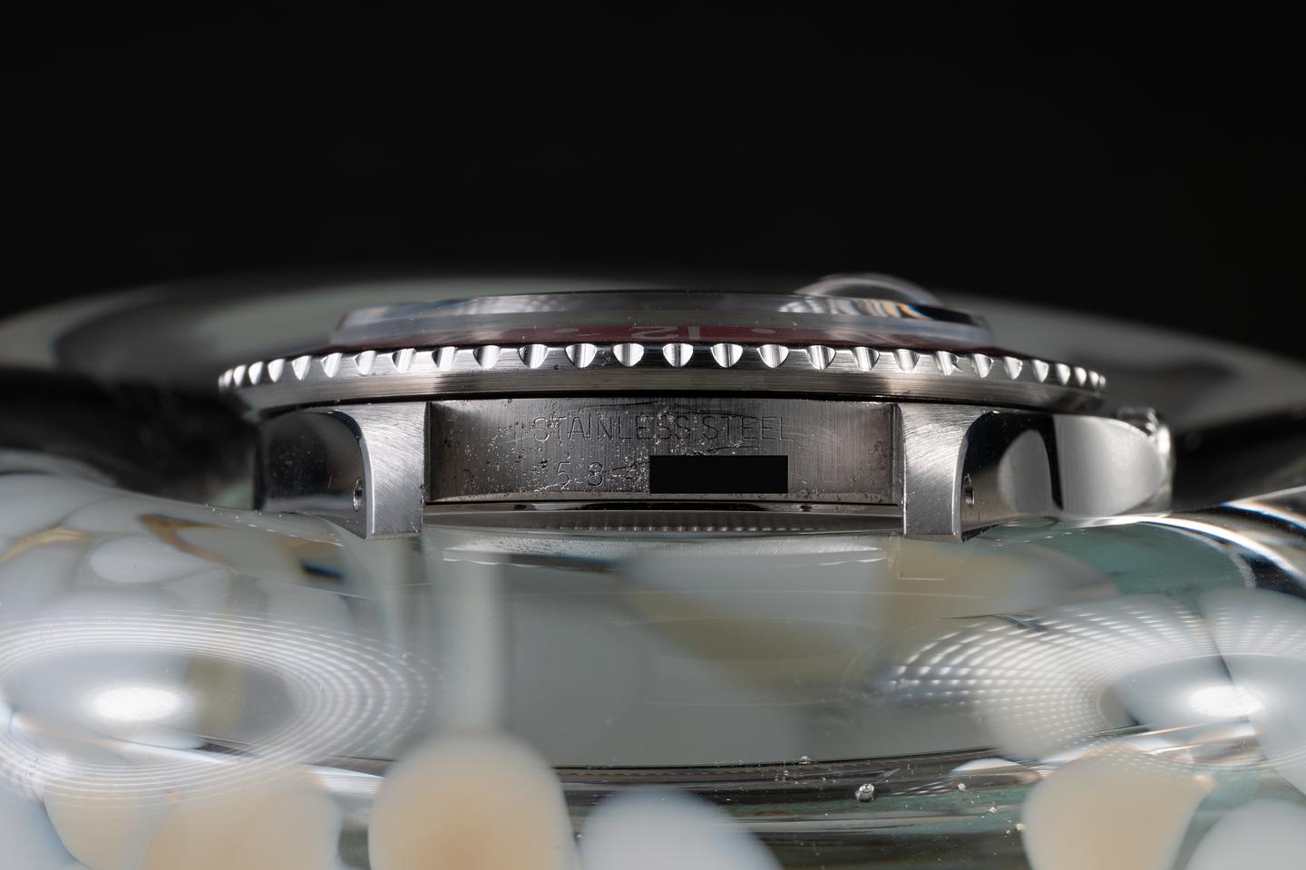 Case: The previously polished case is excellent, showing sharp, prominent bevels and only light wear from use. The blue and red "Pepsi" bezel insert is also in excellent condition, showing significant fading to both portions of the insert.