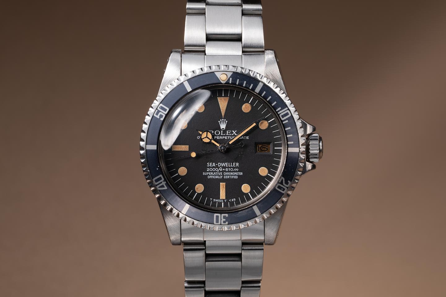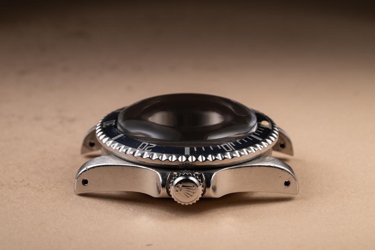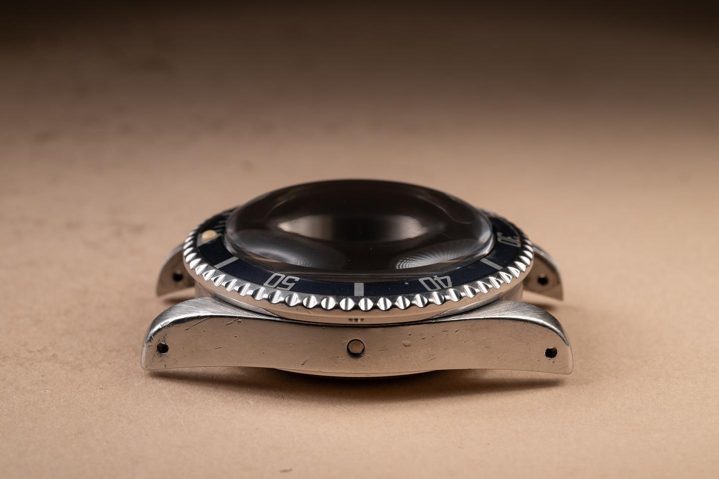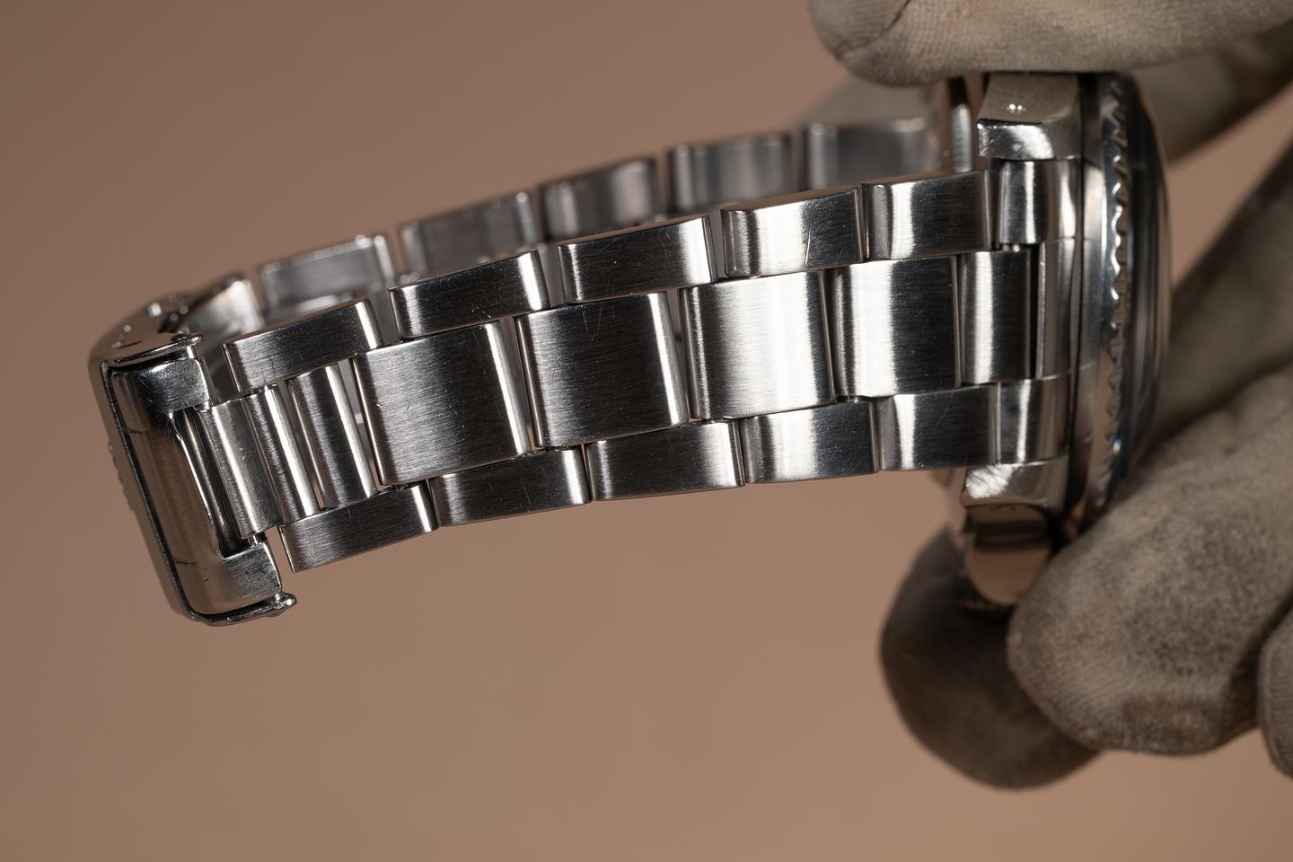 Case: The previously polished case is excellent, showing light to average wear from use. The bezel insert is also in excellent condition and has aged to a silver blue-grey hue, showing some light wear from use.