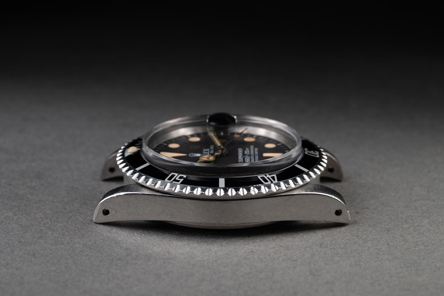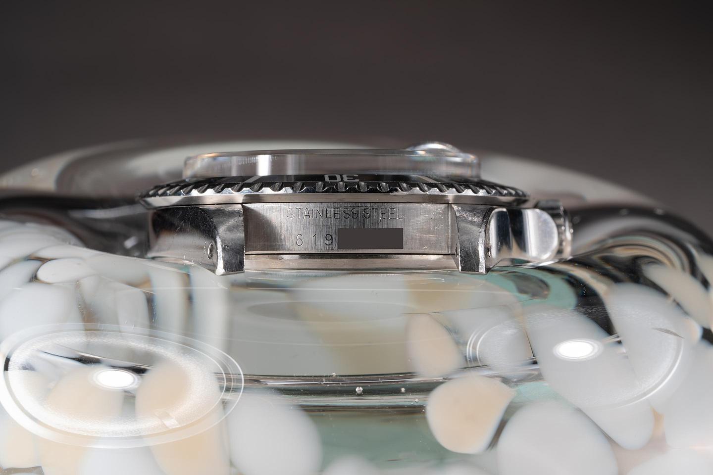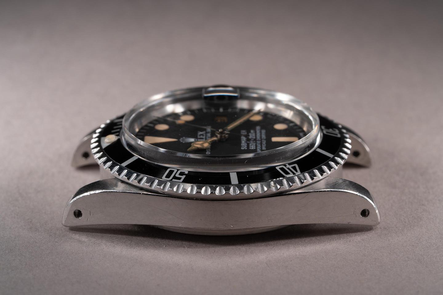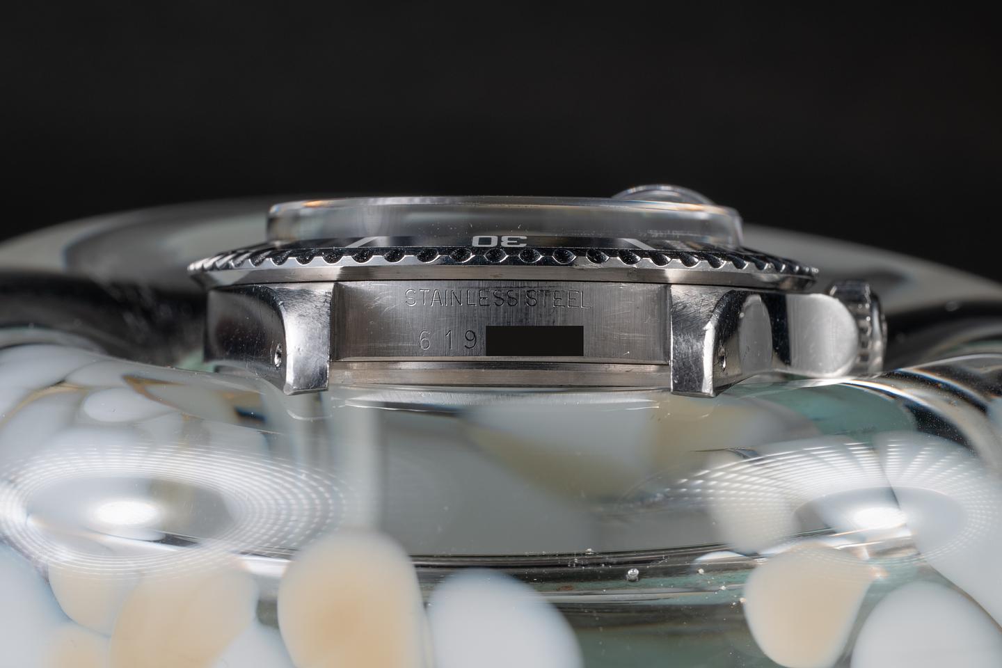 Case: The unpolished case is excellent showing thick prominent factory bevels and overall light wear from use. There is a small ding on the underside of the 7 o'clock lug. The black bezel insert is also in excellent condition showing only very light wear from use.