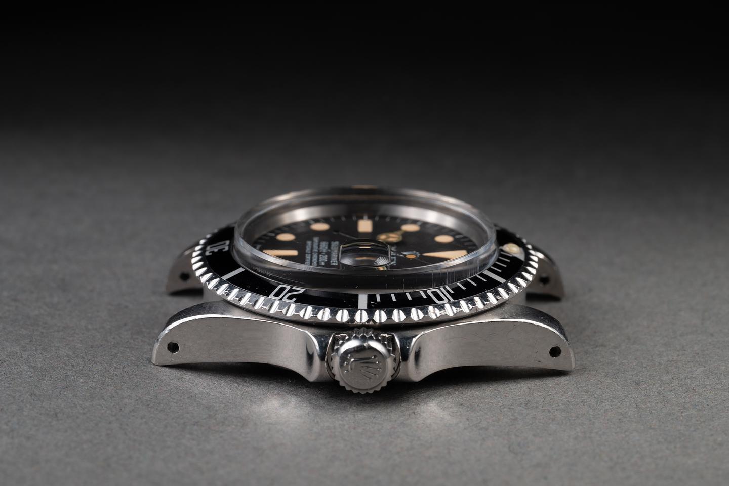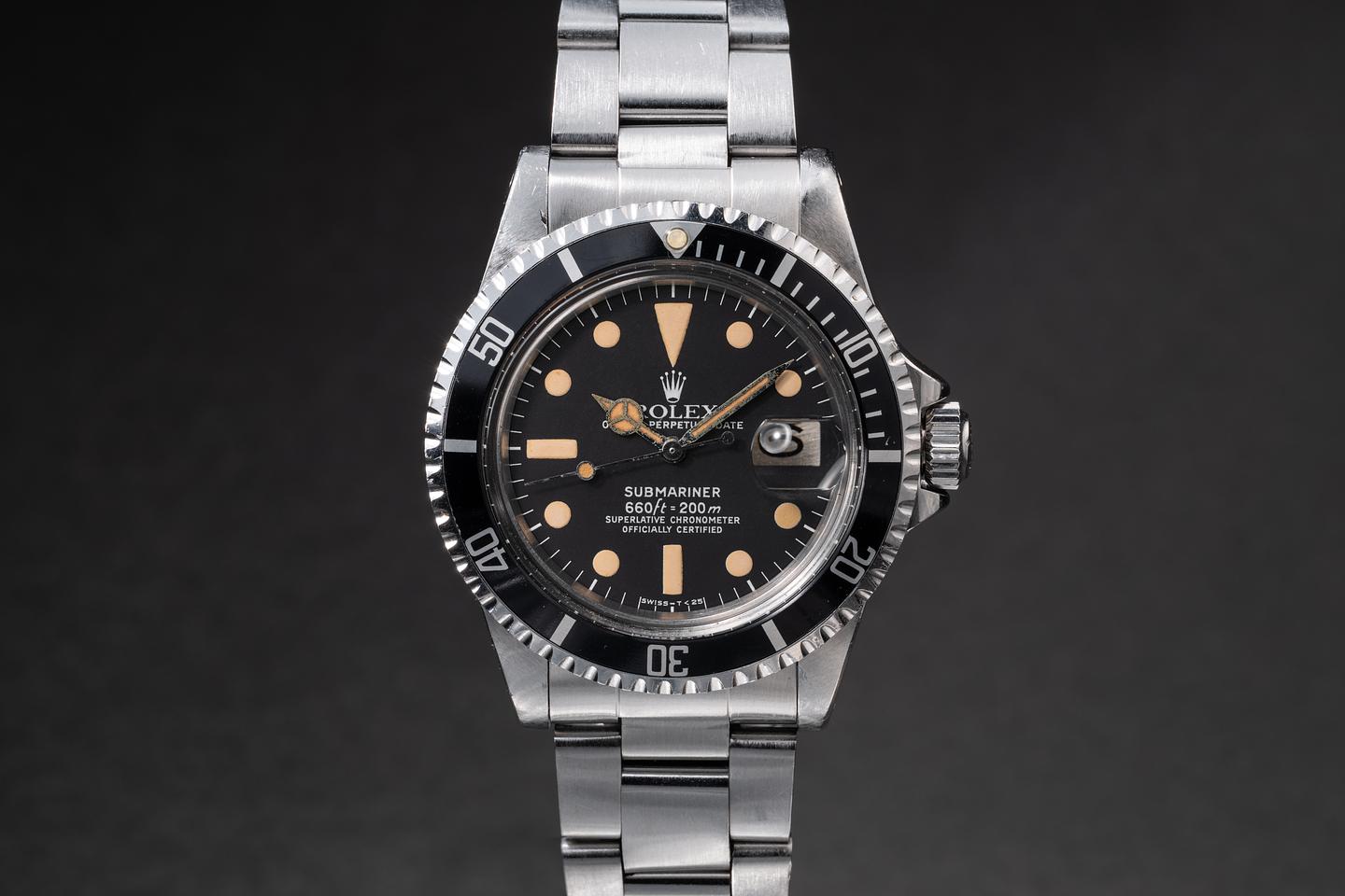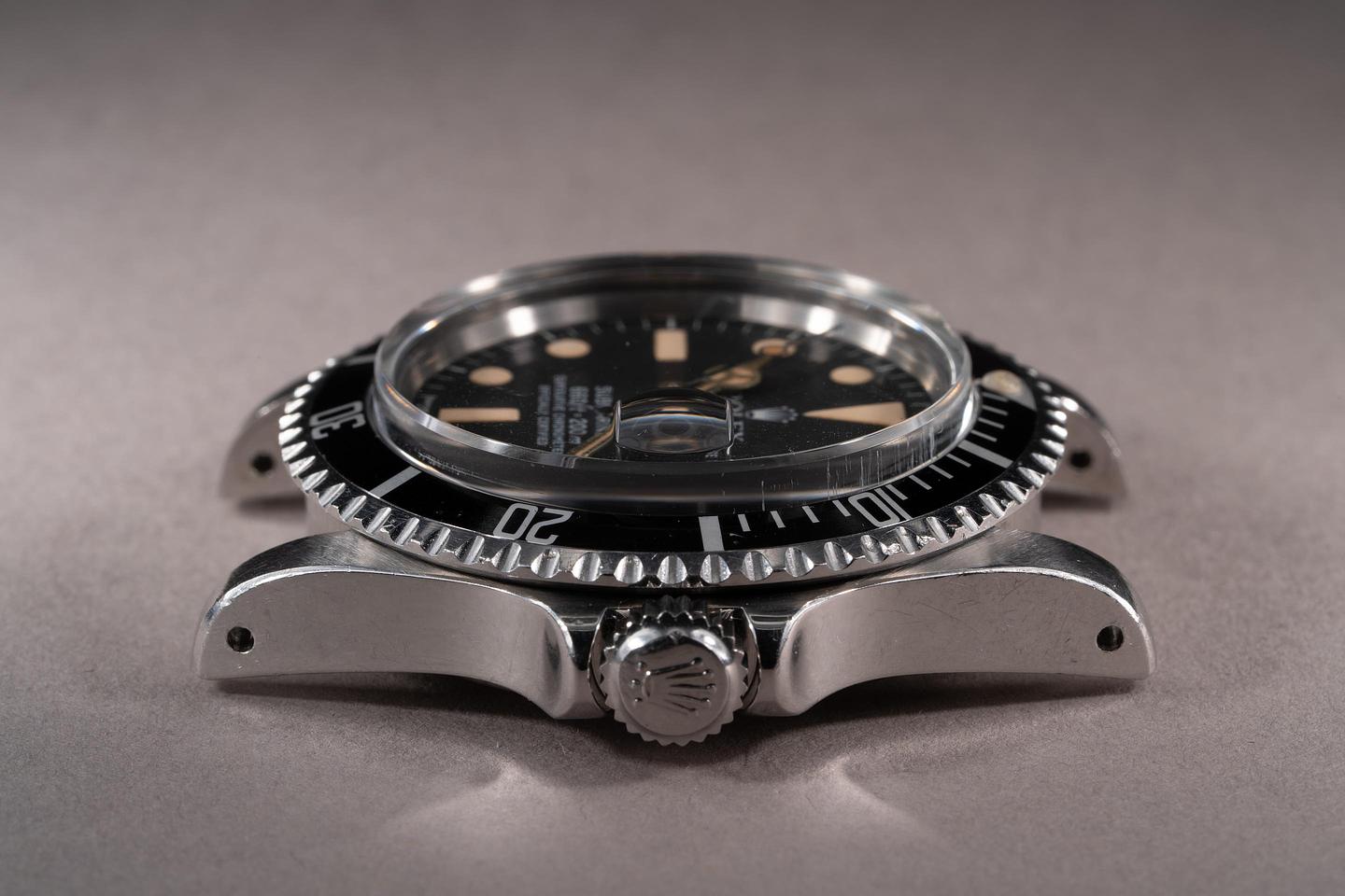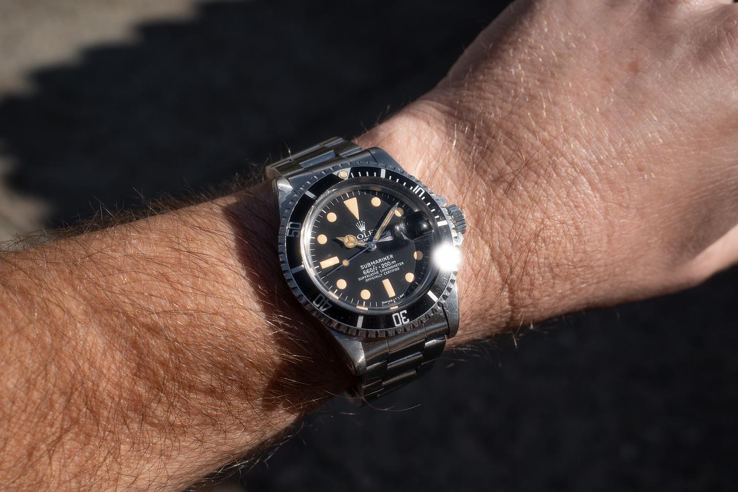 Case: The unpolished case is excellent showing thick prominent factory bevels and overall light wear from use. There is a small ding on the underside of the 7 o'clock lug. The black bezel insert is also in excellent condition showing only very light wear from use.