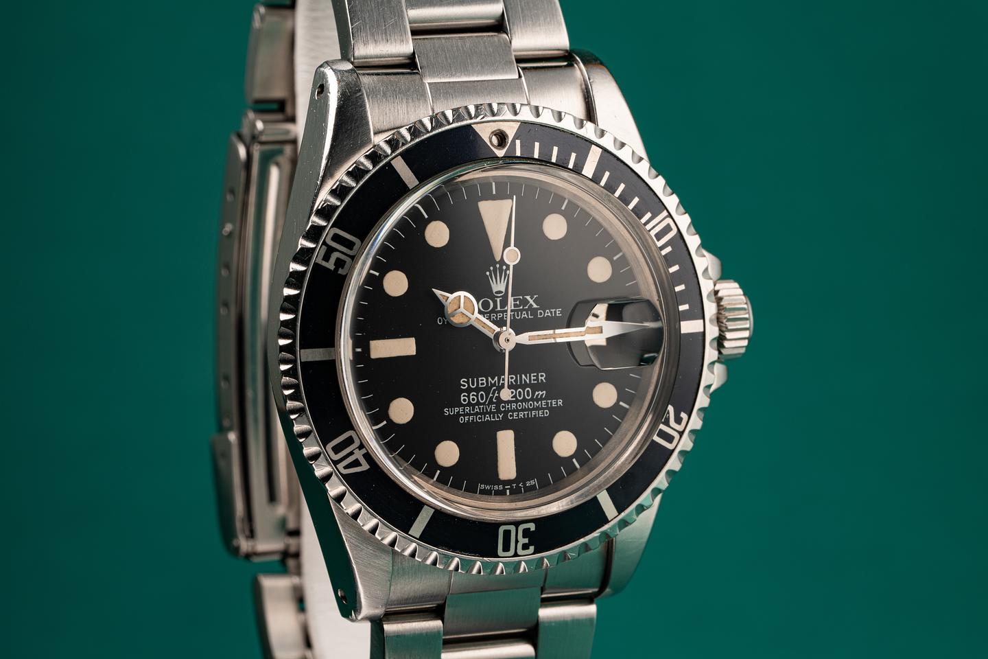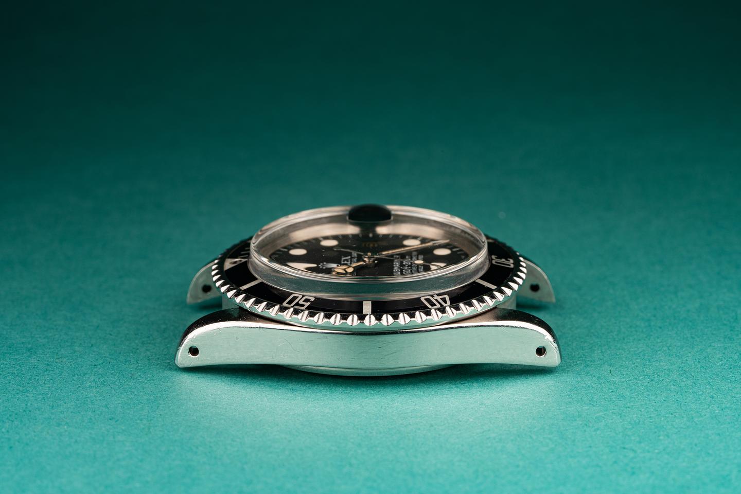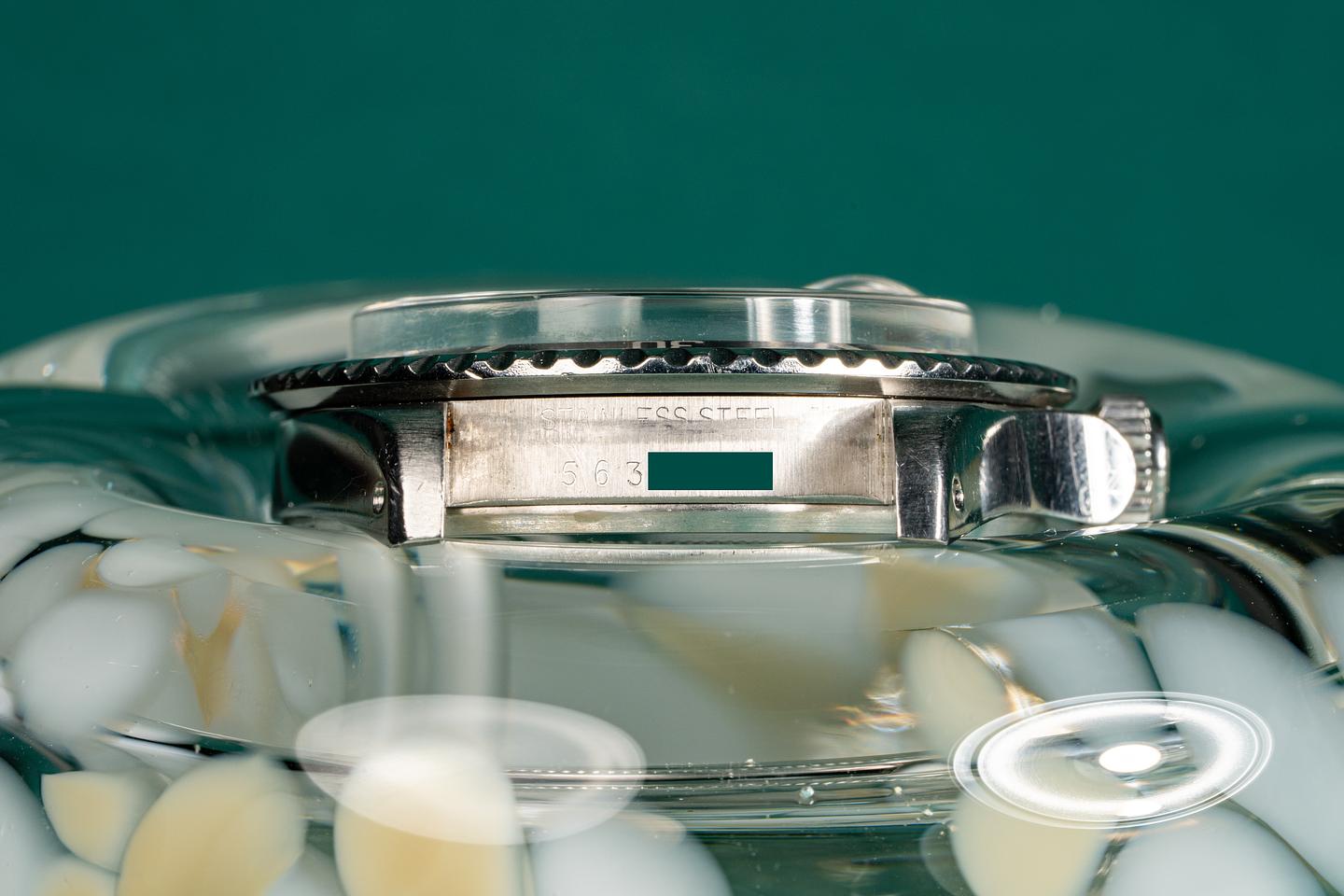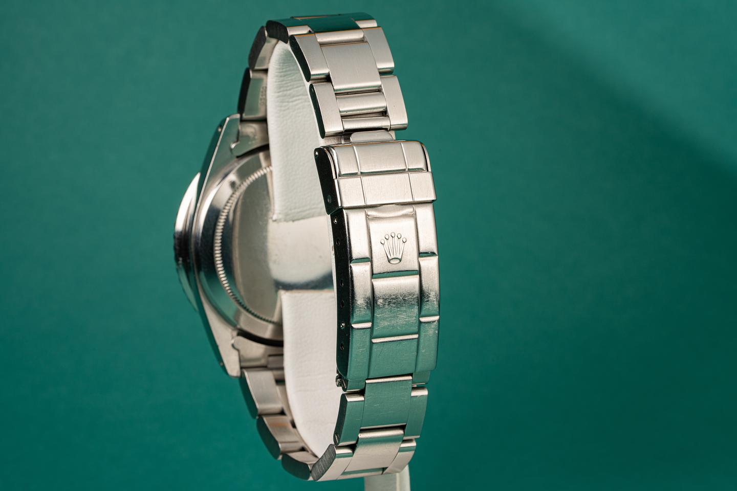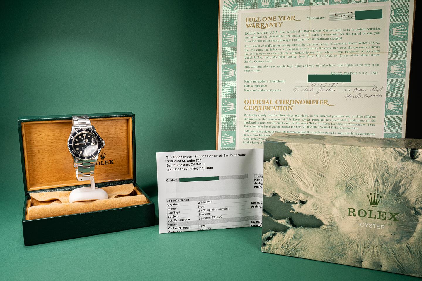 Thick case, beautiful dial, older top hat plastic crystal, faded navy bezel insert, great band, punched papers, fully serviced... Pretty much the perfect package white dial 1680 that will take more abuse than you will be comfortable giving it. The 70's date Submariners have a softness to the black portion of the dials that makes them extremly pleasing to look at. The hands have faded to a darker hue than the dial but are original to the watch. Not everything always fades at the same rate and that makes these pieces even more interesting. The watch comes with the original silver date disk. The case has been polished in the past but is thick and even and has a light bevel that is still visible. There is a slightly deeper battle scar on the 7 o'clock lug which is visible in the photos. The newer 93150 bracelet has 11 links and very light stretch from use. The watch has just been fully serviced and comes with a newer Rolex box and the original punched papers that are dated 12/15/1983.