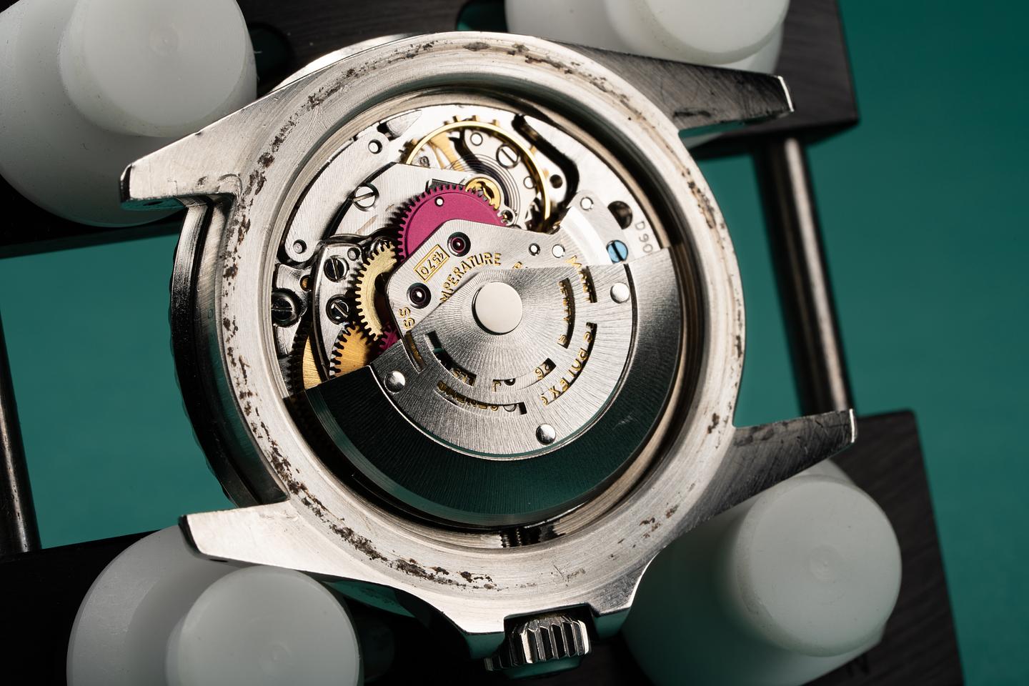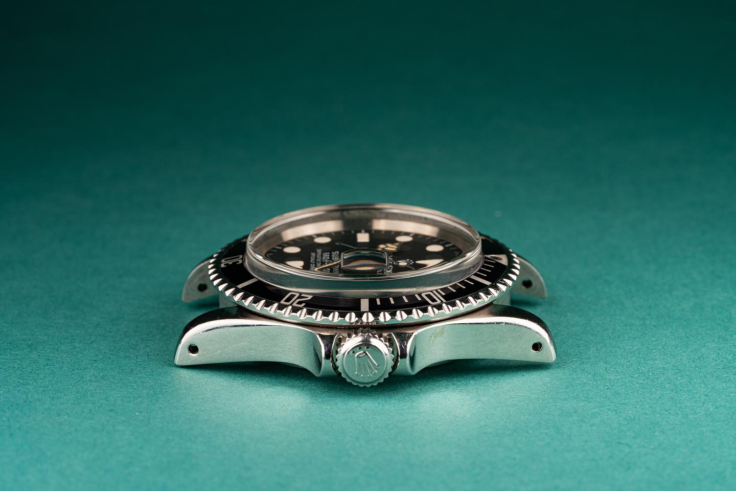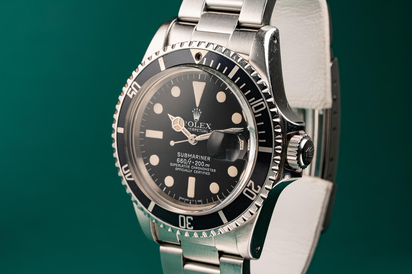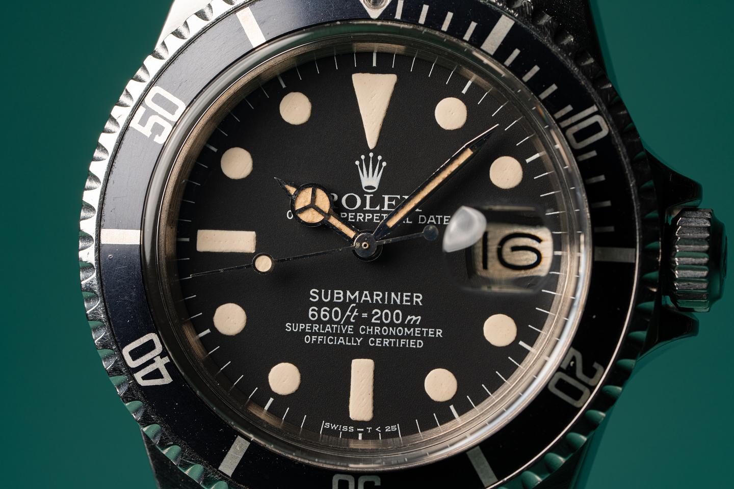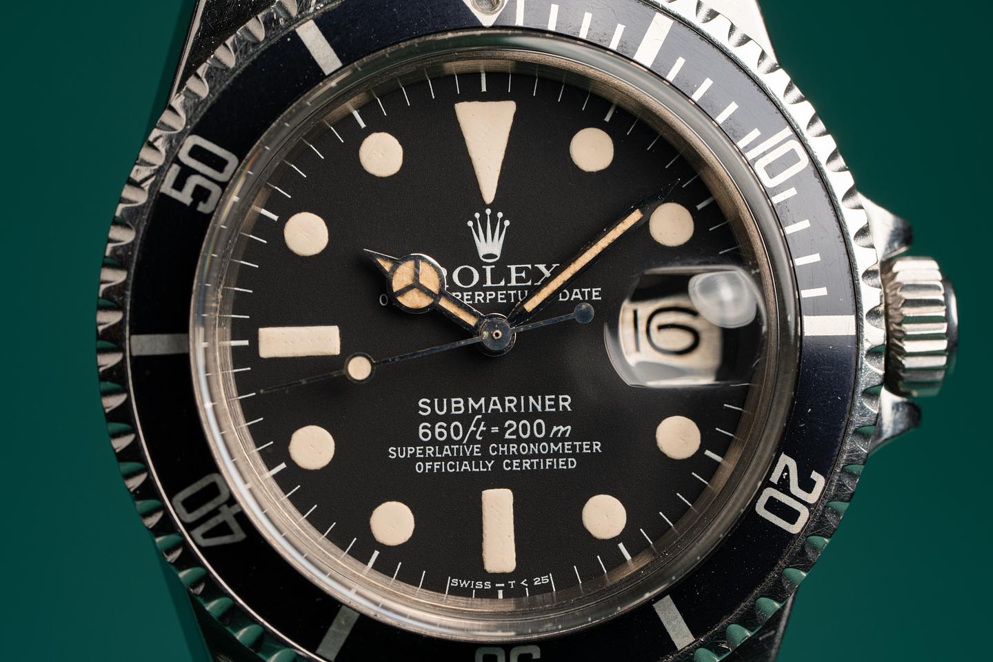 Thick case, beautiful dial, older top hat plastic crystal, faded navy bezel insert, great band, punched papers, fully serviced... Pretty much the perfect package white dial 1680 that will take more abuse than you will be comfortable giving it. The 70's date Submariners have a softness to the black portion of the dials that makes them extremly pleasing to look at. The hands have faded to a darker hue than the dial but are original to the watch. Not everything always fades at the same rate and that makes these pieces even more interesting. The watch comes with the original silver date disk. The case has been polished in the past but is thick and even and has a light bevel that is still visible. There is a slightly deeper battle scar on the 7 o'clock lug which is visible in the photos. The newer 93150 bracelet has 11 links and very light stretch from use. The watch has just been fully serviced and comes with a newer Rolex box and the original punched papers that are dated 12/15/1983.