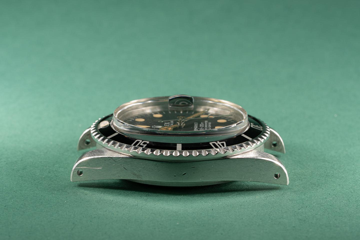 Case: The thick case is excellent with sharp prominent bevels. The case shows signs of wear with some light scratches present on the sides of the case. The black bezel insert is excellent and shows only very light wear.