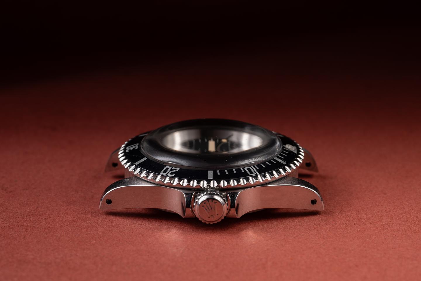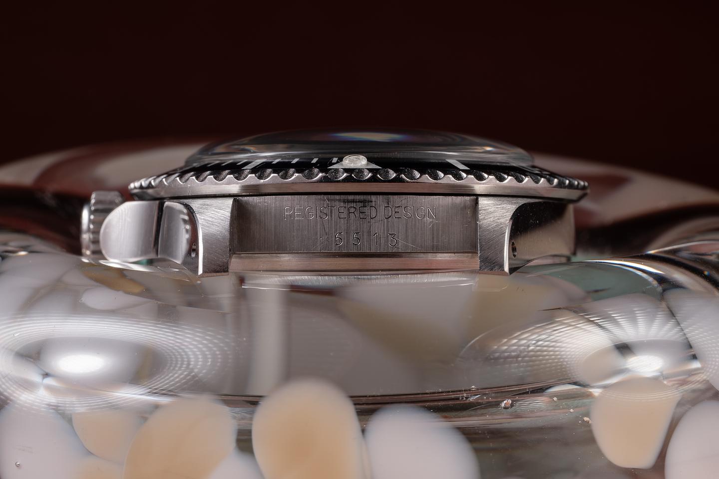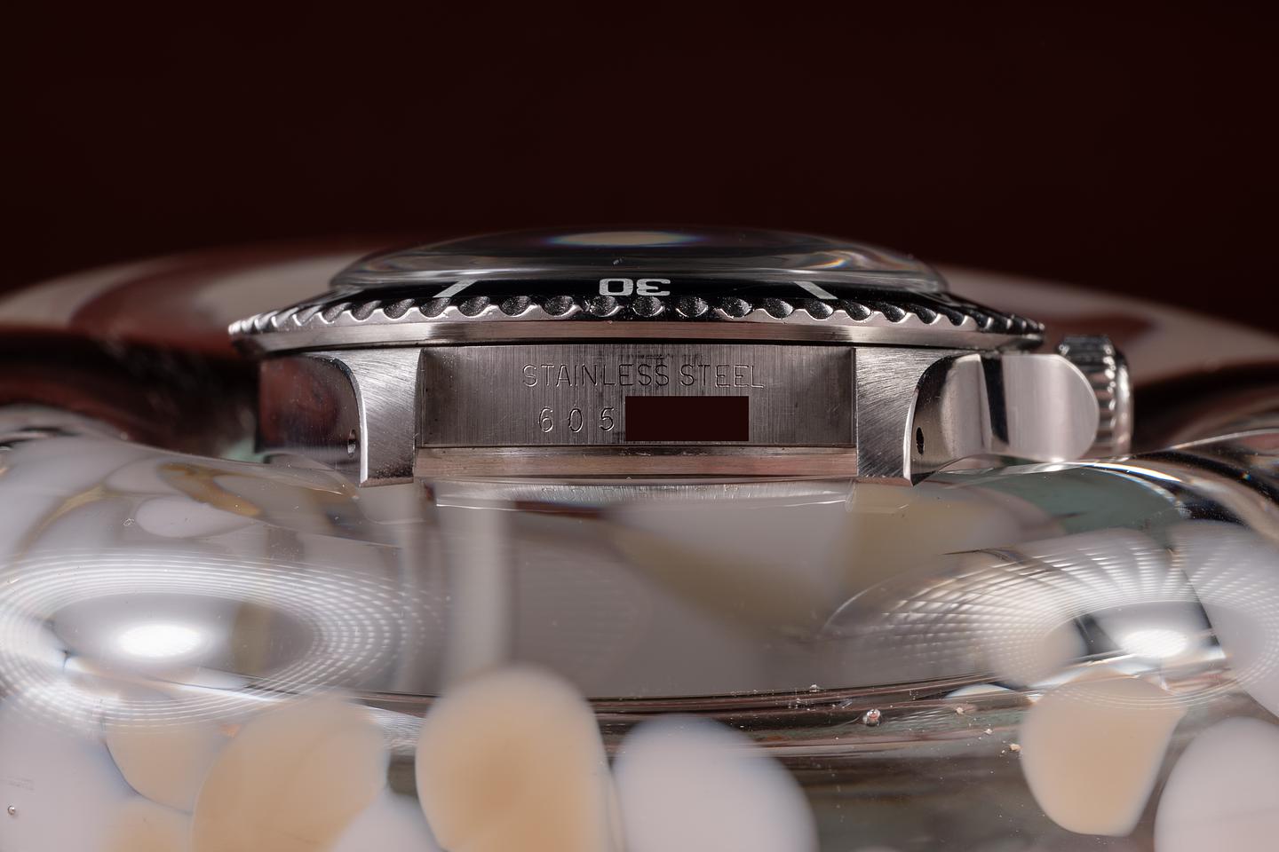 Case: The previously polished case is excellent, showing sharp, prominent bevels and only light wear from use. The bezel insert is also in excellent condition and has aged to a dark navy blue hue, showing only light wear from use.