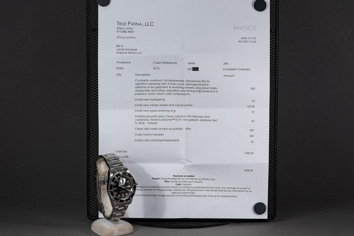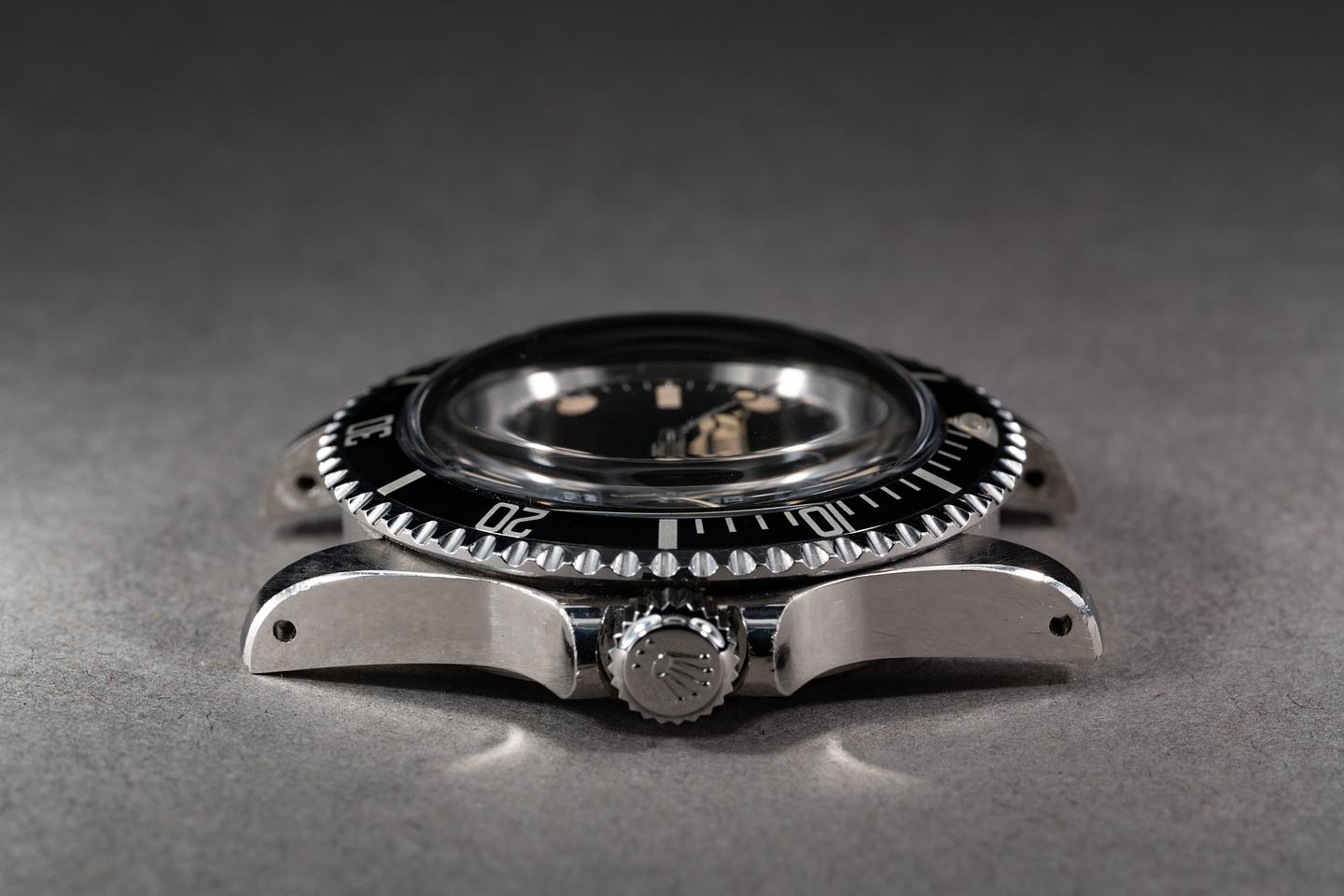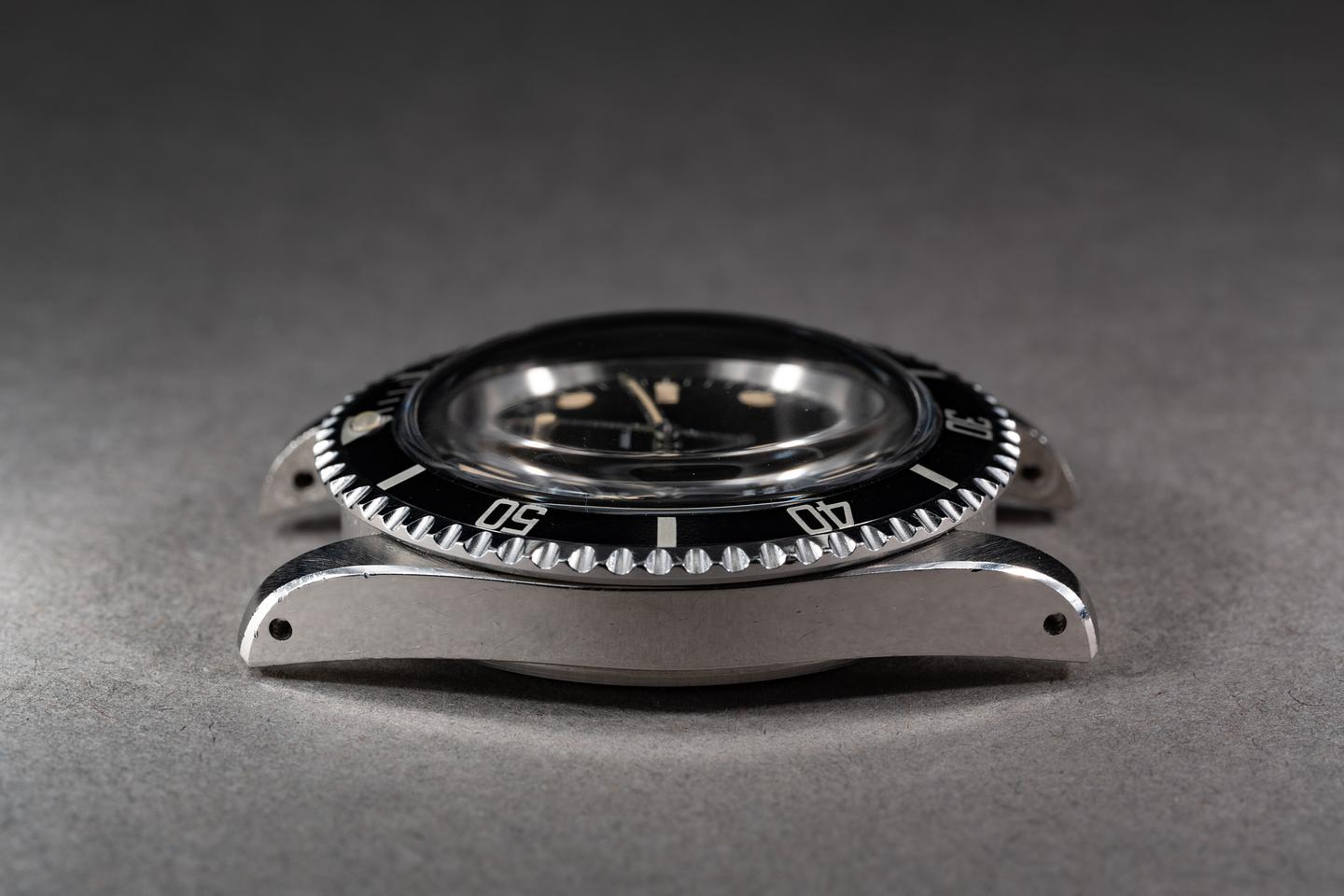 Case: The previously polished case is excellent showing wide sharp prominent bevels that closely resemble the factory profile. The case shows some light wear from use. The black bezel insert is also in excellent condition showing only very light wear from use.