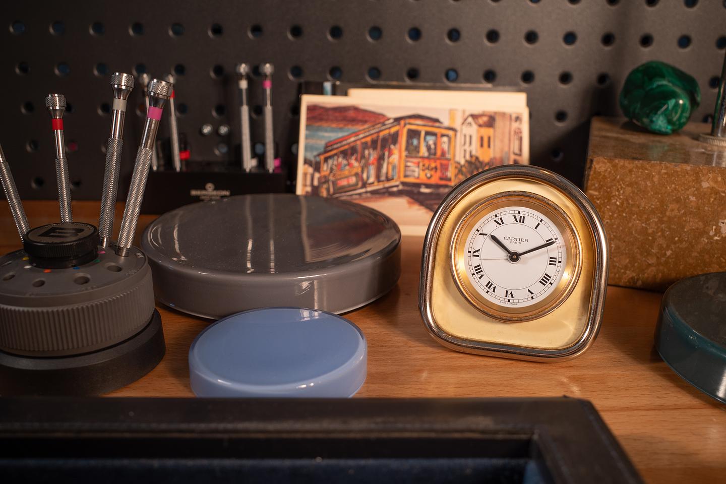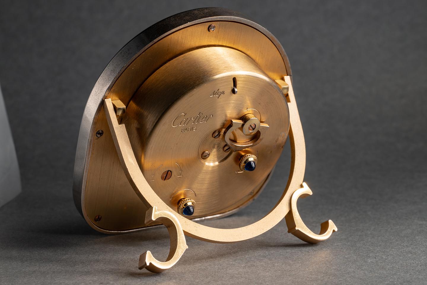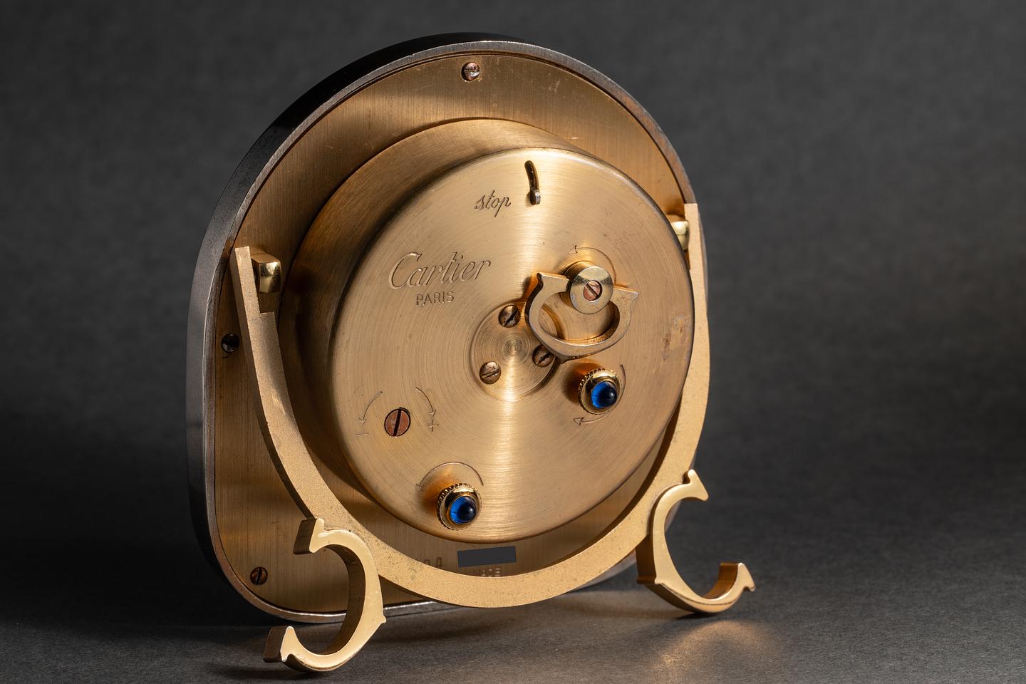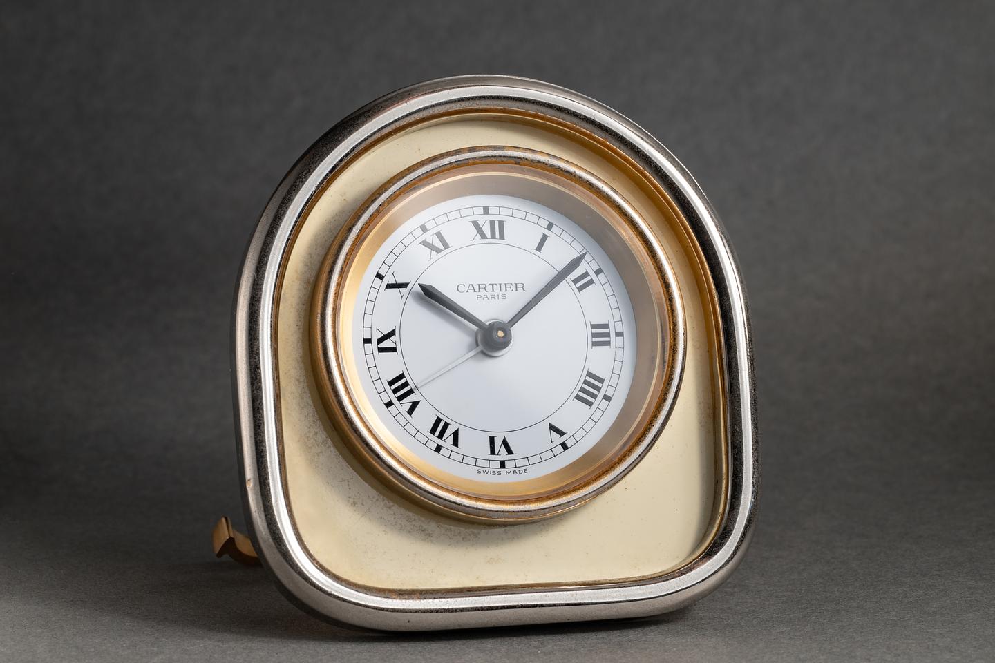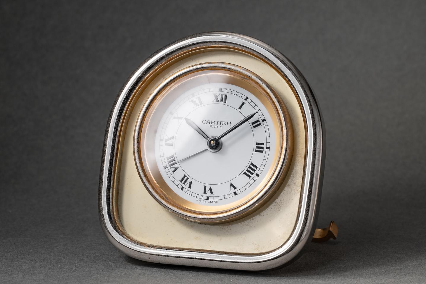 Case: The 4” x 3” x 1.8” brass case is excellent, showing only very light wear. The acrylic ivory bezel is also in excellent condition, showing only very light wear. The clock is powered by a hand-wound 8-day movement.