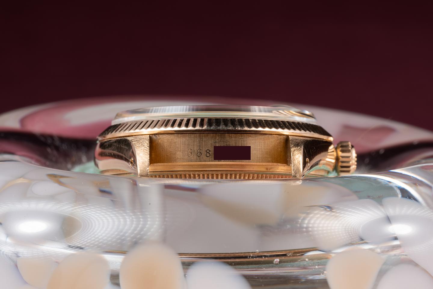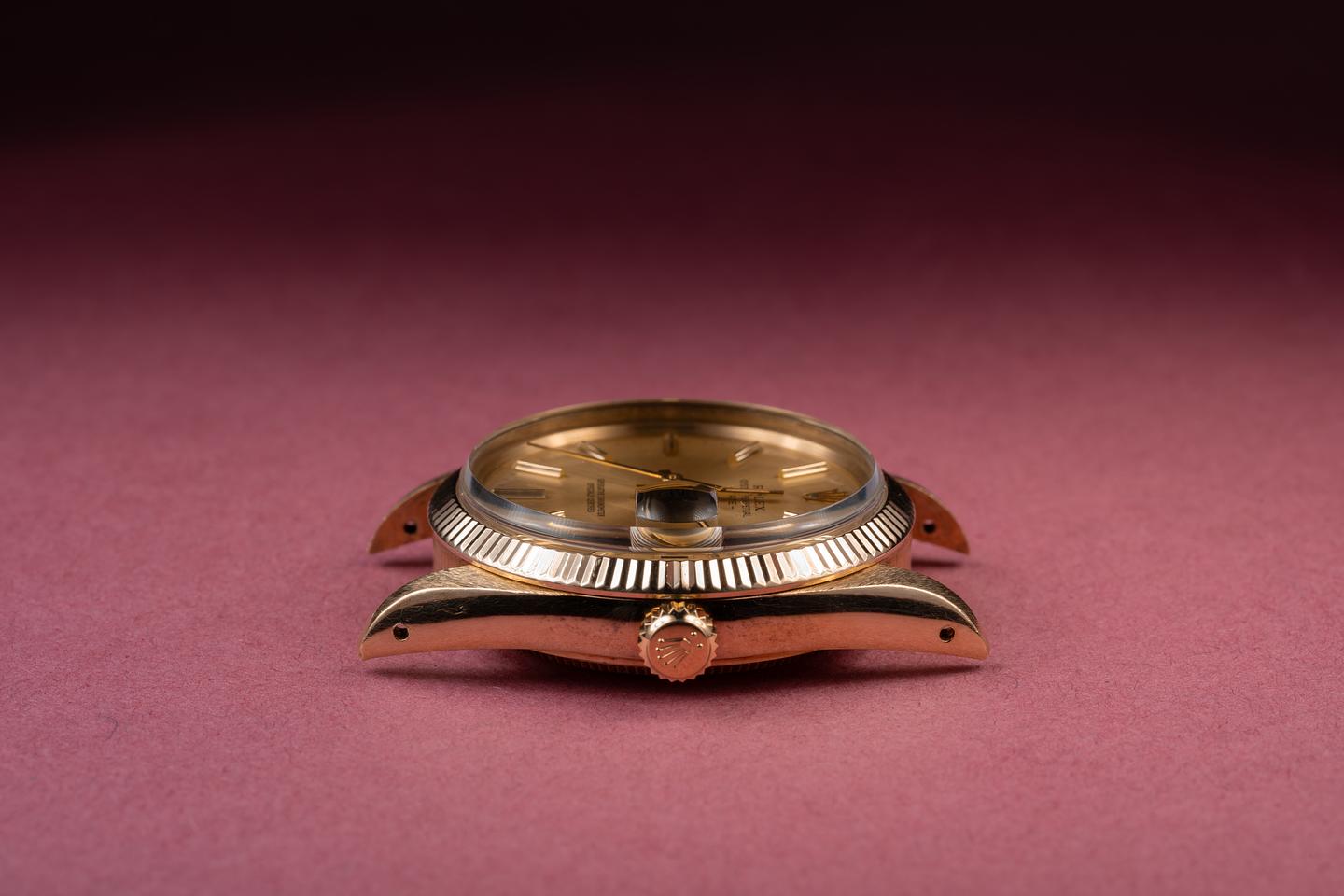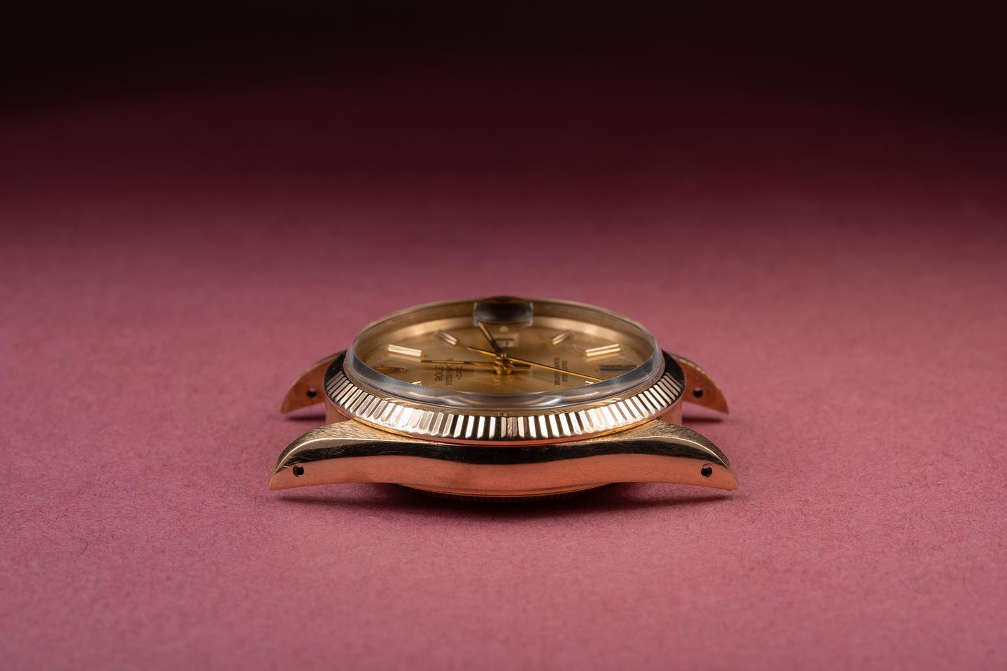 Case: The 34mm 14k yellow gold case is excellent showing only light wear from use. The sharp 18k yellow gold fluted bezel is also in excellent condition showing only light wear from use.
