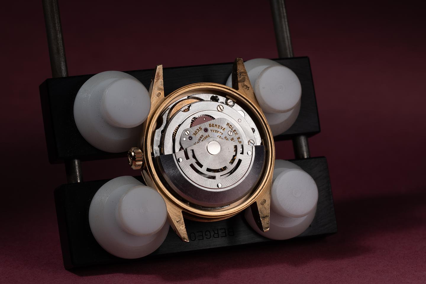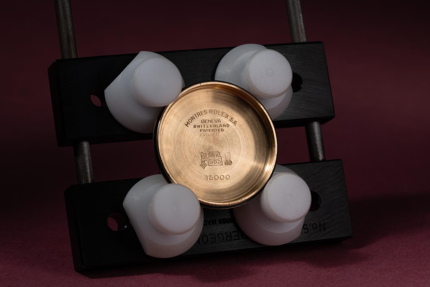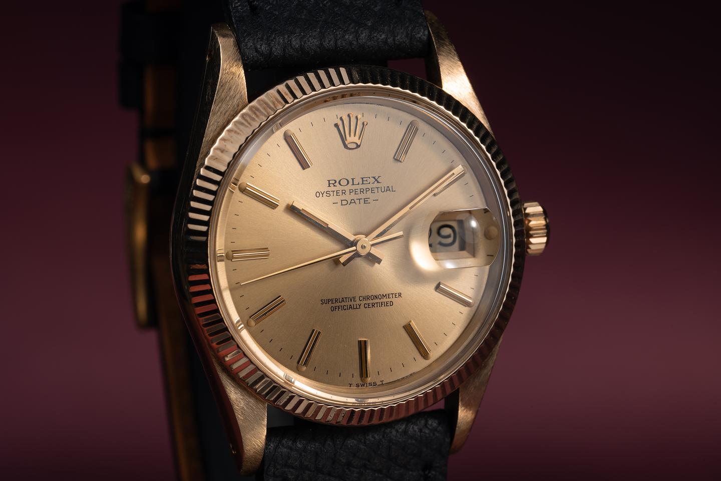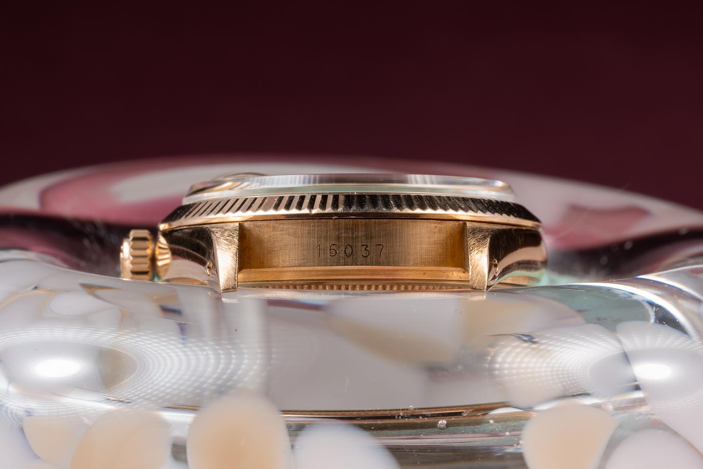 Case: The 34mm 14k yellow gold case is excellent showing only light wear from use. The sharp 18k yellow gold fluted bezel is also in excellent condition showing only light wear from use.