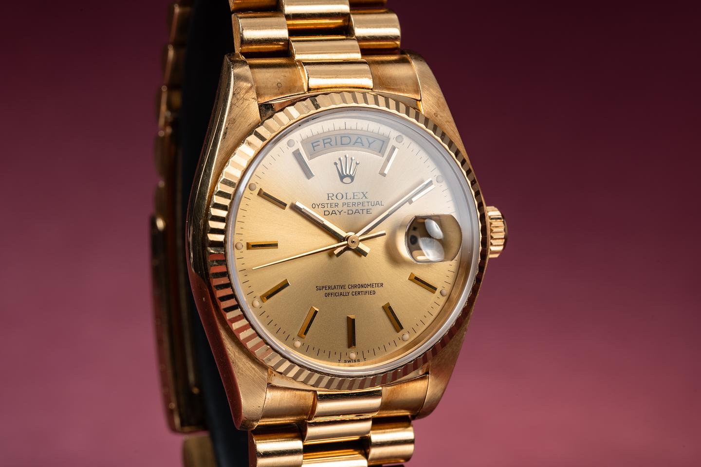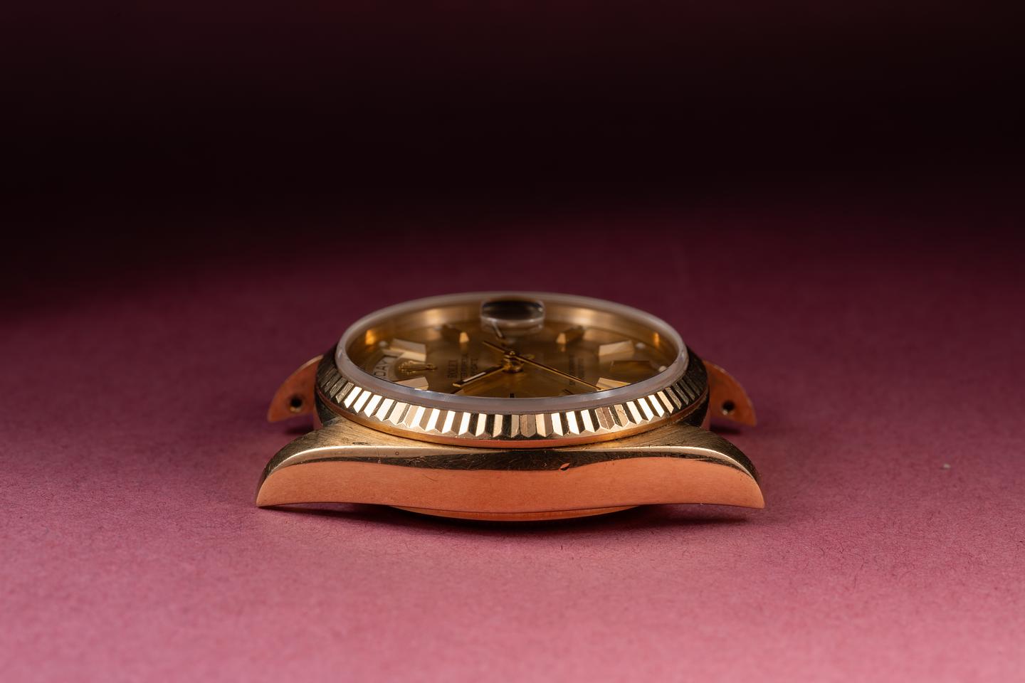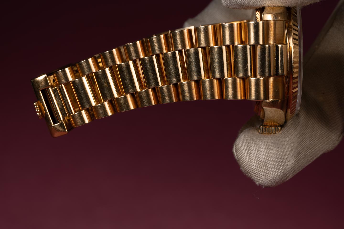 Bracelet: The 21 link 18K yellow gold president bracelet is excellent showing only light stretch for its age. The bracelet has aged to a warm rosy patina. The clasp is stamped with a matching 1981 date code. The bracelet will fit up to a 19.7 cm. / 7.7" wrist.