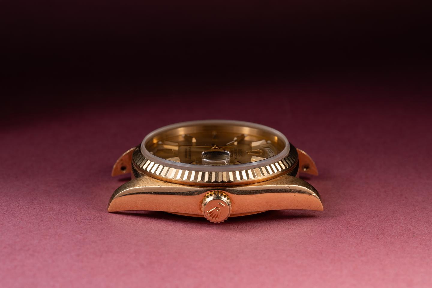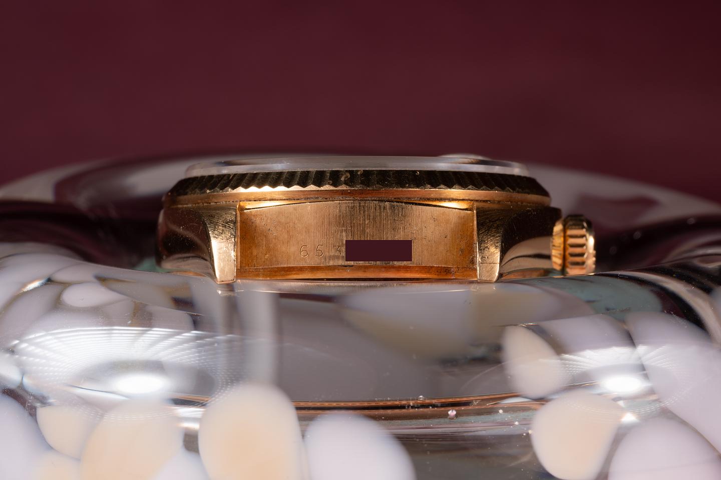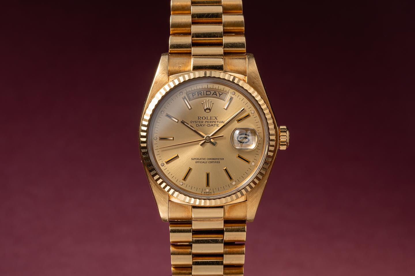 Bracelet: The 21 link 18K yellow gold president bracelet is excellent showing only light stretch for its age. The bracelet has aged to a warm rosy patina. The clasp is stamped with a matching 1981 date code. The bracelet will fit up to a 19.7 cm. / 7.7" wrist.