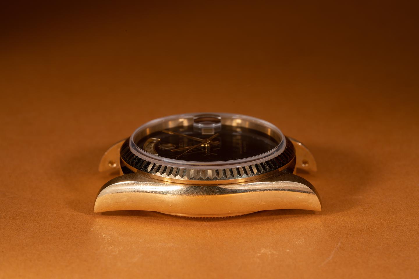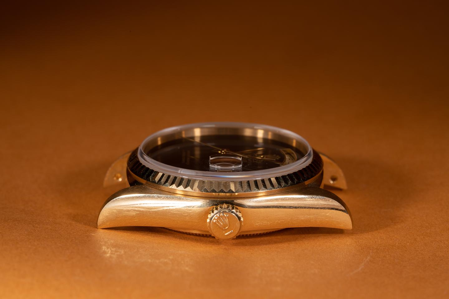 Case: The 18k yellow gold case is excellent showing only light wear from use. The sharp 18k yellow gold fluted bezel is also excellent showing only very light wear from use.