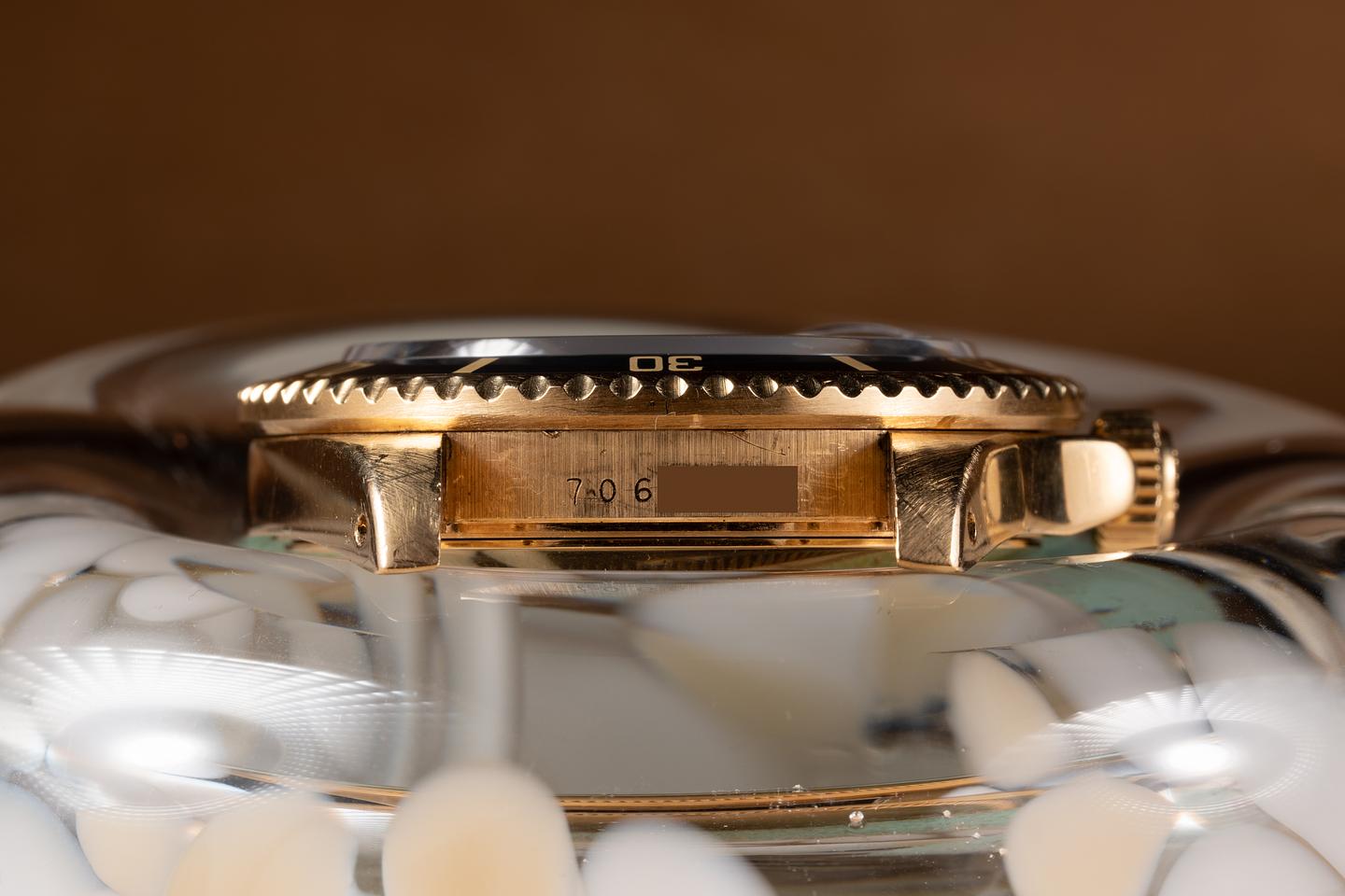 Case: The thick and even case appears to be unpolished showing some light wear from use. The black bezel insert is also in excellent condition and has faded to a satin charcoal black tone.