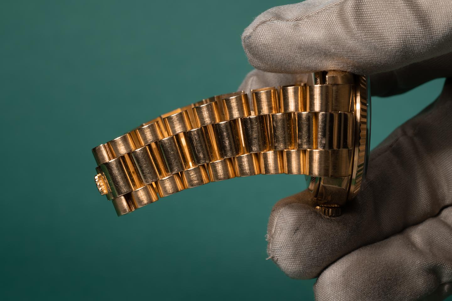 Bracelet: The 22 link 18k yellow gold president bracelet is excellent showing some light stretch for its age.