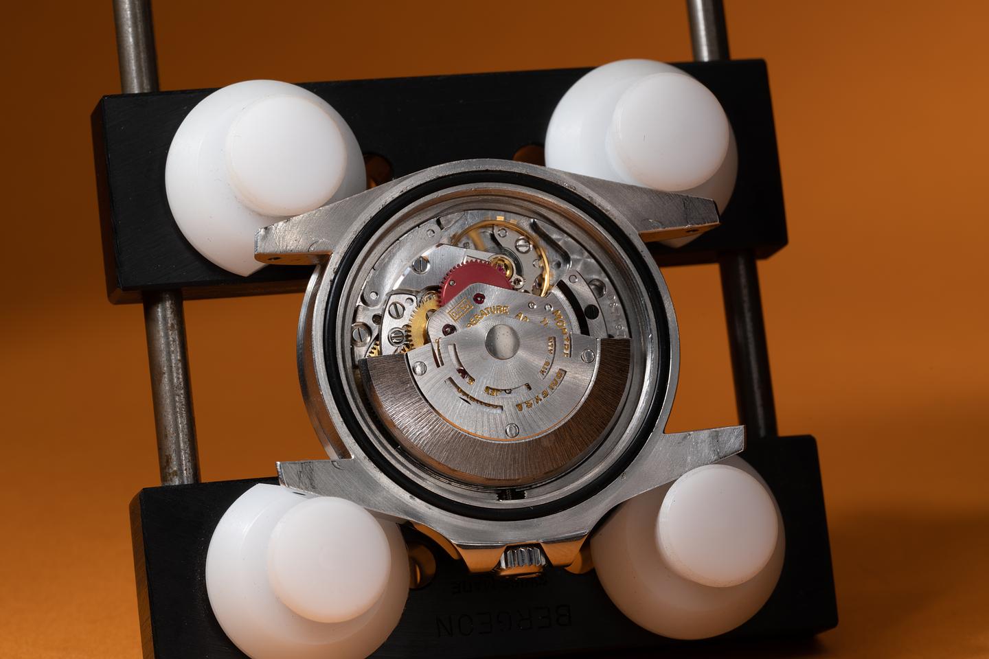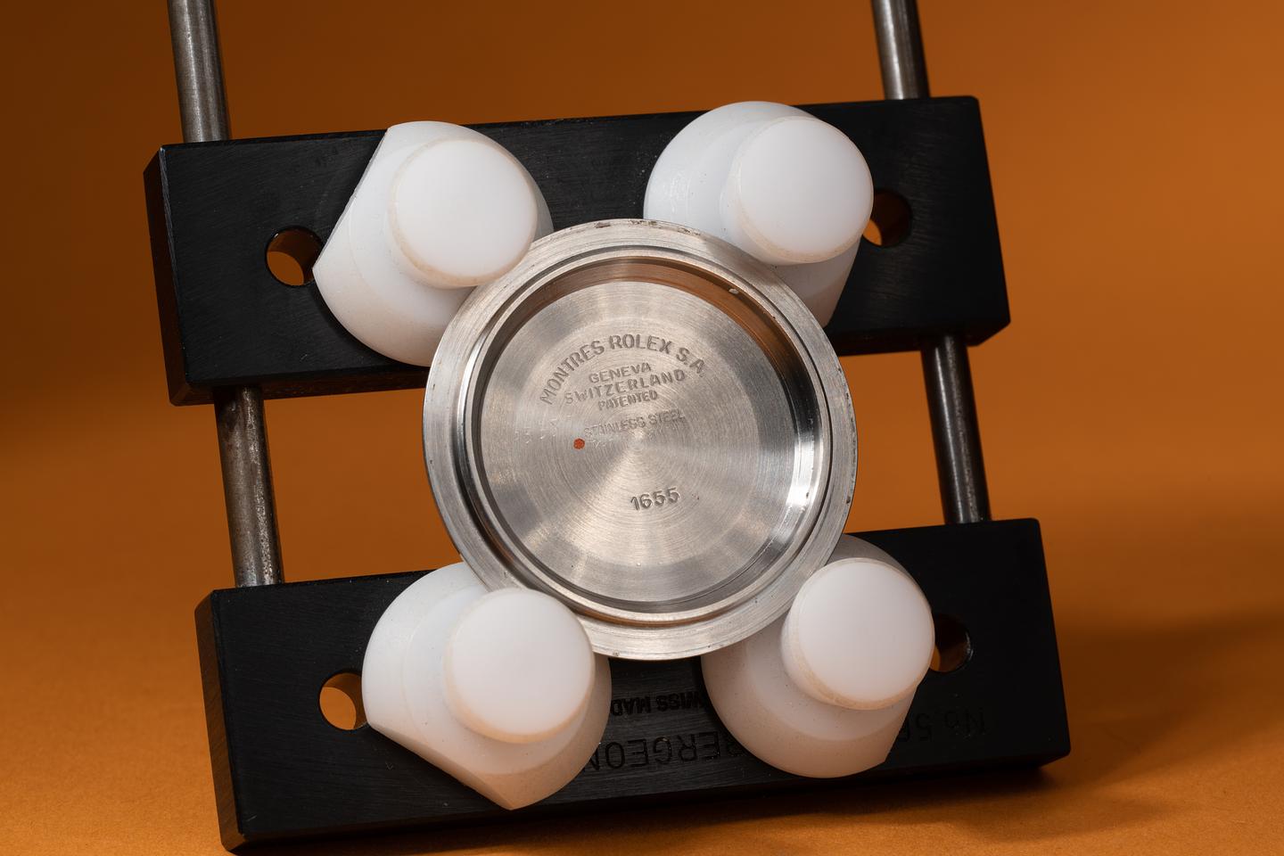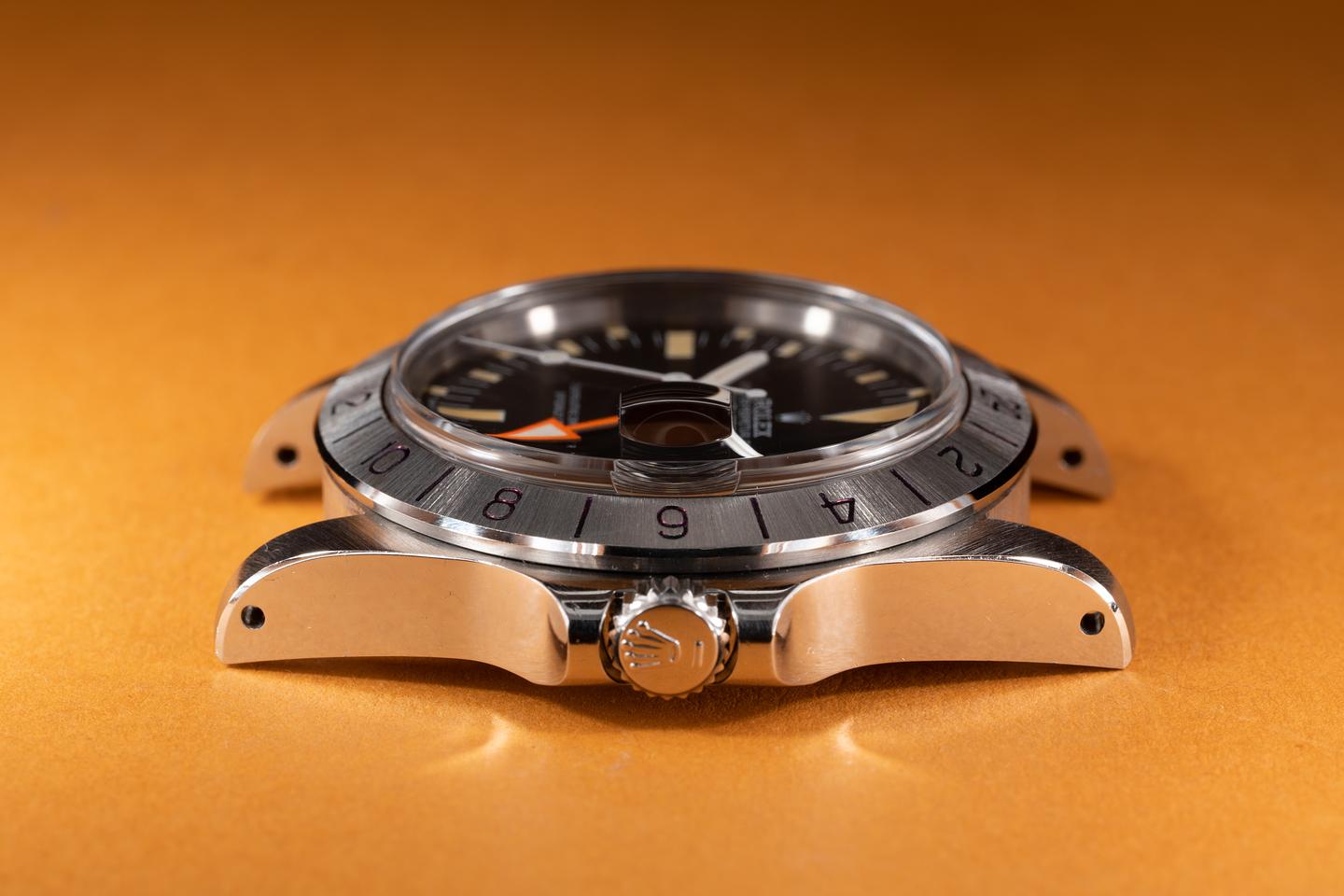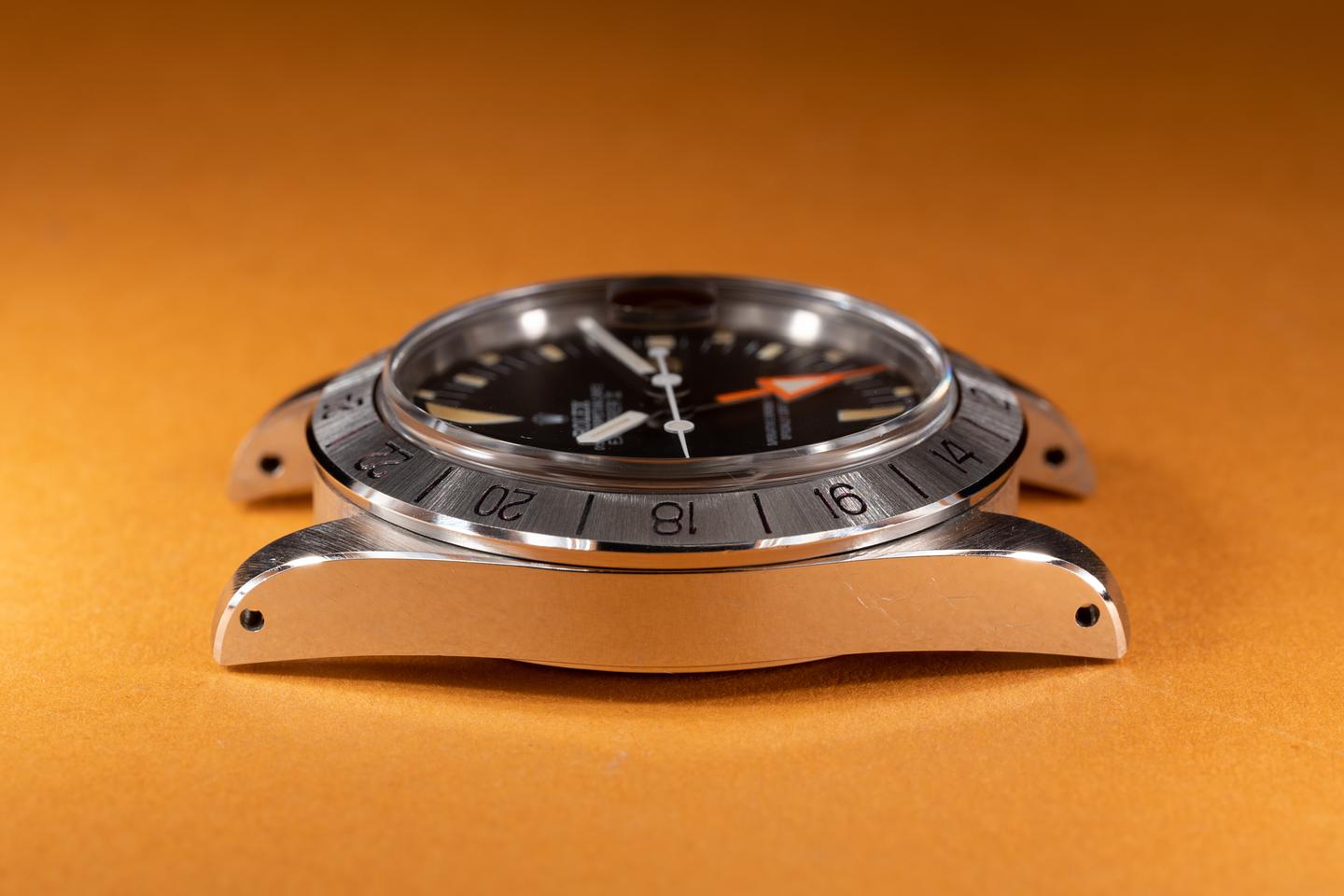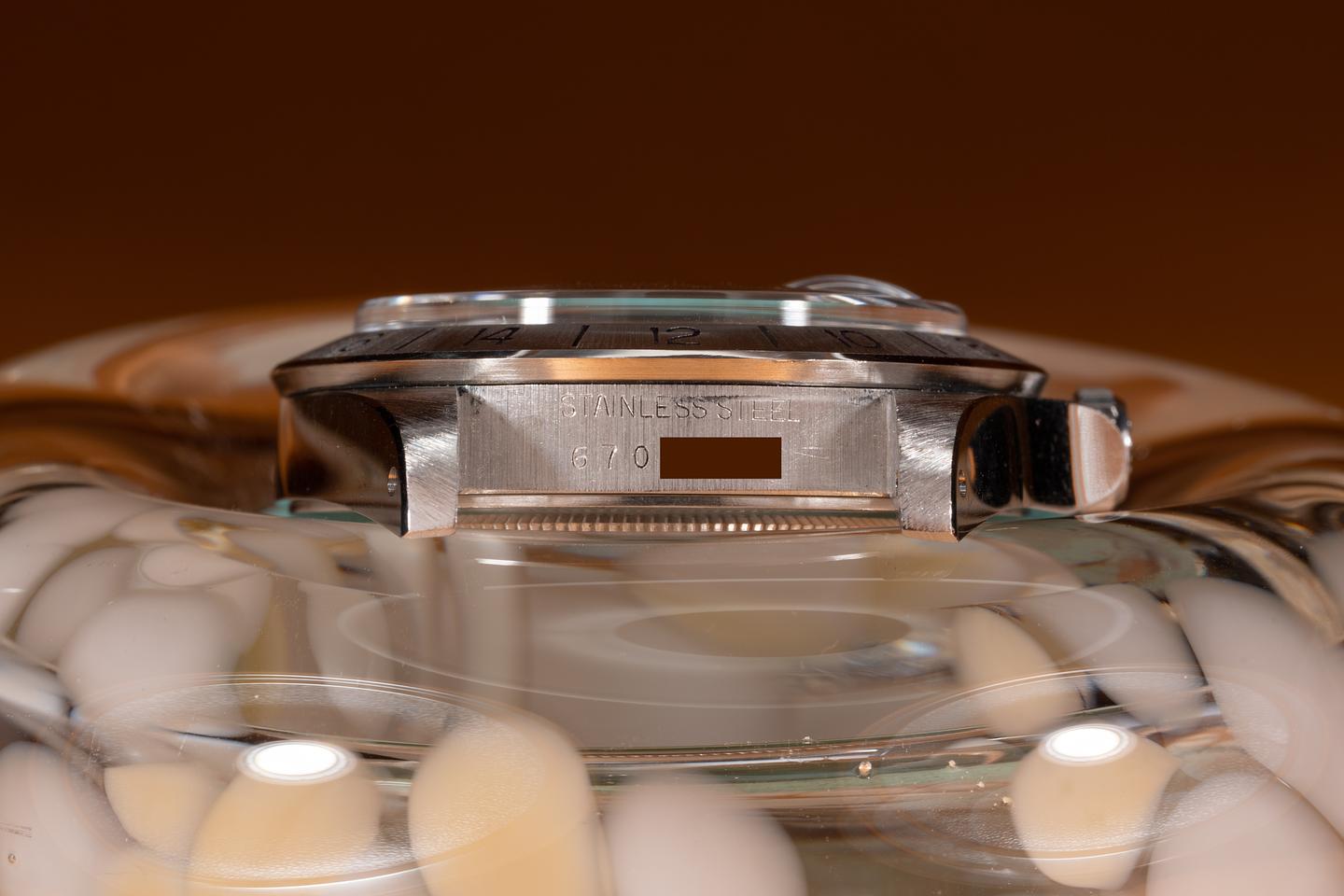 Case: The thick and even case has recently been polished showing sharp prominent bevels. The Stainless bezel is also in excellent condition showing only very light wear from use.