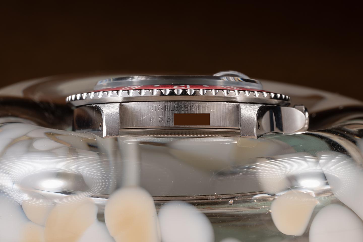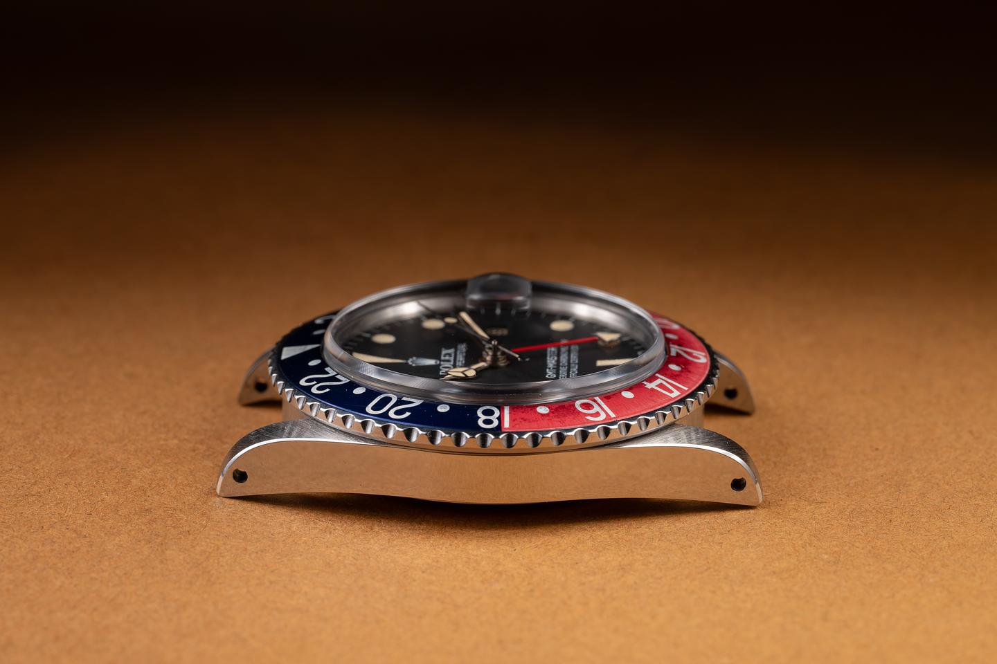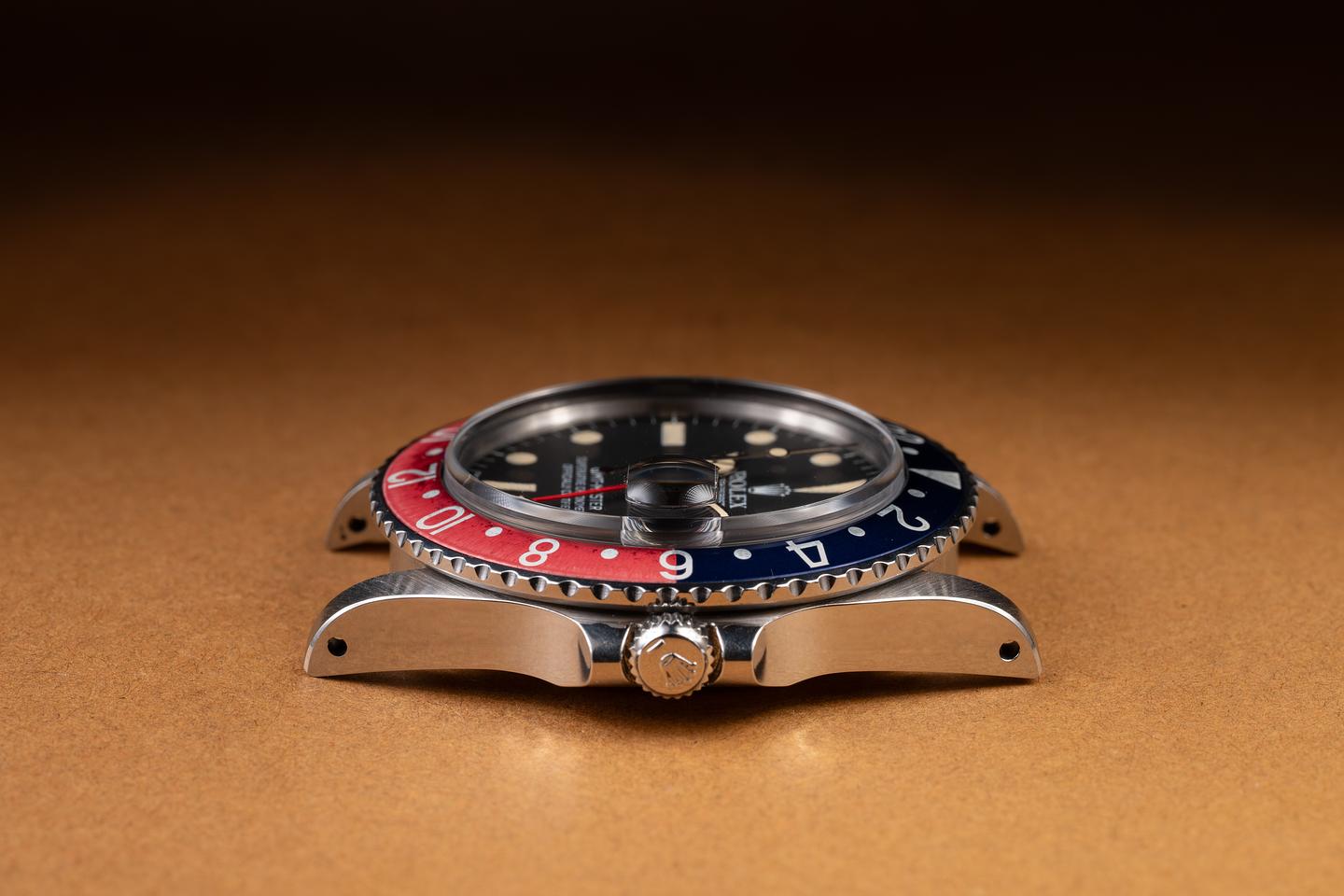 Case: The thick, even case is excellent, showing sharp, prominent bevels and only light wear from use. The blue and red "Pepsi" bezel insert is also in excellent condition, showing some light fading to the red portion of the insert.