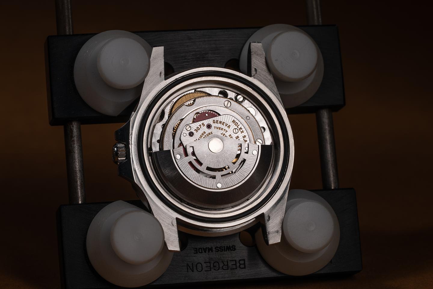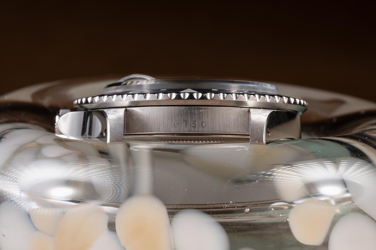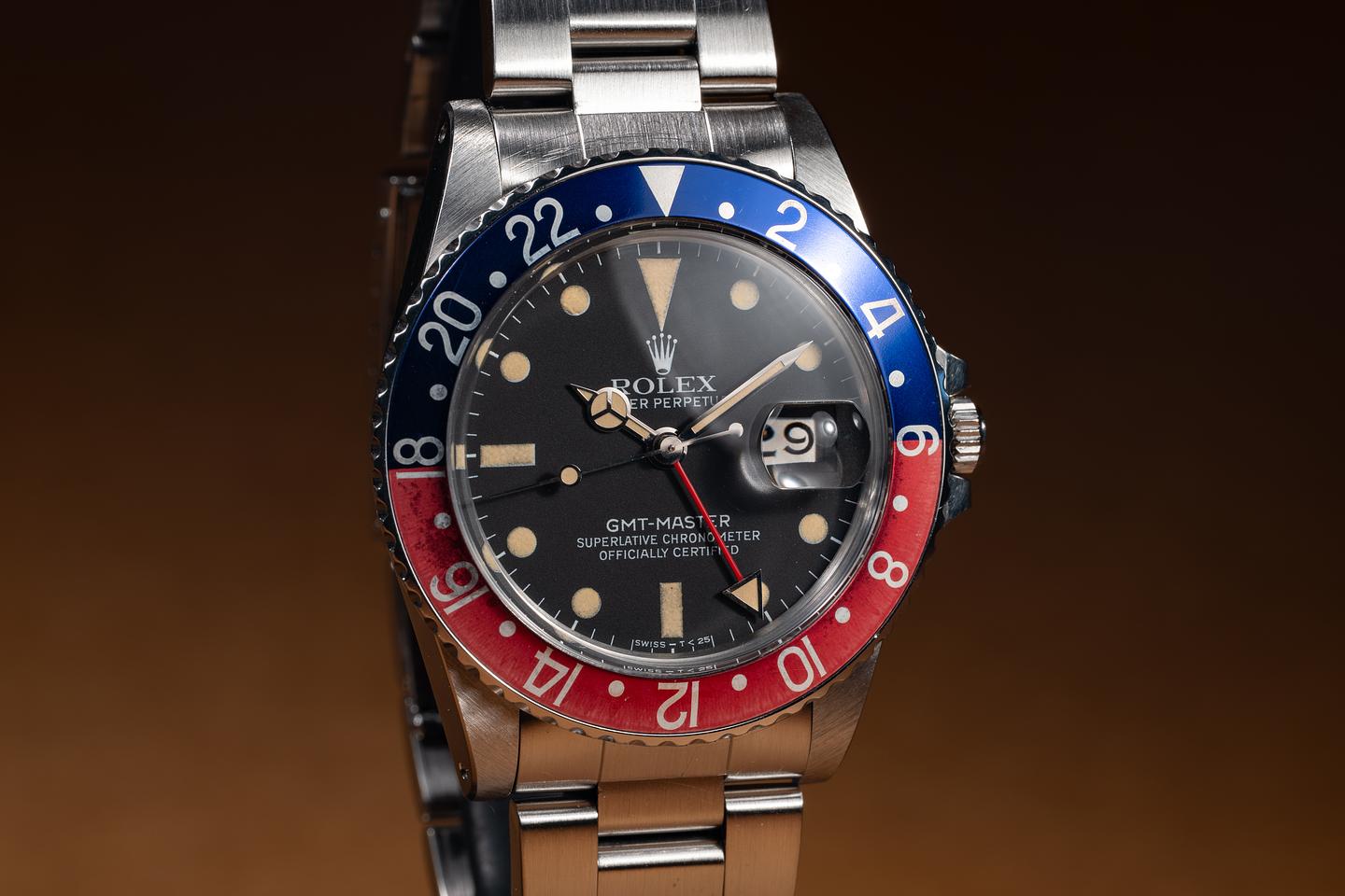 Case: The thick, even case is excellent, showing sharp, prominent bevels and only light wear from use. The blue and red "Pepsi" bezel insert is also in excellent condition, showing some light fading to the red portion of the insert.