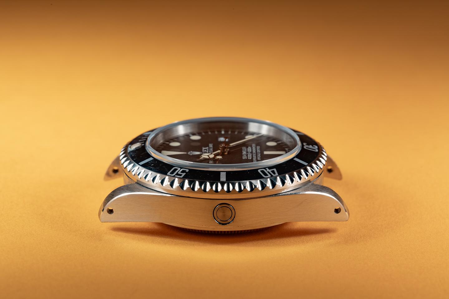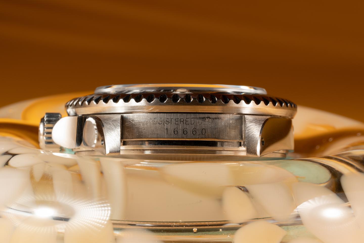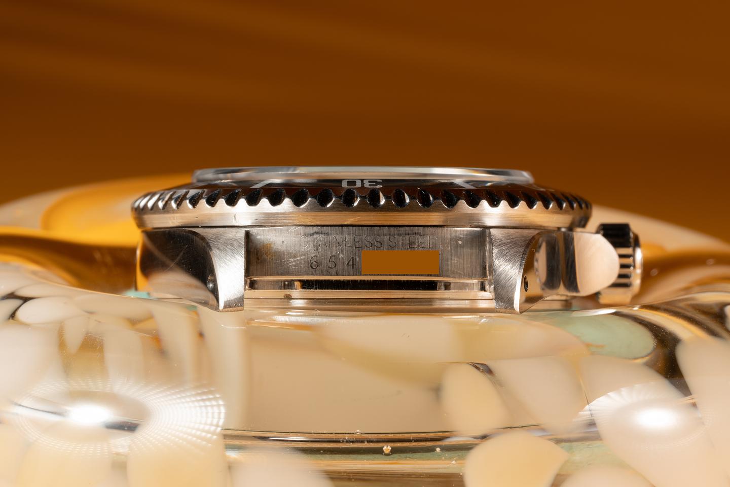 Case: The thick and even case is excellent showing sharp prominent bevels and only light wear from use. The black bezel insert is also in excellent condition showing some light wear from use. The bezel has faded to a dark navy blue hue.