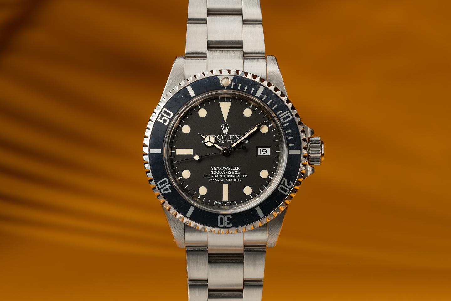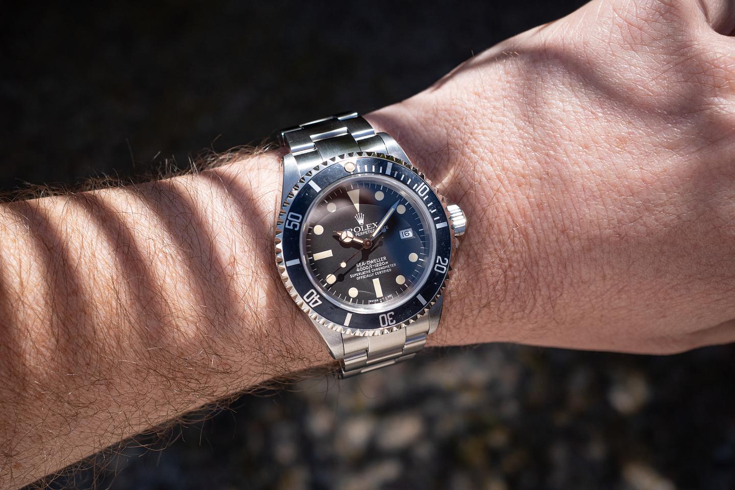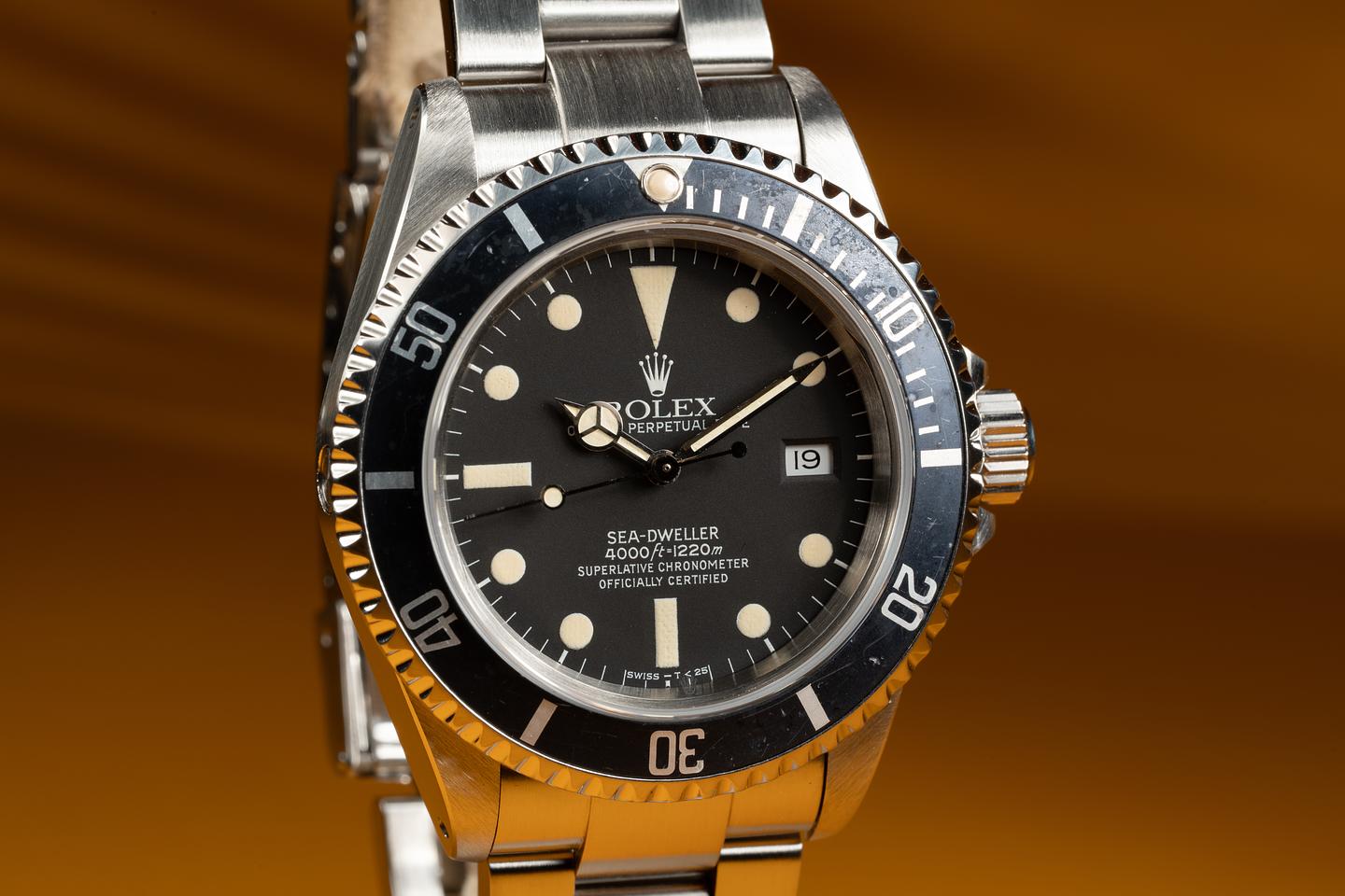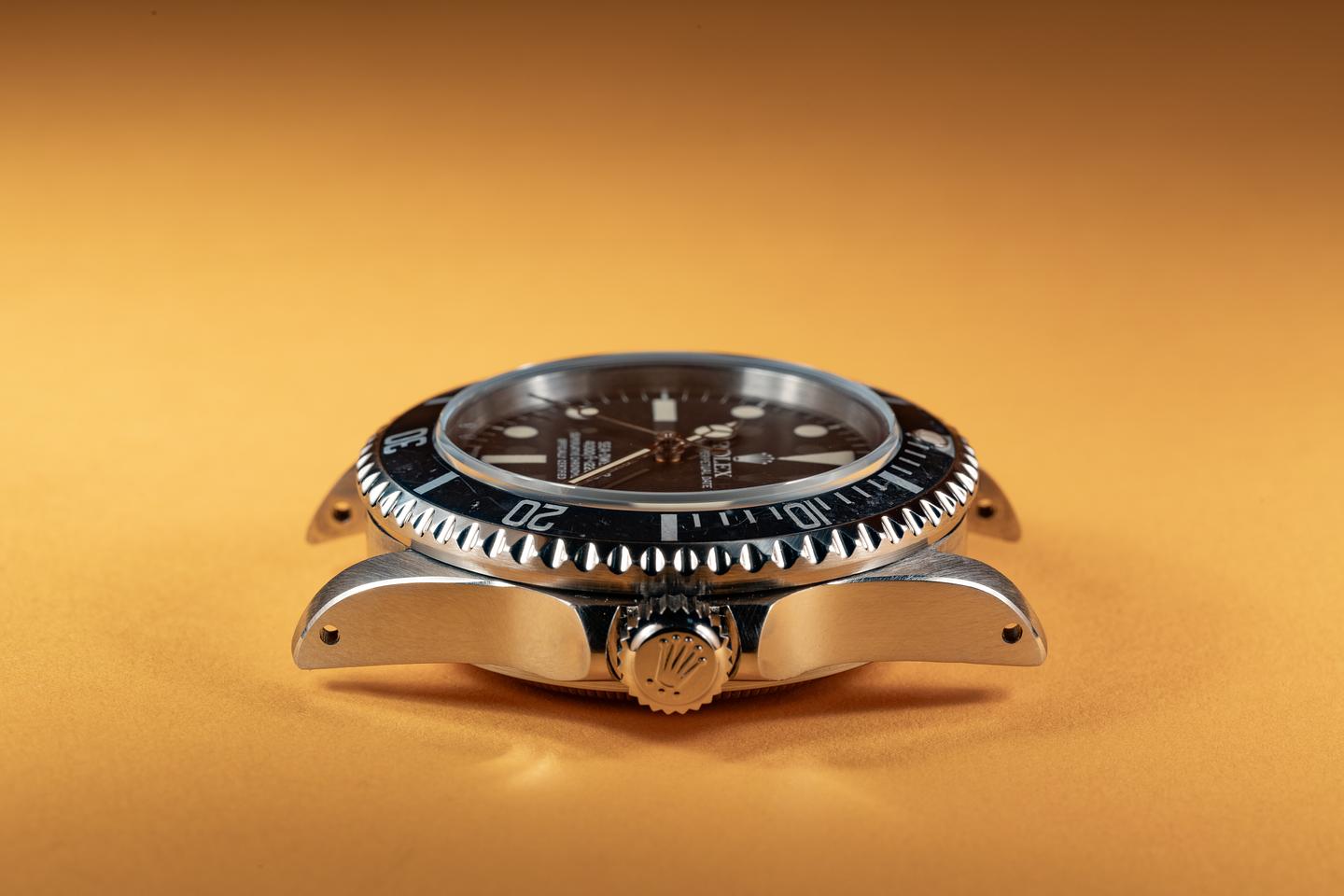 Case: The thick and even case is excellent showing sharp prominent bevels and only light wear from use. The black bezel insert is also in excellent condition showing some light wear from use. The bezel has faded to a dark navy blue hue.