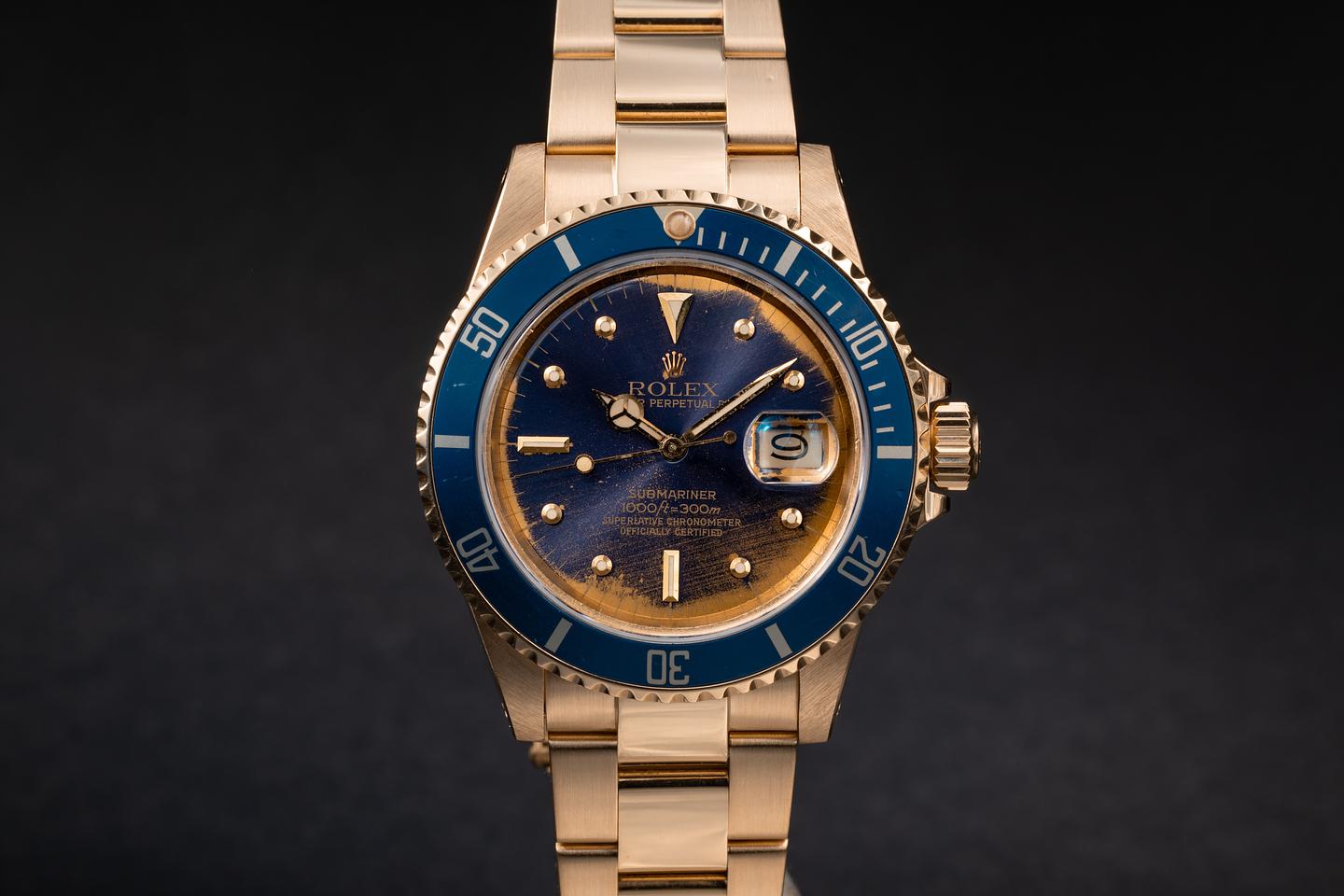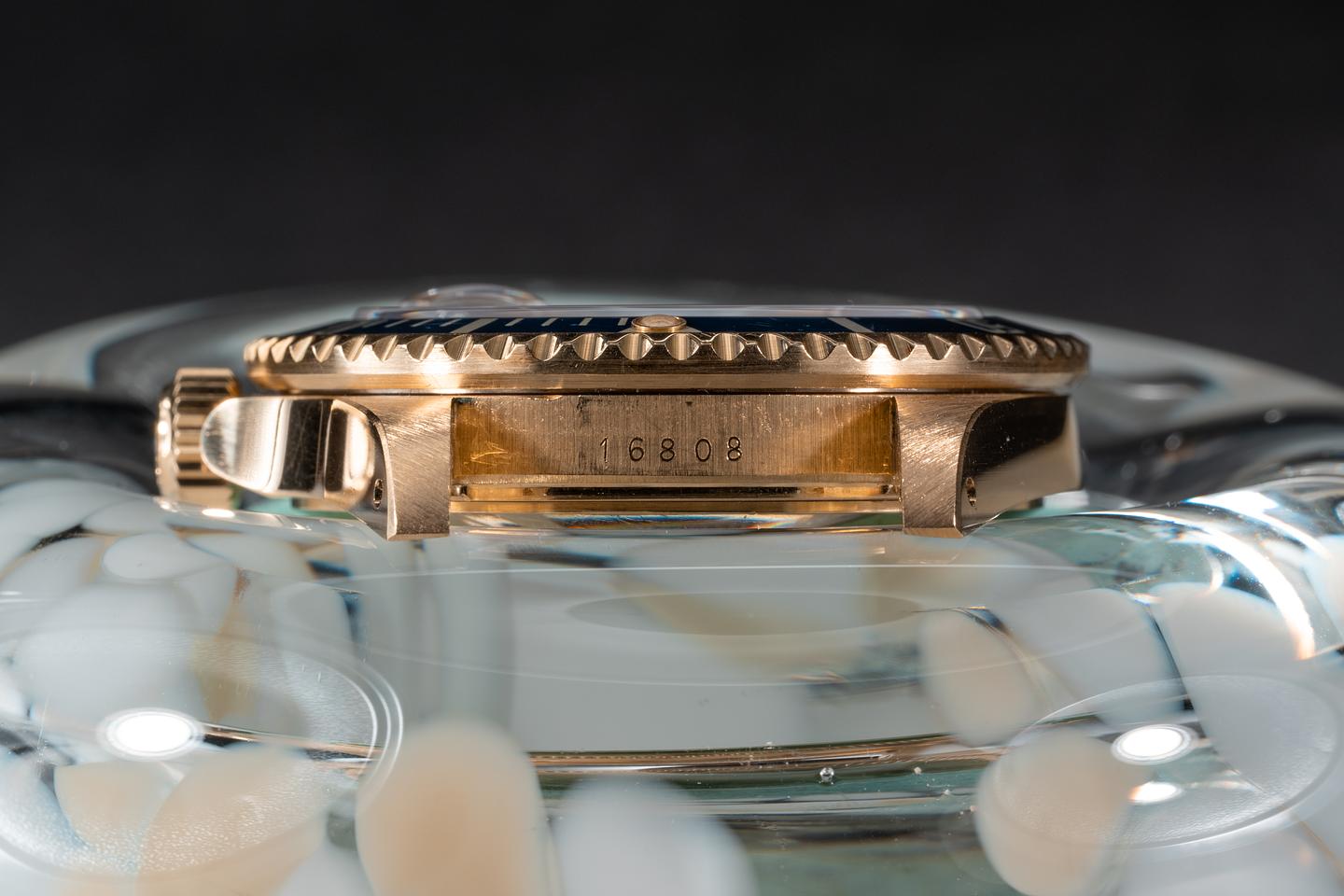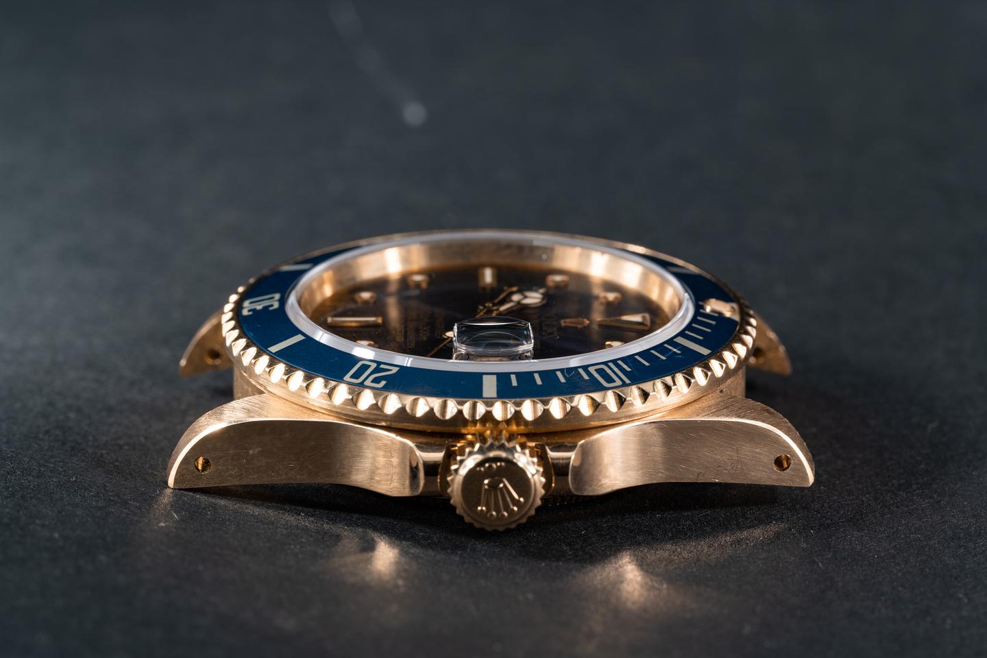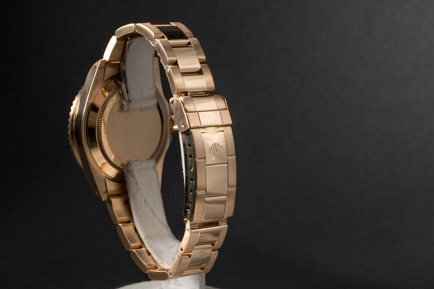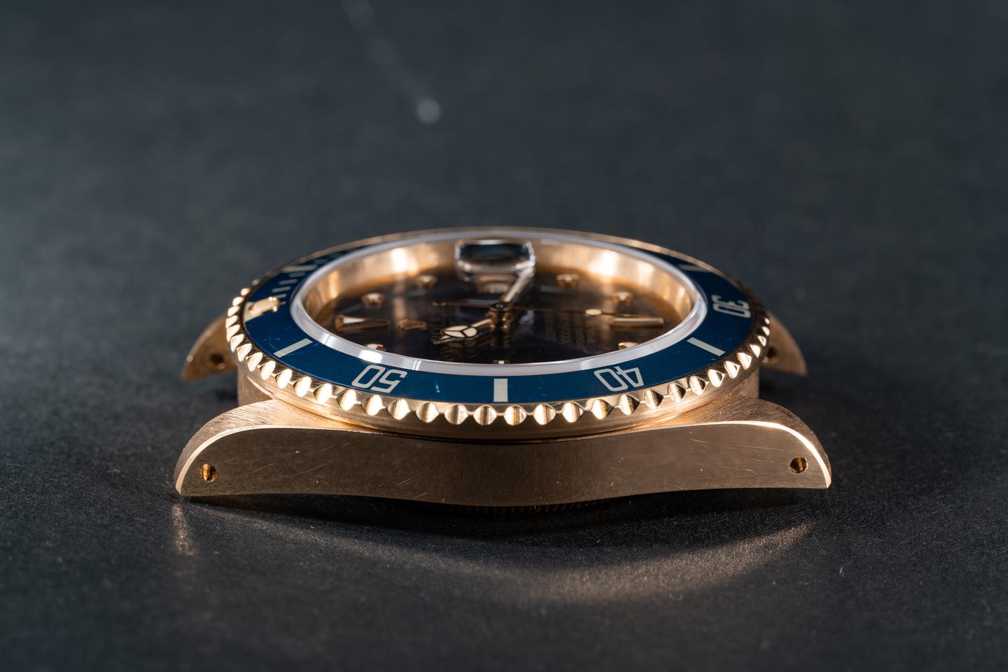 Case: The thick and even 18k yellow gold case is excellent showing sharp prominent bevels and only very light wear from use. The blue bezel insert is also in excellent condition showing only very light wear from use.