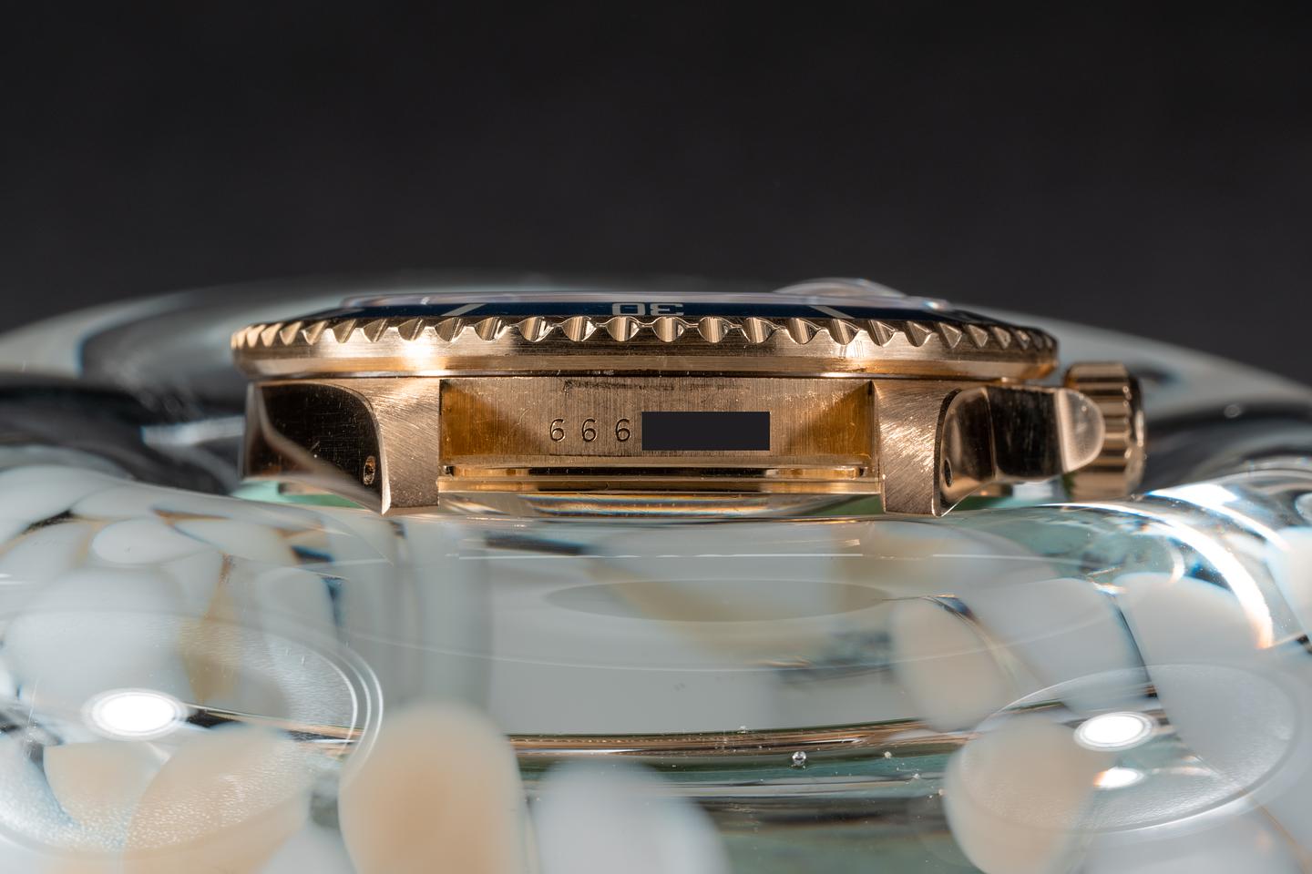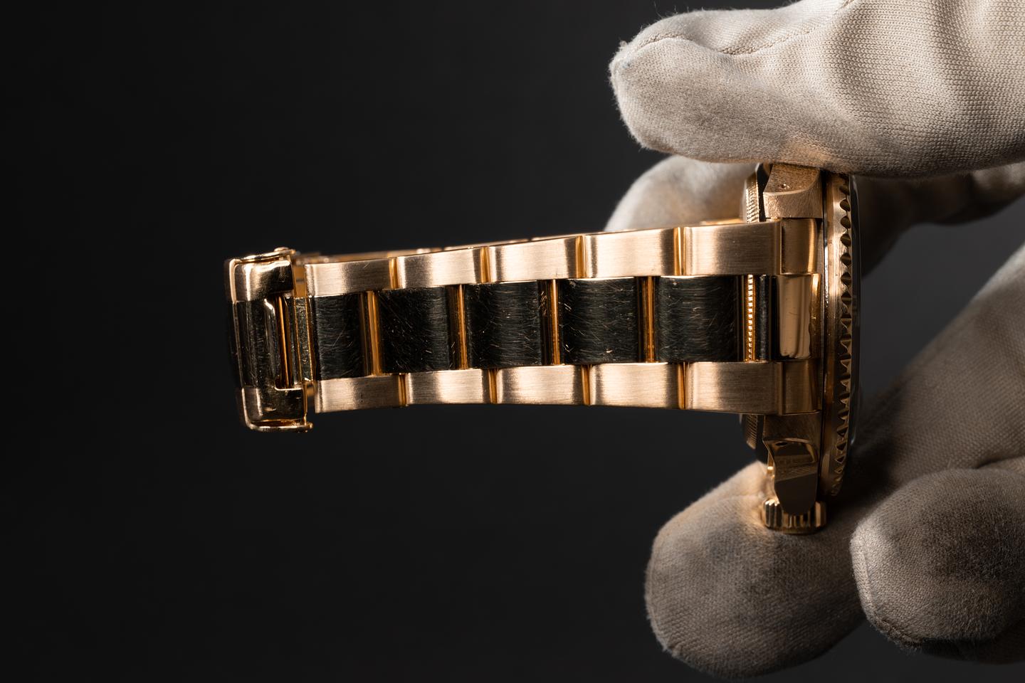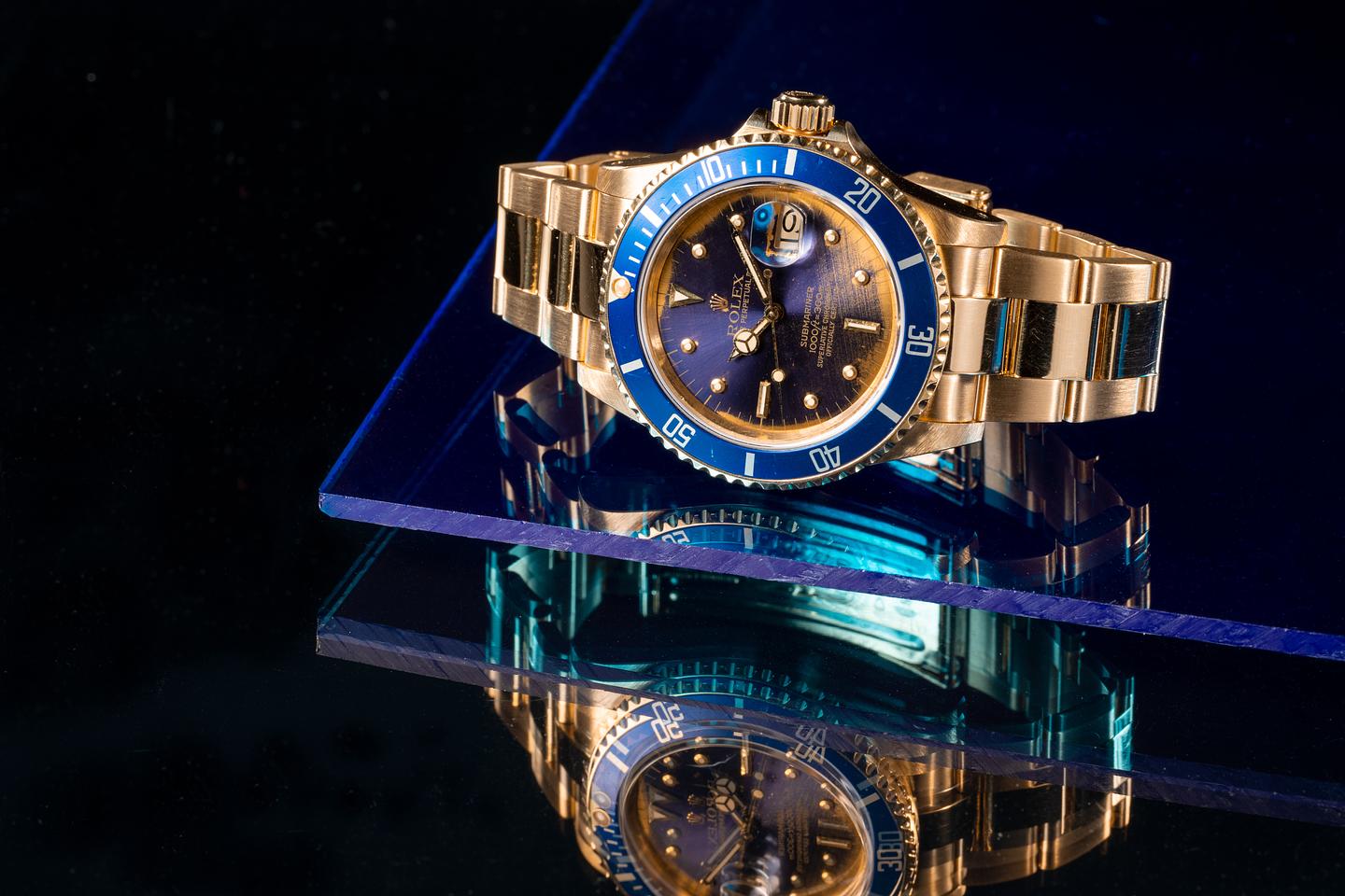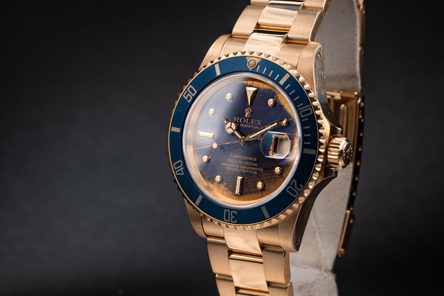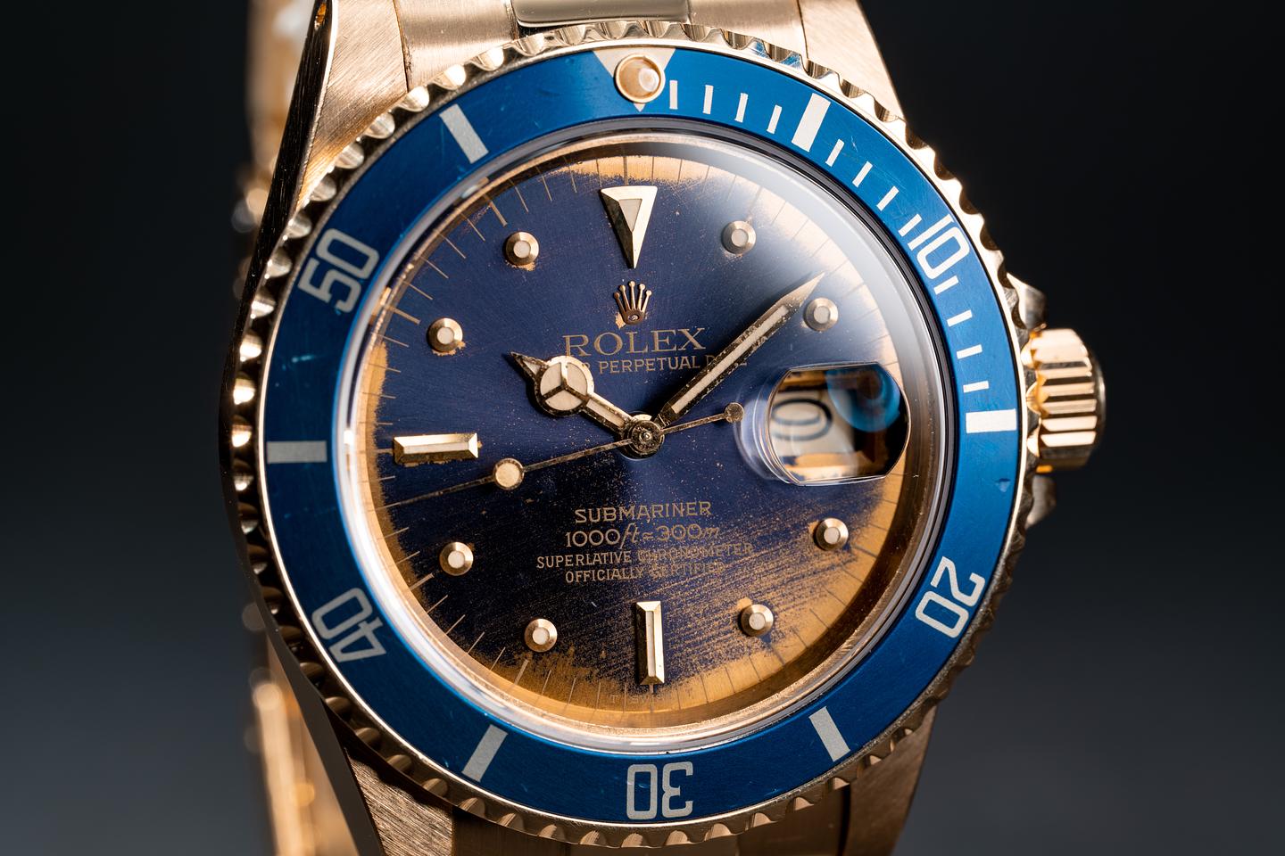 Case: The thick and even 18k yellow gold case is excellent showing sharp prominent bevels and only very light wear from use. The blue bezel insert is also in excellent condition showing only very light wear from use.