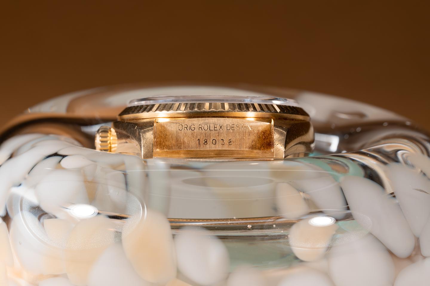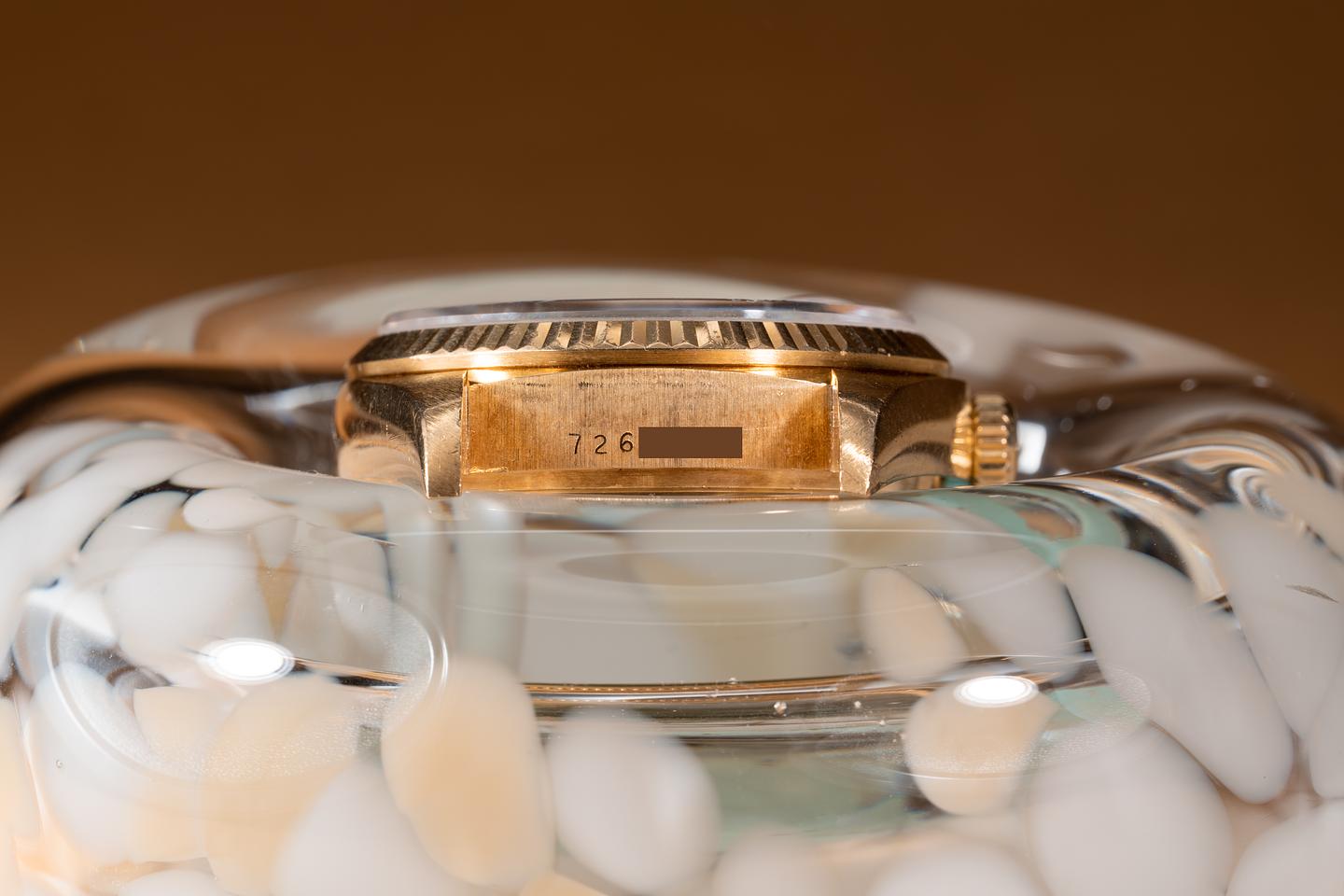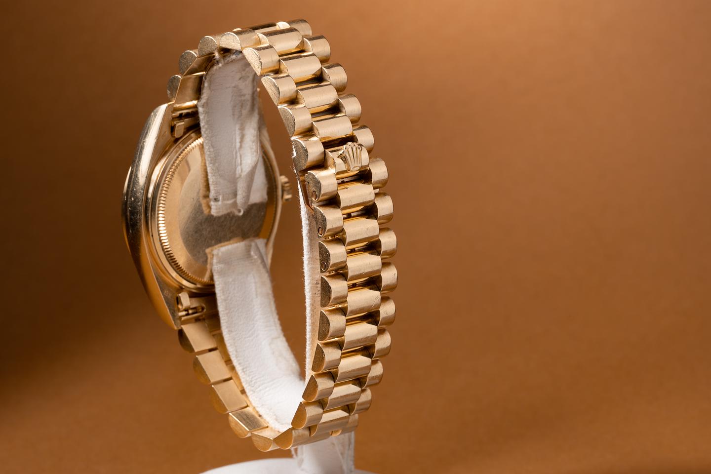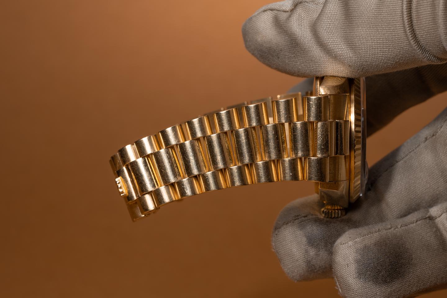 Bracelet: The 22 link 18k yellow gold president bracelet is excellent showing only light stretch for its age. The clasp is stamped with a matching 1982 date code.
