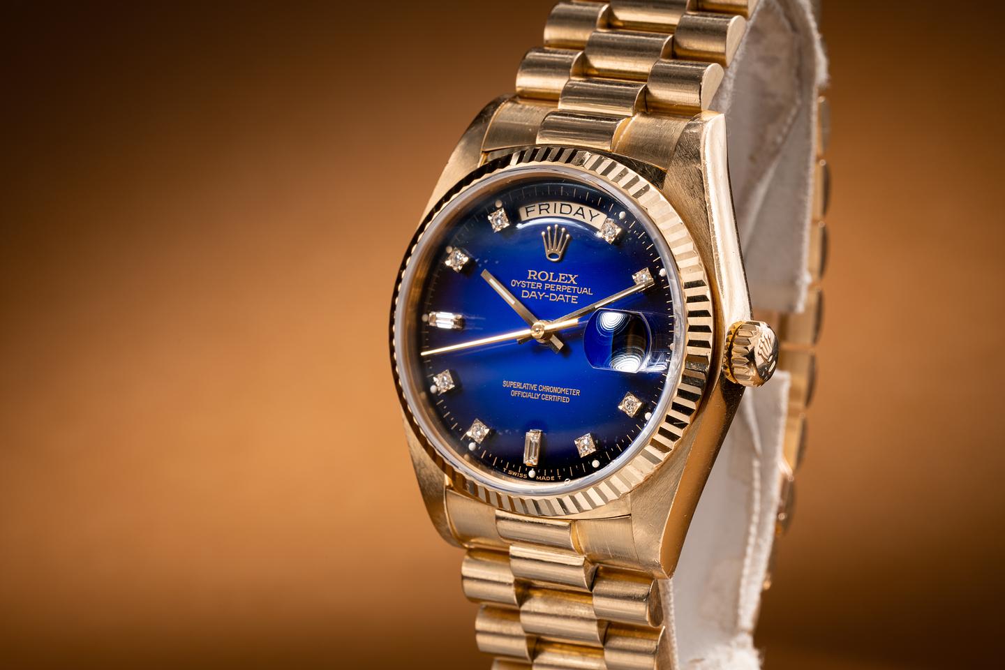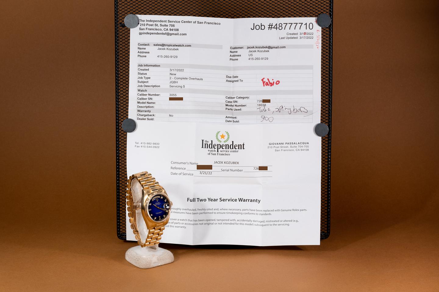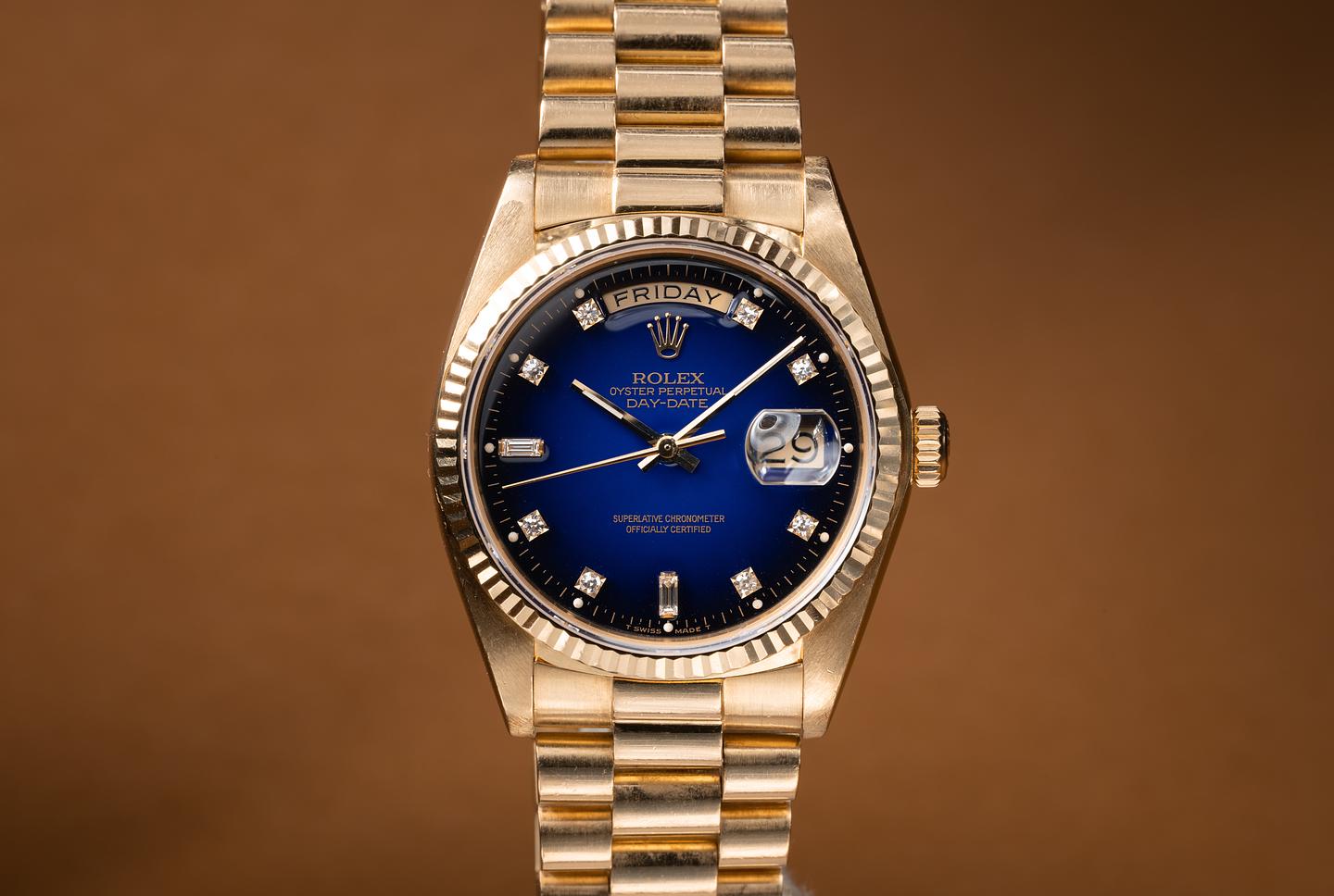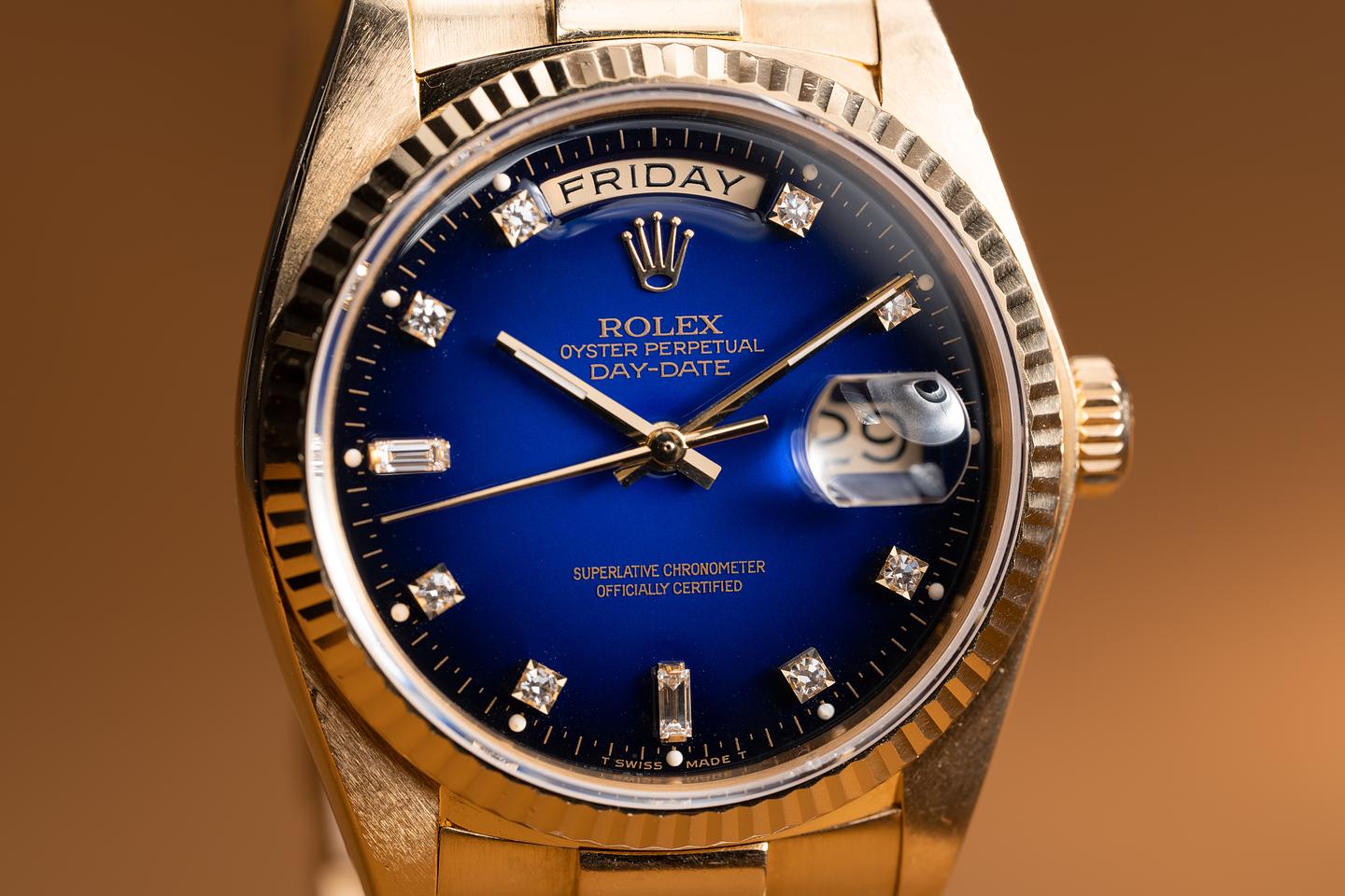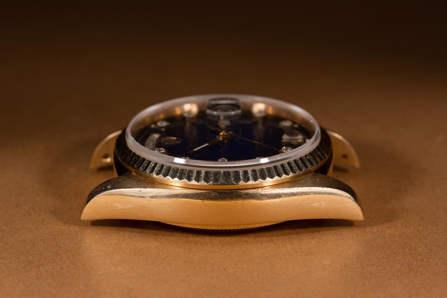 Bracelet: The 22 link 18k yellow gold president bracelet is excellent showing only light stretch for its age. The clasp is stamped with a matching 1982 date code.
