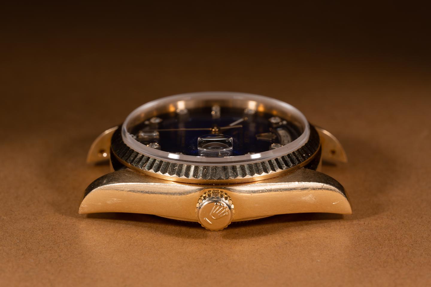 Case: The thick and even 18k gold case appears to be unpolished showing some light wear for its age. The sharp 18k yellow gold fluted bezel is also in excellent condition showing only light wear for its age.
